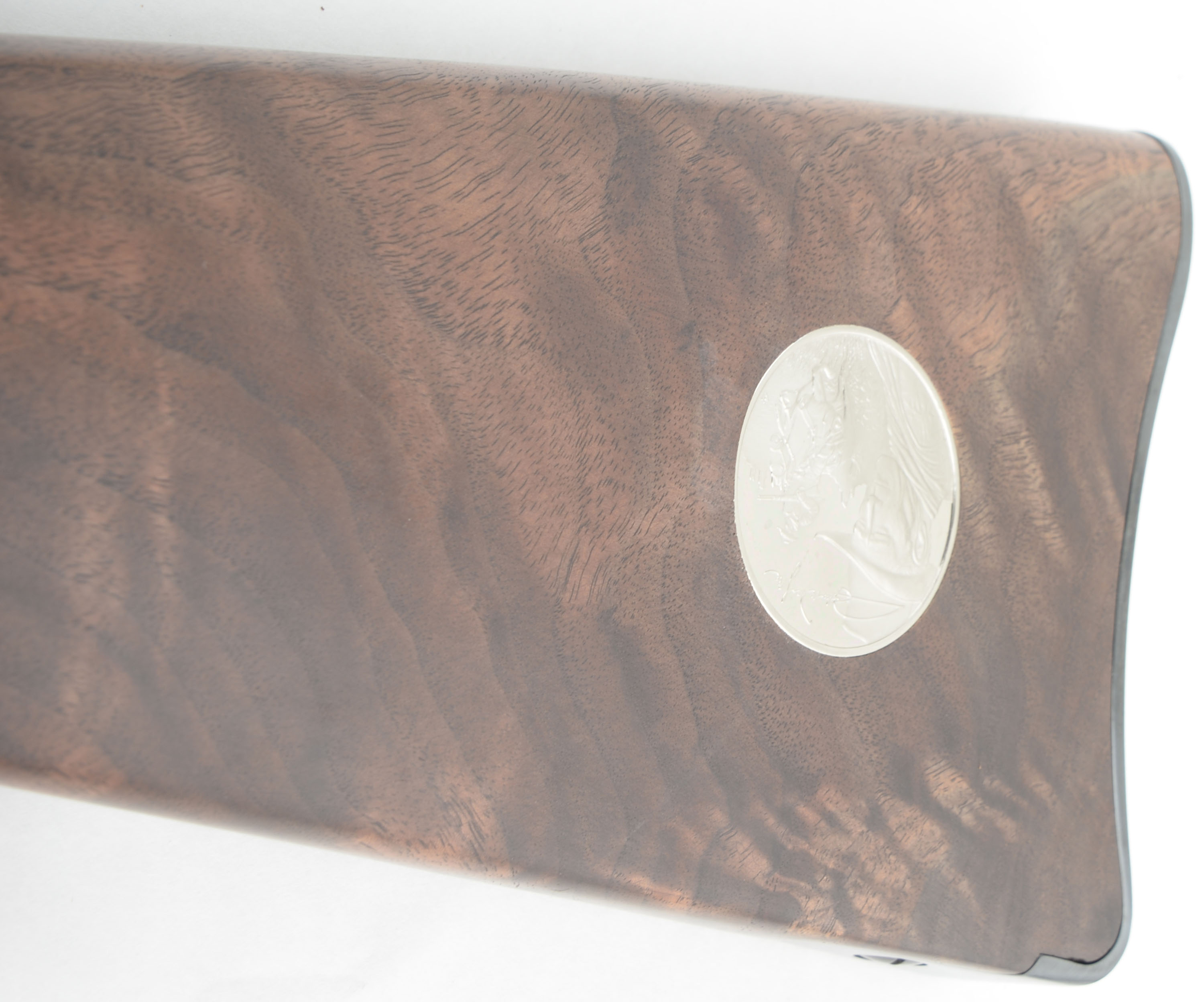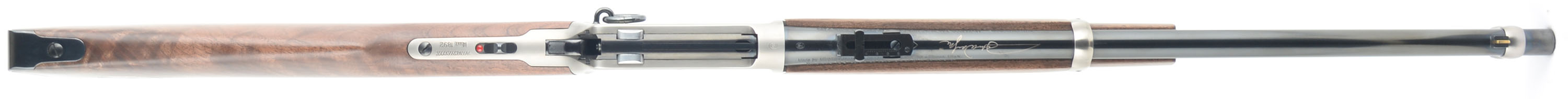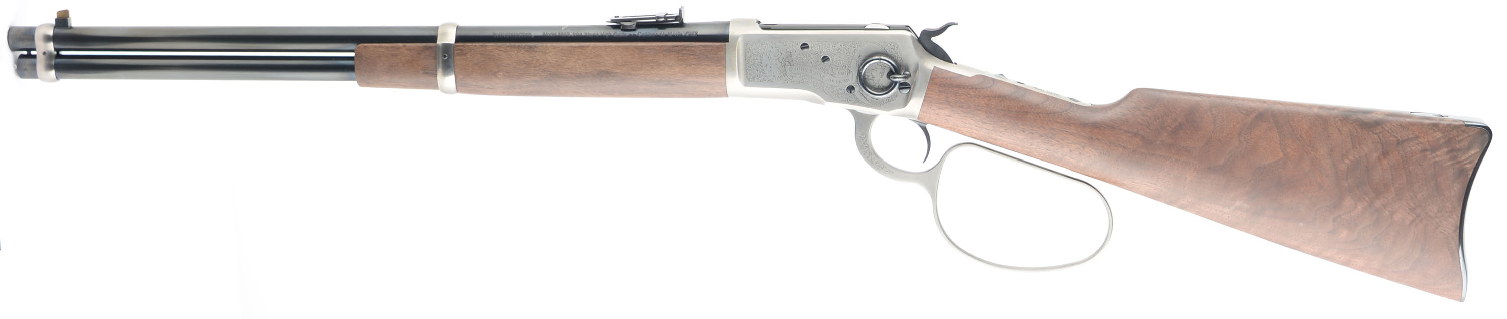 BOXED Winchester, Model John Wayne 100th Anniversary Custom Grade 1892 SRC, marked Cal. 44-40 WIN, MFG. 2007, SN: JW100H3460, Lever Action Rifle, 18 1/2'' Round barrel, Pre-64, The High Grade is a limited edition of only 4,000 rifles, each highly embellished with delicate scroll engraving & fond reminders of Duke. It celebrates the 100 year anniversary of his birth. The right side of the scroll engraved silver nickel nitride receiver features John Waynes portrait, his initials & a flowing banner with the words ''Courage, Strength, Grit.'' Left side of the scroll engraved silver nickel nitride receiver displays two portraits of John Wayne, along with a banner that reads ''John Wayne American, 1907-2007'', all richly accented by a deeply blued saddle ring, trigger & hammer. John Wayne's silvered signature graces the short 18 1/2'' barrel. The ladder style carbine rear sight is fully adjustable. Two silver nickel nitride barrel bands match the receiver. The deeply blued loading gate & action screws lend an extra touch of elegance. The straight black walnut stocks are original & excellent. The right side of stock carries a silver medallion with Duke images. The original metal finishes rate 100% overall. Bore is excellent. The barrel carries a rear carbine ladder sight & brass front blade. The large loop lever is designed for fast action. The stock carries the original carbine style buttplate. Original saddle ring & staple. Comes in the original factory box, with outer sleave, lock, hang tag & paperwork. An excellent, original condition special commemorative rifle. FFL or C&R Req. - Value: 1800 to 2500