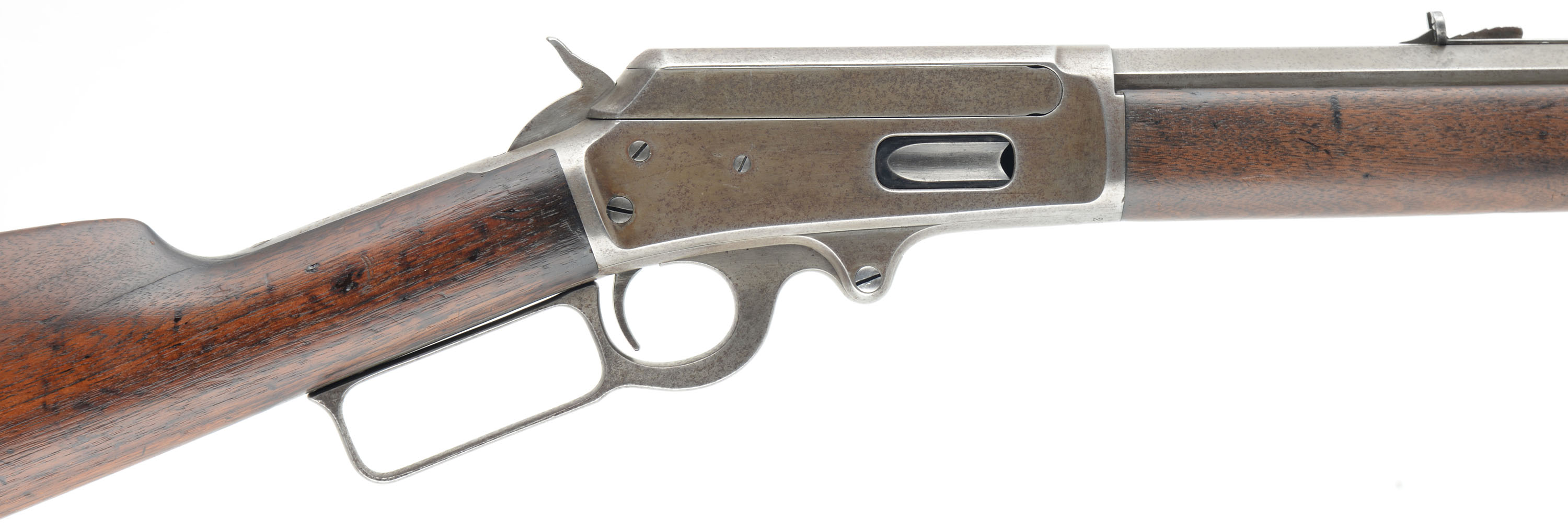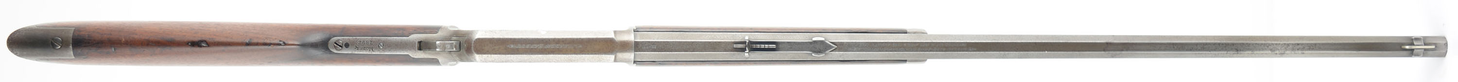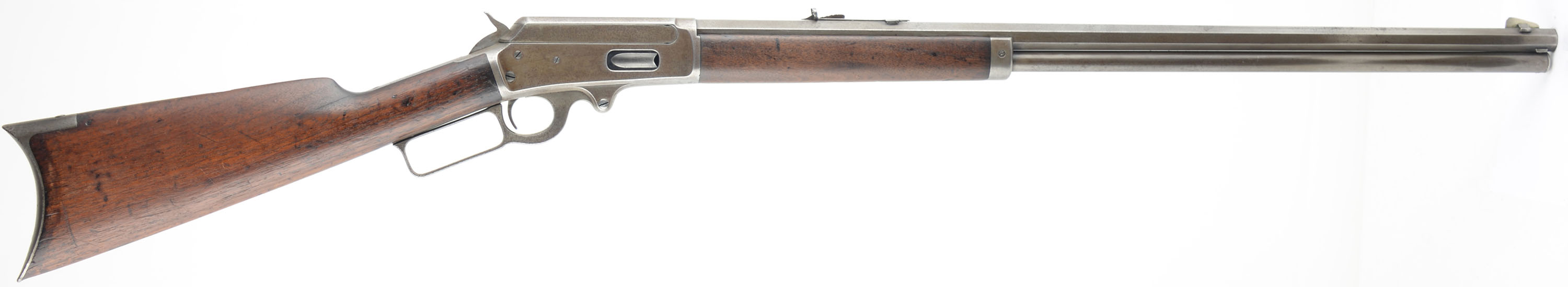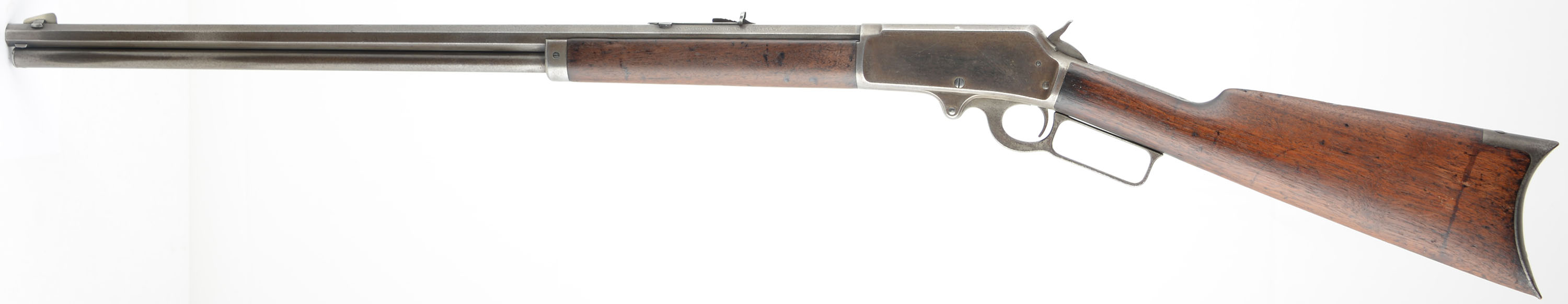 Marlin, Model 1893, .30-30, Cal. MFG. 1902, SN: 252265, Lever Action Rifle, 26'' Octagon barrel, Full mag. The wood stocks are very good & solid, having been previously lightly sanded & reoiled. There are numerous minor to small contusions, scratches & scrapes to both stock & forend. There is a 2'' tight stress crack emanating from the end of the upper tang. The metal finishes have worn gun metal gray, with a very thin brown patina. Bore is very good. The barrel carries an adjustable rear & a tall elongated blade front sights. Crescent metal buttplate. Tight smooth action. A well presenting old lever, that still has plenty of life remaining & collectors value. FFL or C&R Req. - Value: 800 to 1500