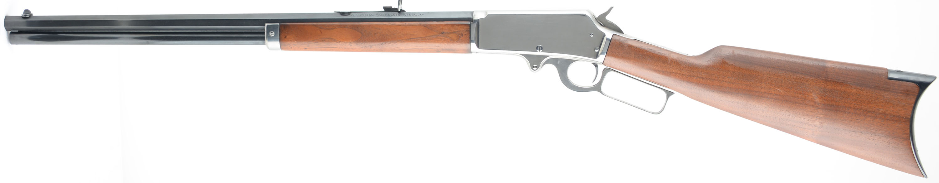 Marlin, Model 1893, .32-40, MFG. 1903, SN: 268568, Lever Action Rifle, 22'' Octagon barrel, Full mag. The wood stocks are excellent & solid, as being previously sanded & refinished. The stock may be a replacement as there are minor gaps at the end of the tangs & against the receiver at the wrist. There are very few minor handling marks remaining. The reblued metal finish on the barrel & mag tube rates 99%. The nickel on the receiver, lever, hammer & forend cap rates excellent. Bore is very good. The barrel carries a full buckhorn adjustable rear & Lyman small blade front sights. Crescent metal buttplate. Tight smooth action. A sharp looking, nicely refurbished old west collectible. FFL or C&R Req. - Value: 800 to 1500