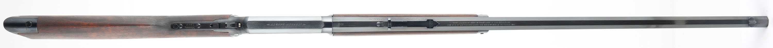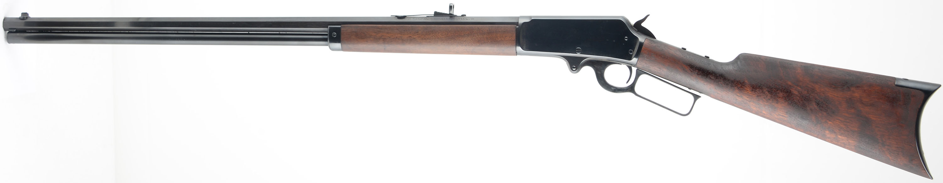 Marlin, Model 1893, .32-40, MFG. 1903, SN: 273729, Lever Action Rifle, 26'' Octagon barrel, Full mag. The wood stocks are excellent & solid, as being previously sanded & refinished. There are very few minor handling marks remaining & the stocks have a darkened aged appearance. There is a thin missing sliver of wood at the upper right corner of wrist. The reblued metal finishes rate 98%, with some light cleaned pitting scars remaining under blue. Bore is very good. The barrel carries a King full buckhorn adjustable rear & Lyman small blade front sights. Crescent metal buttplate. Tight smooth action. Another good looking refurbished old west rifle. FFL or C&R Req. - Value: 800 to 1500