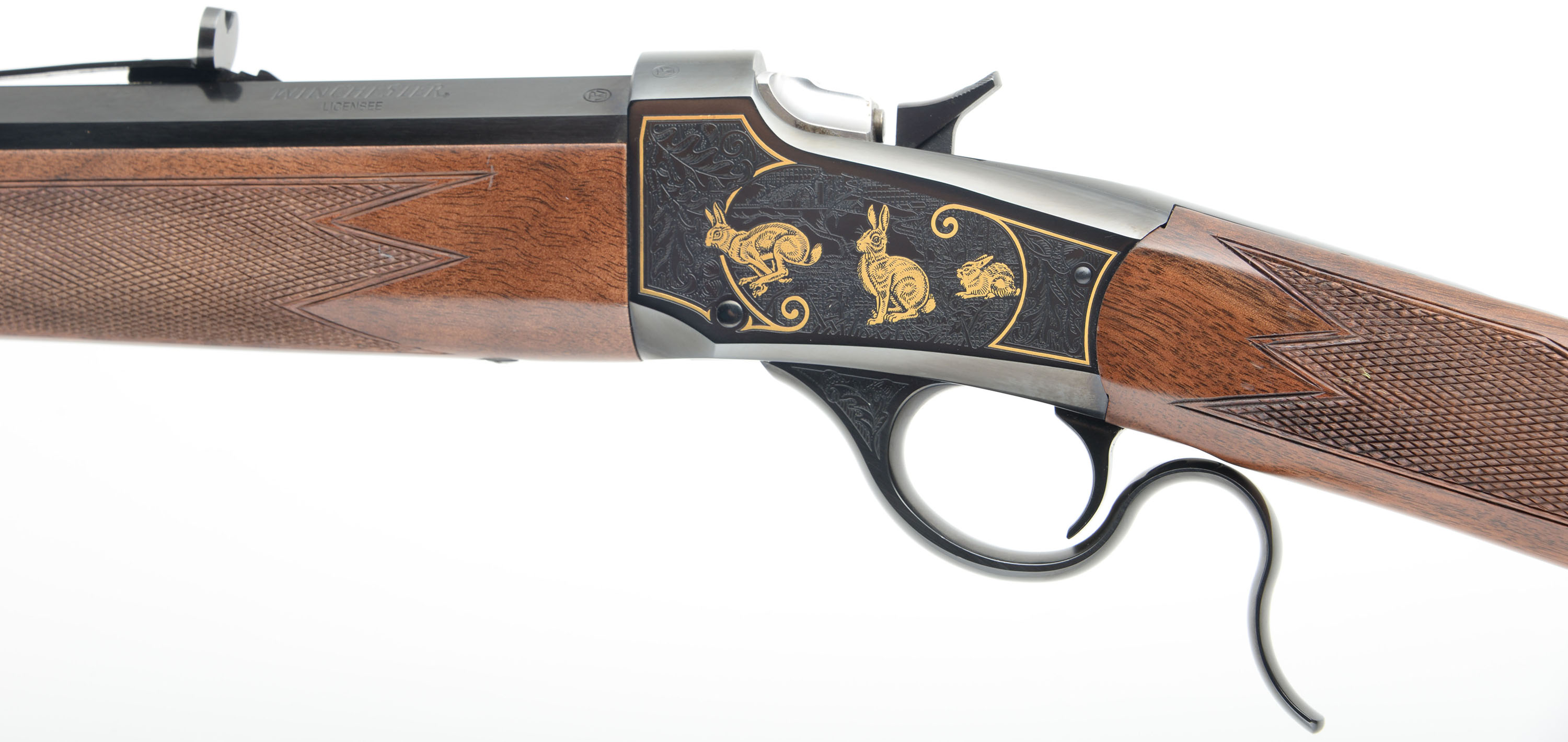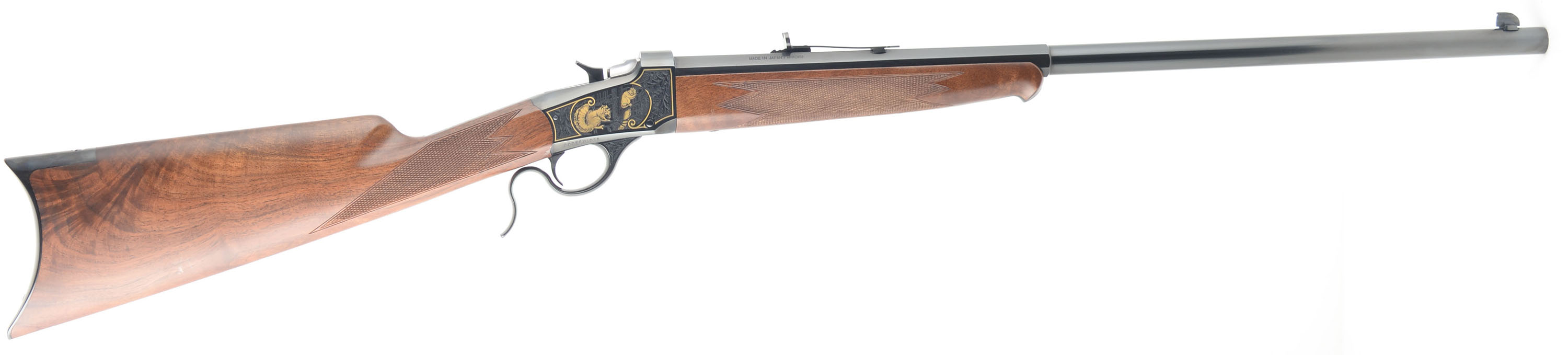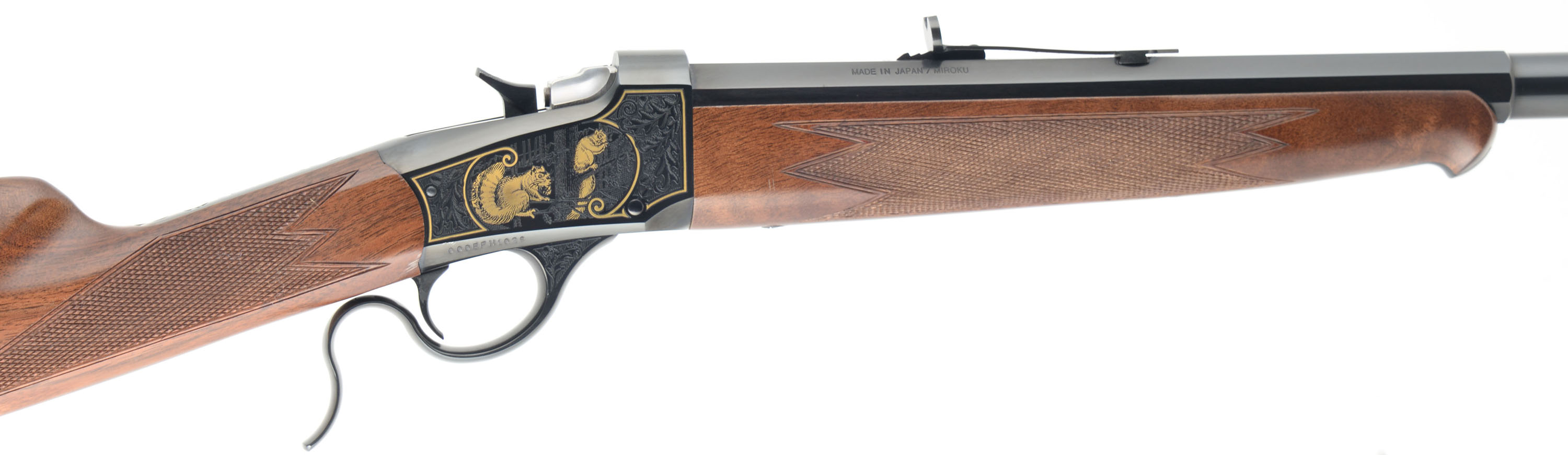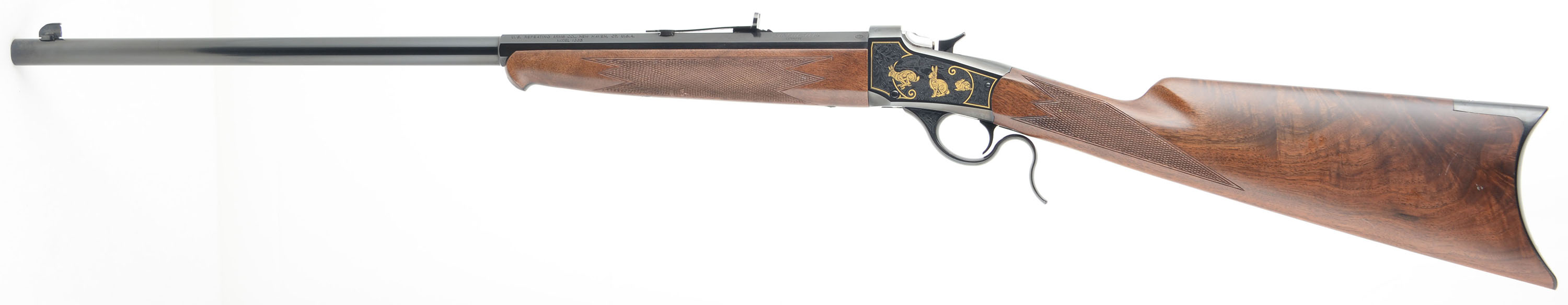 U.S. Repeating Arms Co., Winchester Licensee, Reproduction of a Winchester 1885 Sporting Rifle, .22 LR Cal., MFG. Modern, SN:000EFH1029, Lever Action Single Shot Rifle, 24 1/2'' Half octagon half round barrel. The deluxe factory select grain & checkered walnut stocks are excellent, with a few minor handling scuffs or contusions to the excellent original finish. Ebony tipped Schnabel forend. The receiver displays fine scroll & leaf machine engraving, with gold borders & gold figures of squirrels & rabbits amongst a wooded scenery. The original metal blue finish is 99% on barrel, receiver, lever & hammer. Bore is excellent. Fitted with the factory smooth crescent metal buttplate. Barrel carries the factory adjustable rear & large blade front sight. An excellent, original & collectible throwback rifle. FFL Req. - Value: 1000 to 1750