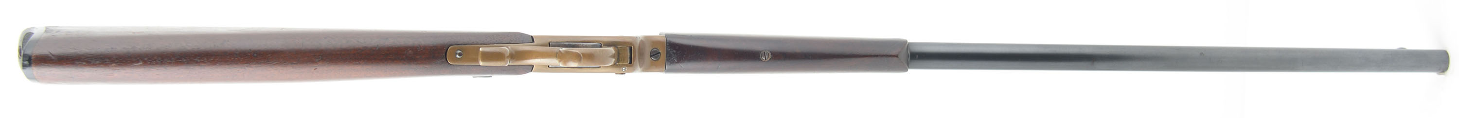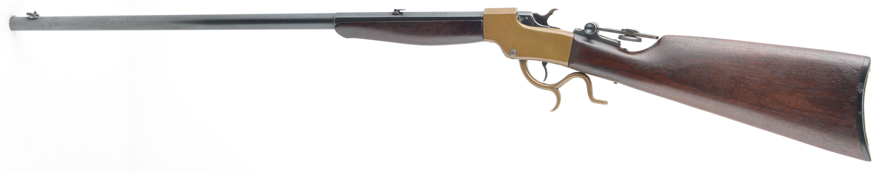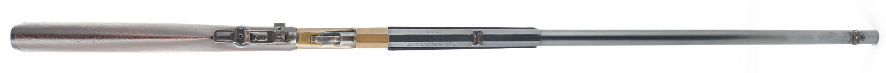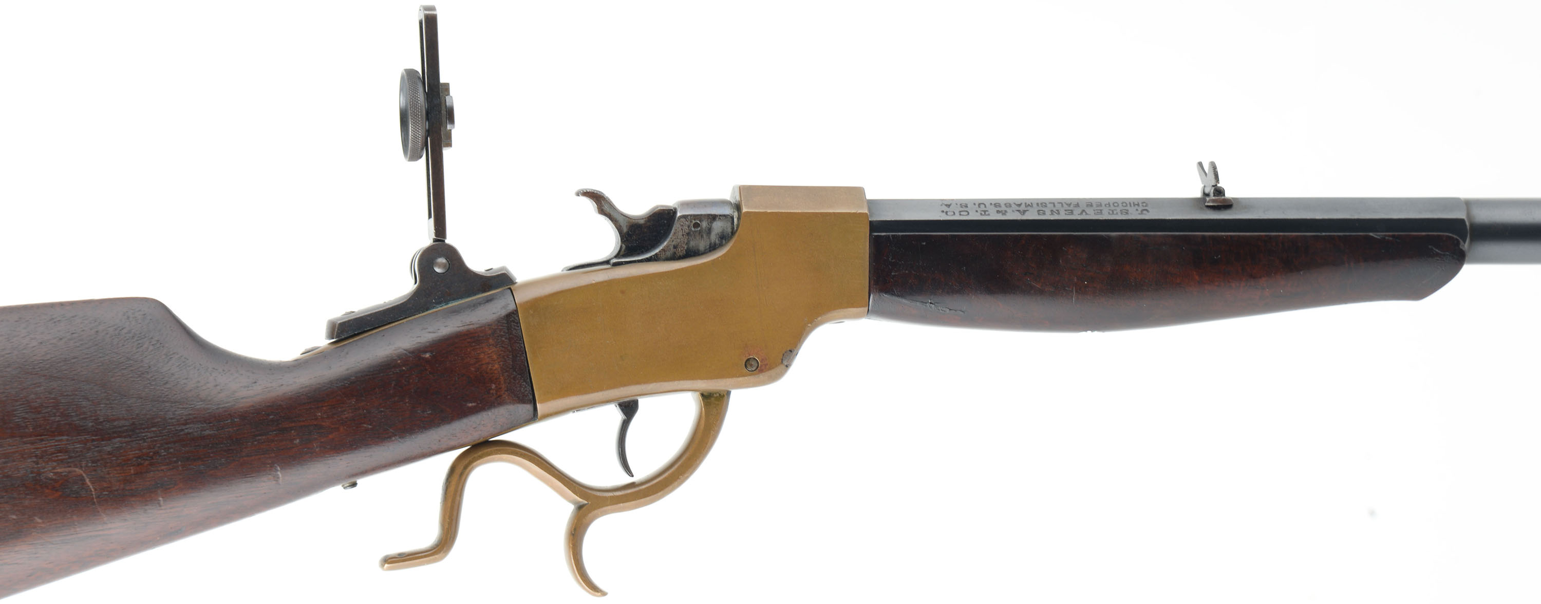 RARE J. Stevens A&T Co, Model ''Unitary'' Prototype Favorite, CAL: 25RF, MFG: Antique, SN: NVSN, Falling Block Lever Action Rifle, 23'' Octagon/round barrel. This prototype rifle was built by long time stevens employee Bill Goyette, & features a unique action that drops the entire firing group as a unit on lever action. The straight grip wood stocks are excellent & solid. They appear to carry the original finish, with a few minor scratches, contusions & scrapes. The metal blue finish on the barrel rates 95%. The brass receiver & spur lever have developed a beautiful spicy mustard brown patina. Bore is excellent & bright. The receiver is fitted with a flip-up, Stevens tang sight with Hadley eye cup. The barrel carries a single leaf fold rear sight & a ivory bead folding globe sight. The bottom flat of the barrel is stamped with the # ''14'' under the forearm, while the # 21 is stamped on the bottom of the barrel in front of the forearm. The stock carries a checkered plastic buttplate. This is a fantastic example of a unique & rare prototype & part of the history of the Stevens Favorite. Antique No FFL Req - Value: 2000 to 3000