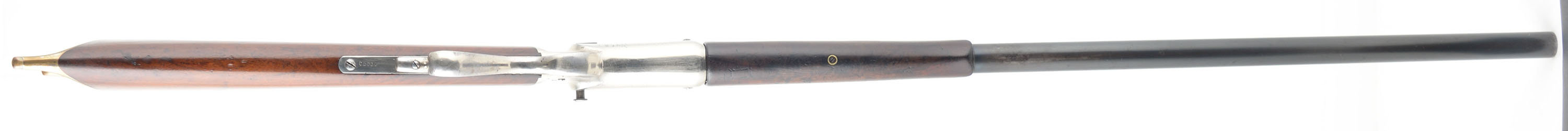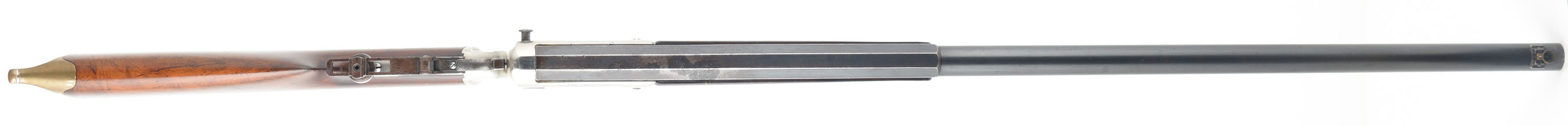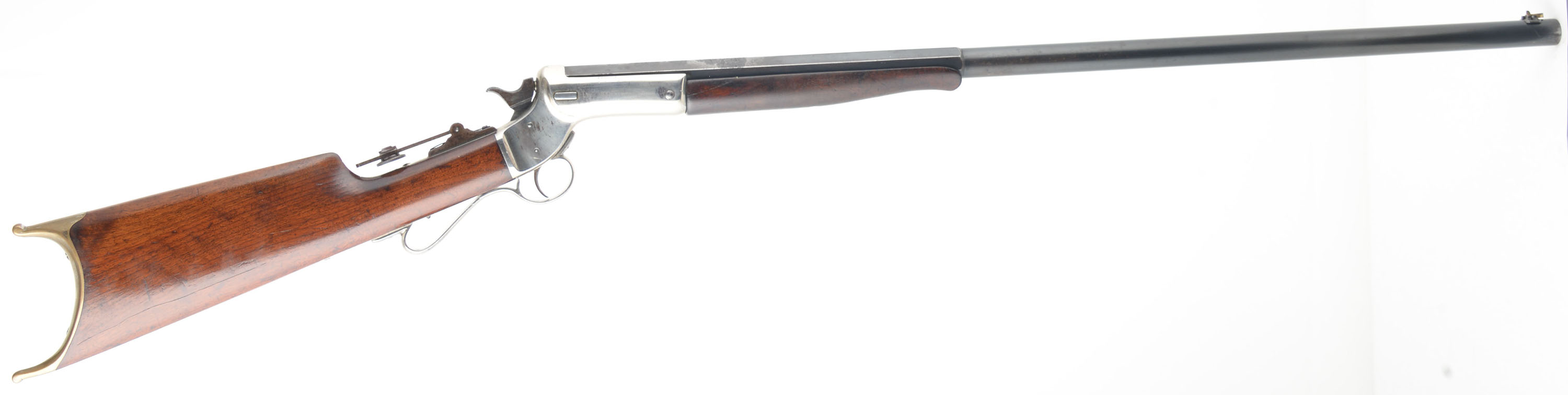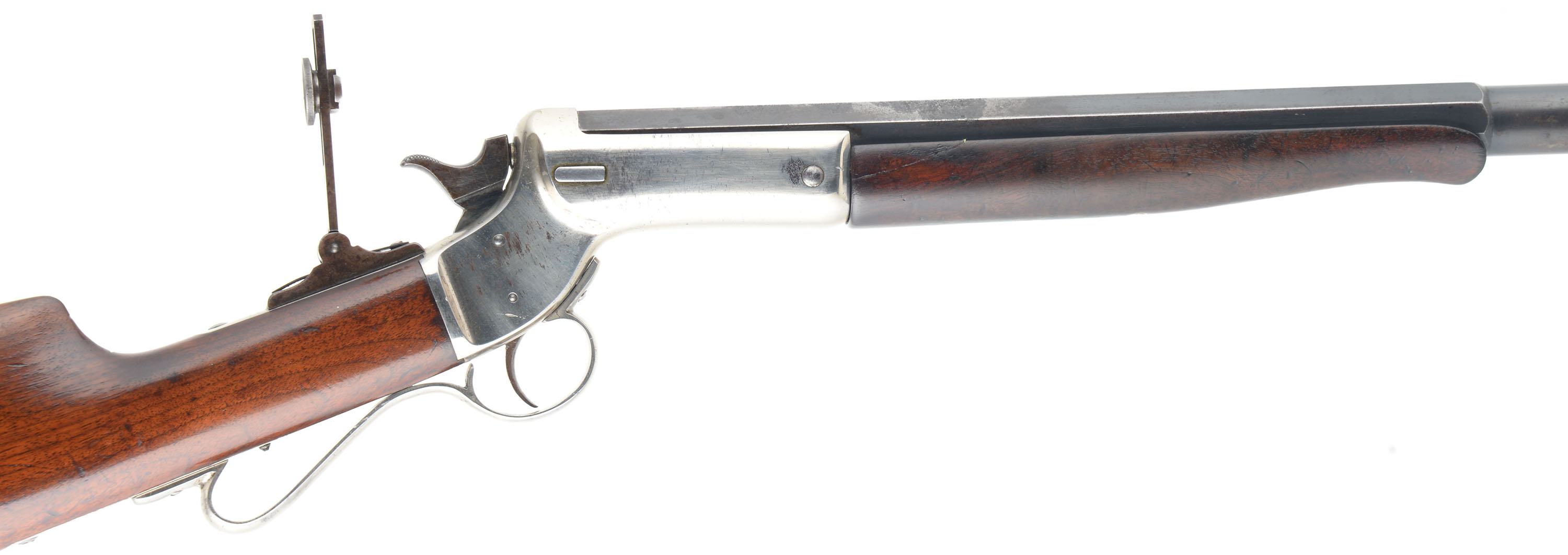 J. Stevens A. & T. Co., Model No. 9 Tip-Up New Model Range Rifle, Cal: 32-35, MFG: 1886 - early 90's, SN: 27974, Single shot, tip open, 30'' Octagon to round barrel, Stevens marketed the Model no. 9 as ''The most accurate of the Tip-up rifles''. The original straight grip wood stocks are excellent, with some light scratches, scrapes & dings to the excellent finish. There is a 2'' glue repaired corner break to the back right side of the forend. Left side of barrel is marked ''J. STEVENS A. & T. CO. CHICOPEE FALLS.MASS. S.A. PAT.SEPT.6.1864''. The metal blue finish to the barrel rates 70%, with much of the loss on the breech end due to several areas of cleaned pitting & areas of thinning toning to a brown patina. The nickel finished receiver & rates very good retaining the majority of the nickel. The receiver is fitted with a large sliding disk flip-up Vernier tang sight, while the barrel carries a folding globe front sight. Bore is very good, with roughness amongst strong rifling. Stock carries a nickeled brass Schuetzen buttplate, retaining remnants of original nickel. An excellent example of the early Stevens tip-up rifle. Antique, No FFL Req - Value: 600 to 1200