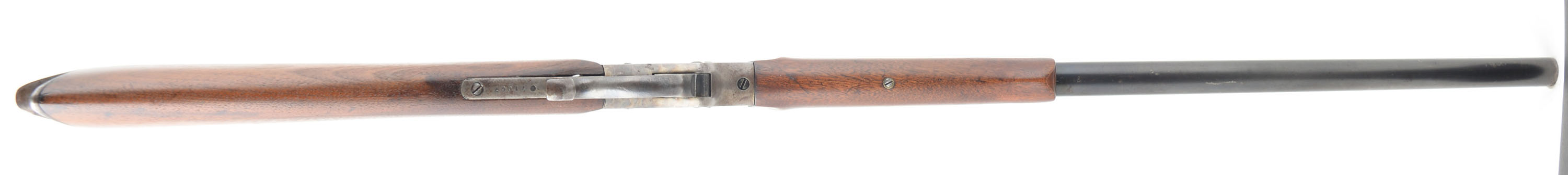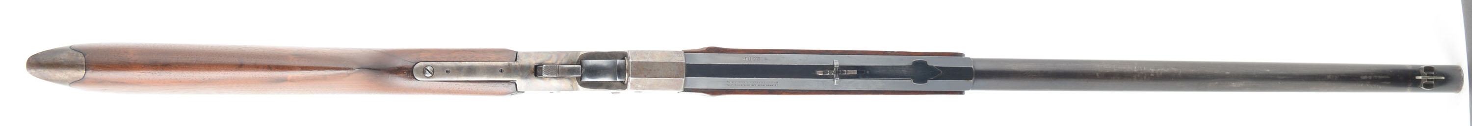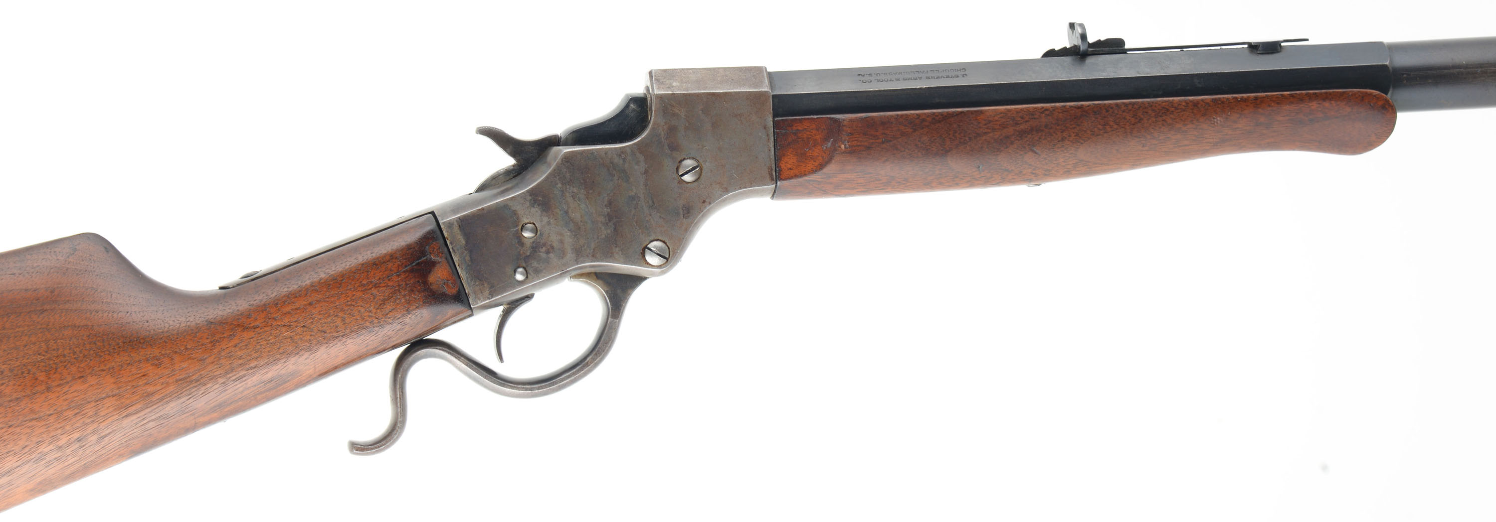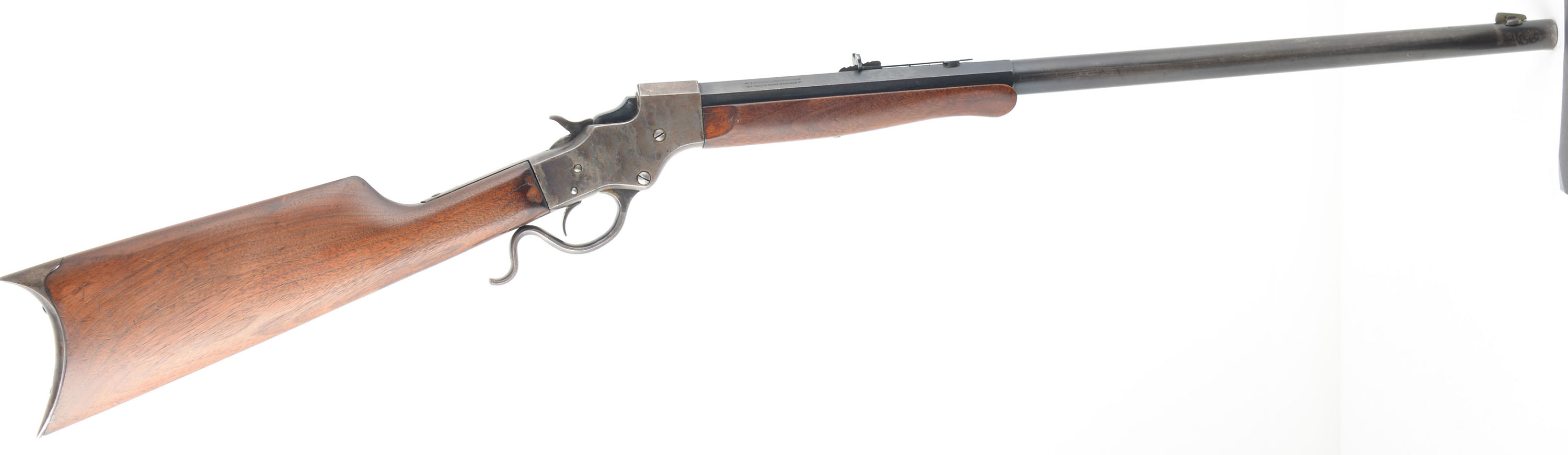 J. Stevens A. & T. Co., Model No. 44, Cal: 25 RF, MFG: 1894 - 1933, SN: 71007, Single Shot Rolling Block, 24'' Octagon to round barrel. The original straight grip wood stocks are very good, as lightly sanded & refinished. There are very few light scratches or handling marks to the current finish. There is a fill repair at the forward right side of the wrist & a few glue repaired hairline cracks to the forend. The right side of barrel is stamped ''J. STEVENS ARMS. & TOOL. CO. CHICOPEE FALLS.MASS. USA.'', while the left side is stamped ''25-RF''. The SN is stamped on both the lower tang & the barrel. The original metal blue finish to the barrel rates 60%, with most of the loss found on the muzzle half, with some brush lines & chatter marks. The case-colored receiver displays muted case-colors. The barrel carries an adjustable rear & Rocky Mountain front sights. Bore is very good, with roughness amongst strong rifling. Stock carries a crescent metal buttplate. A nice looking Stevens 44 rifle. FFL or C&R Req - Value: 400 to 800