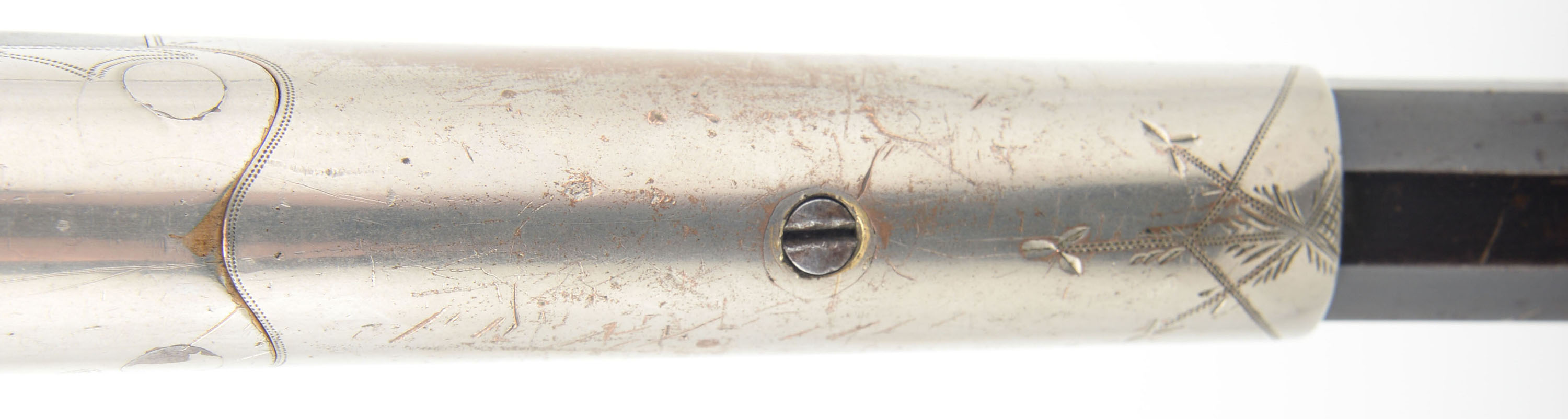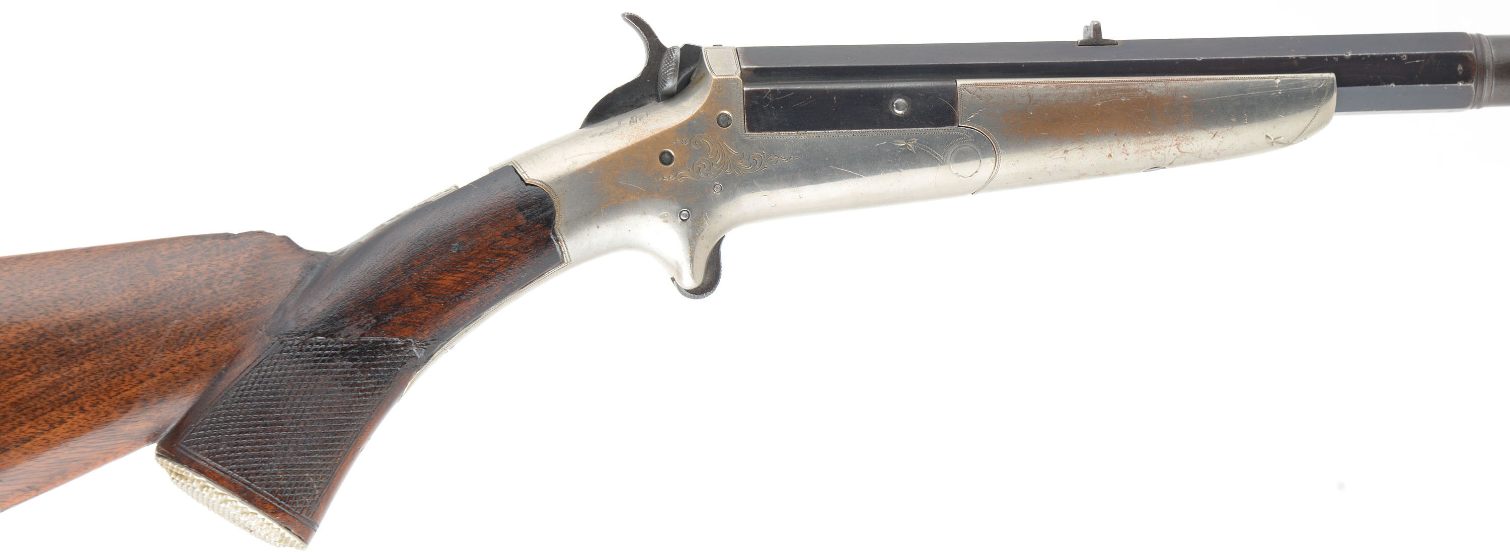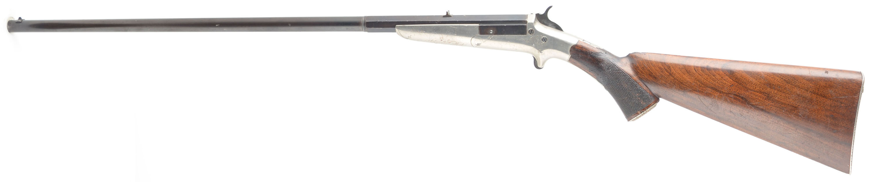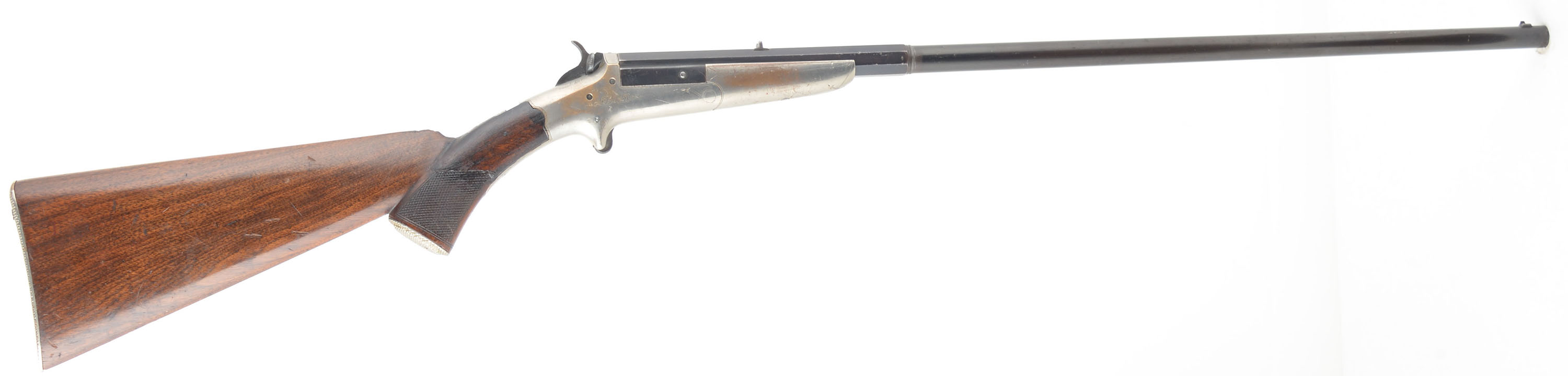 RARE C.B. Holden, Model Type 6th Two Trigger Rifle, Cal: 32 RF, MFG: 1876-80's, SN: None, Single Tip-up Action, 23 3/4'' Octagon to round barrel. These rifle were produced in Worchester Massachusetts starting in 1876, with an estimated few hundred of the small frame spur trigger type being produced & assembled over the years of assembly, possibly as late as 1890. The majority were produced in .22 caliber rimfire, with very limited production of larger calibers, thus making this .32 rimfire example even rarer version of the rifle. The original checkered & metal capped pistol grip walnut stock is good, having been previously cracked or broken at the wrist & fairly well & solidly repaired. There are minor scratches, scrapes & contusions to the wood & finish. The portion of the stock behind the wrist appears to carry the original finish. The original metal blue finish on the barrel has toned a plum blue, with areas of thinning toning to a brown patina. Nickeled brass receiver & foregrip have some accent & border hand engraving, with some rub thinning to the original nickel. The top of barrel is stamped '' C.B. HOLDEN MAKER, WORCESTER MASS''. The upper tang has an open dovetail tang sight provision, while the barrel has a fixed rear & small blade front sights. Bore is fair, with roughness amongst thinning rifling. Lever by the hammer releases the action. Stock carries the original nickeled & checkered metal buttplate. A very nice presenting example of a very scare antique tip-up rifle. Antique, No FFL Req. - Value: 1000 to 2000