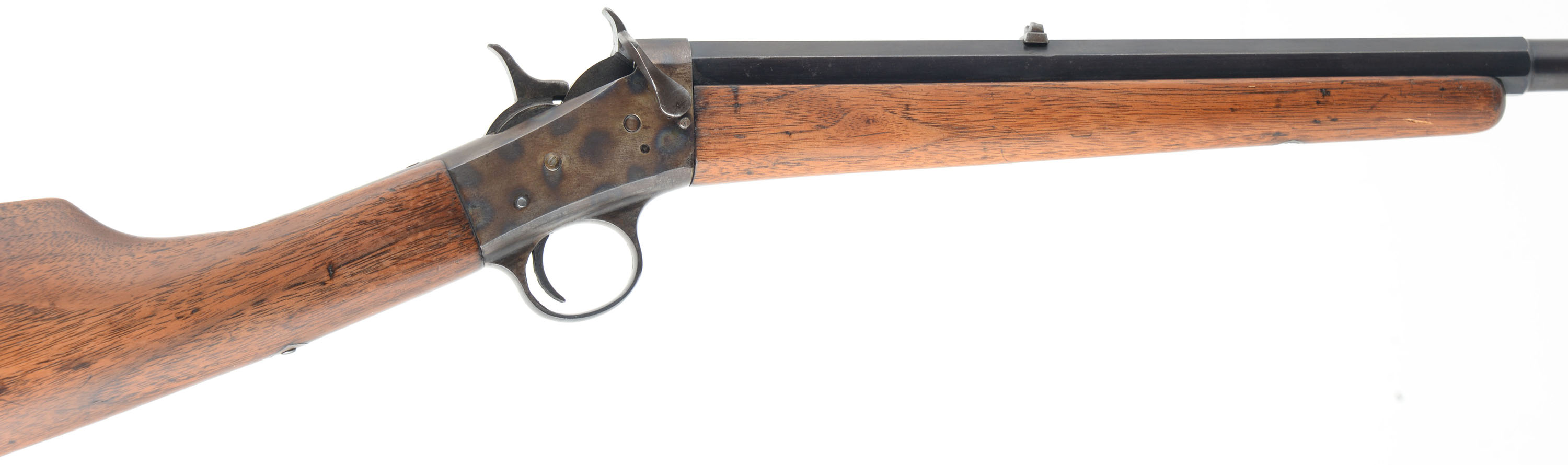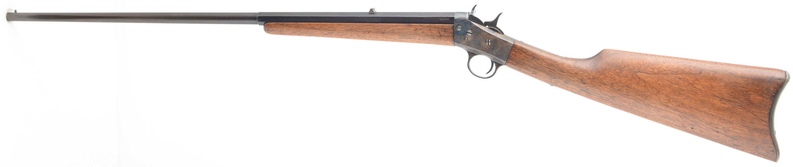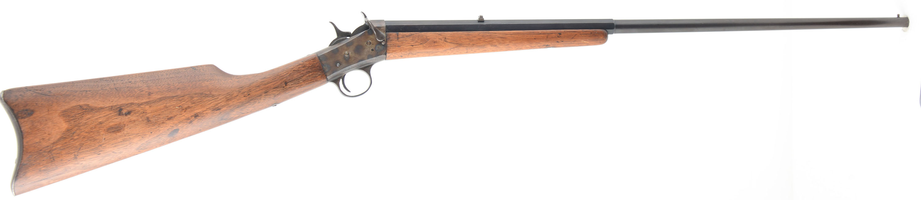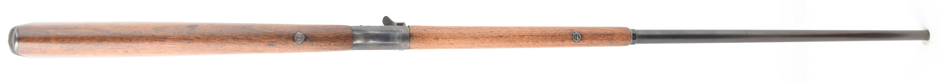 CUSTOM Remington, Model 4 Take-down SMOOTHBORE, .32 R.F., MFG 1902-24, SN: 164908, Rolling block single shot rifle. 24'' Octagon to round barrel. The model 4 was produced from 1890 to 1933 in several variation & evolutions. The model 4 began production in 1890 as a screw in fixed barrel, but it was change to a take-down with lever in 1902 until 24 when it was changed again to a take-down screw. The rifle with the take-down screw was produced from 1924 to 33. This mid production lever take-down variation was altered into a smoothbore & has an old refinish, likely done by Axel Peterson, as it is stamped ''A.W. PETERSON DENVER COLO.'' The straight grip wood stocks are very good & solid, having been lightly sanded & refinished. There remains remnants of old use marks & some oil dark spots remaining. The metal blue on the barrel is older refinish is starting to tone a bit plum, with coverage rating 80% overall. The top of the receiver has been machine flattened & there are other a couple other areas showing evidence of filing or polishing & then heat torch treated. The smooth bore is excellent. Barrel carries a fixed dovetail rear & bead front sights. The stock carries a smooth metal Remington buttplate. FFL or C&R Req. - Value: 400 to 800