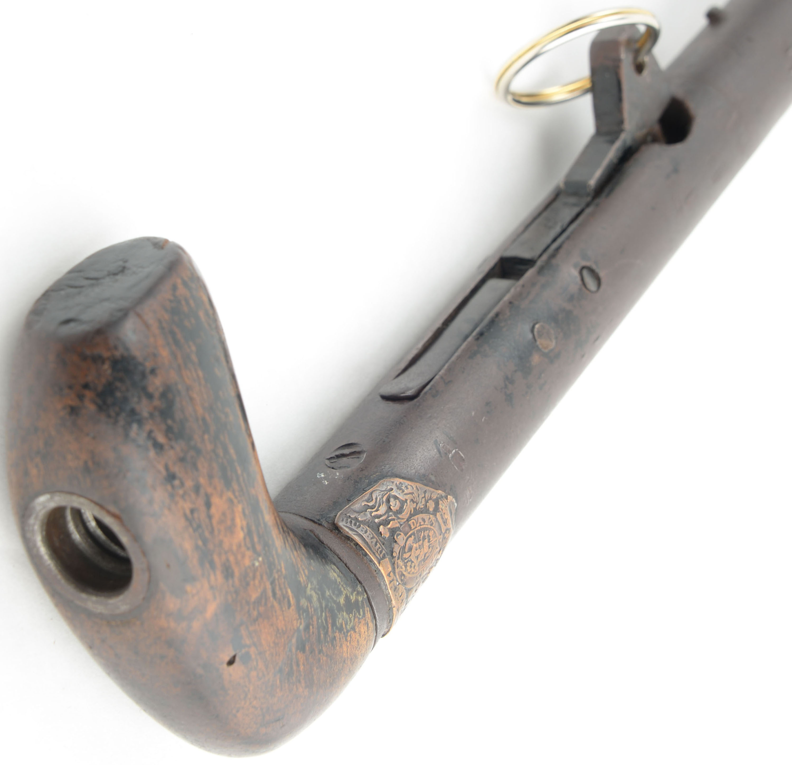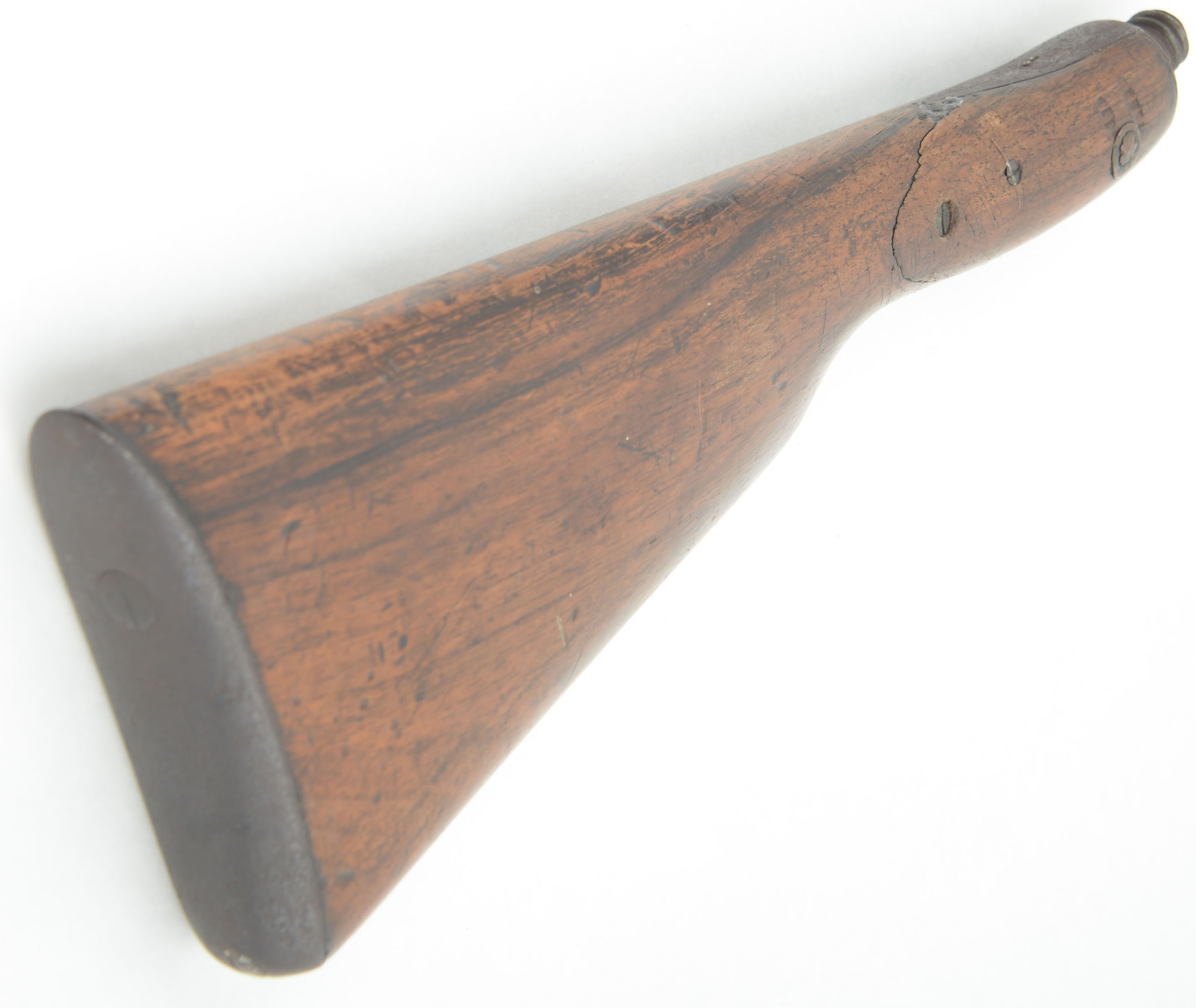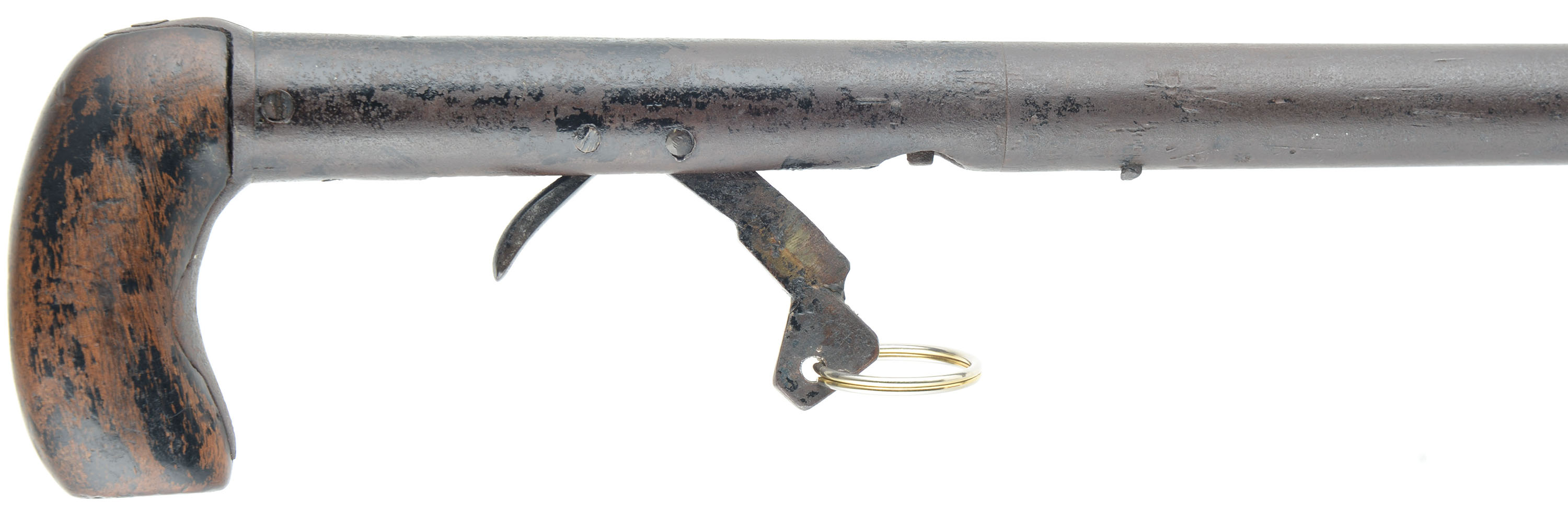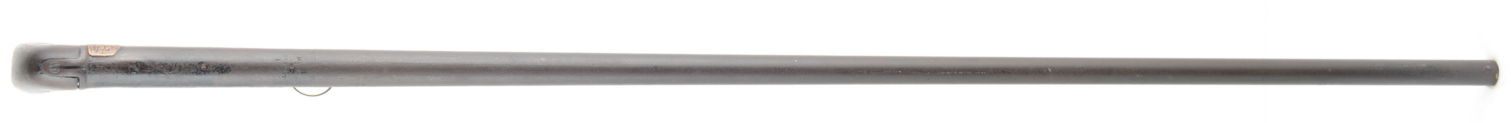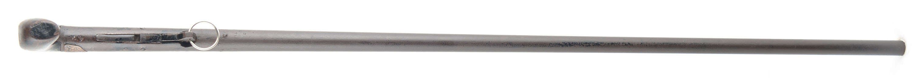 RARE J.P. Hubbard-London Day's Patent Can Gun, 50 cal, Circa 1827-35. No SN, Percussion, 28 1/4'' Barrel length. 34 3/4'' overall cane length, plus 11'' if mounted with screw on shoulder stock. The handle measuring 3 1/4'' long. The ''J.P. Hubbard-London Day's Patent Can Gun'' is a walking stick firearm, also known as a cane gun, that was popular in Britain during the first half of the 19th century. It utilized a ''Day's Patent'' ignition system, patented by John Day around 1823. This system was incorporated into various types of firearms including these types of cane gun. This example was manufactured by J.P. Hubbard, at his London address. Disguised as simple a walking canes, these were primarily marketed to urban gentleman for personal protection, but also to farmers & thus the screw on buttstock. These were muzzle-loading, percussion firearms with iron barrel, under hammer & trigger system, with curved walnut one piece grip handle. The under hammer design was likely used to keep the powder dry. The cane gun carries a medallion on the back left side of the barrel, which features an embossed coat of arms, with a lion & unicorn, & marked ''(J.)P. Hubbard 26 Newgales - Days Patent''. The trigger & hammer system extend from the barrel when the ring is pulled, engaging the tension spring. Once the trigger is pulled, the hammer drops onto a percussion cap previously affixed to the nipple. Mechanism appears to function properly, although the ring is a modern replacement. The piece shows a chocolate brown patina, with some spotty remnants of black finish on both the barrel & the walnut handle. The stock suffered a wrist break & has been glue repaired & further strengthen with screws & rivets. Stock carries the original metal buttplate. An authentic survivor of a bygone era, which is extremely rare, especially with the original accompanying stock. Antique, No FFL Req. - Value: 1000 to 2600