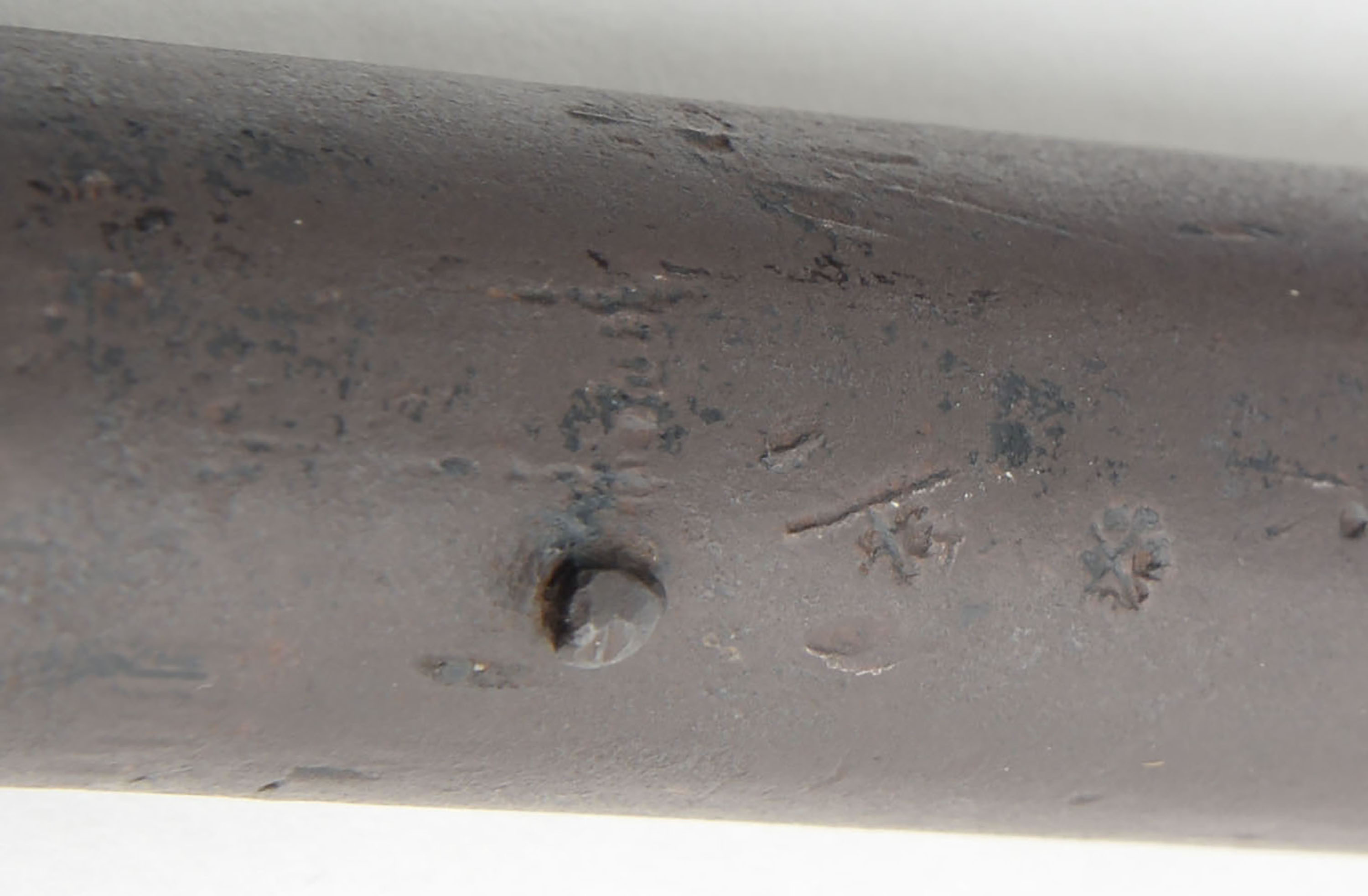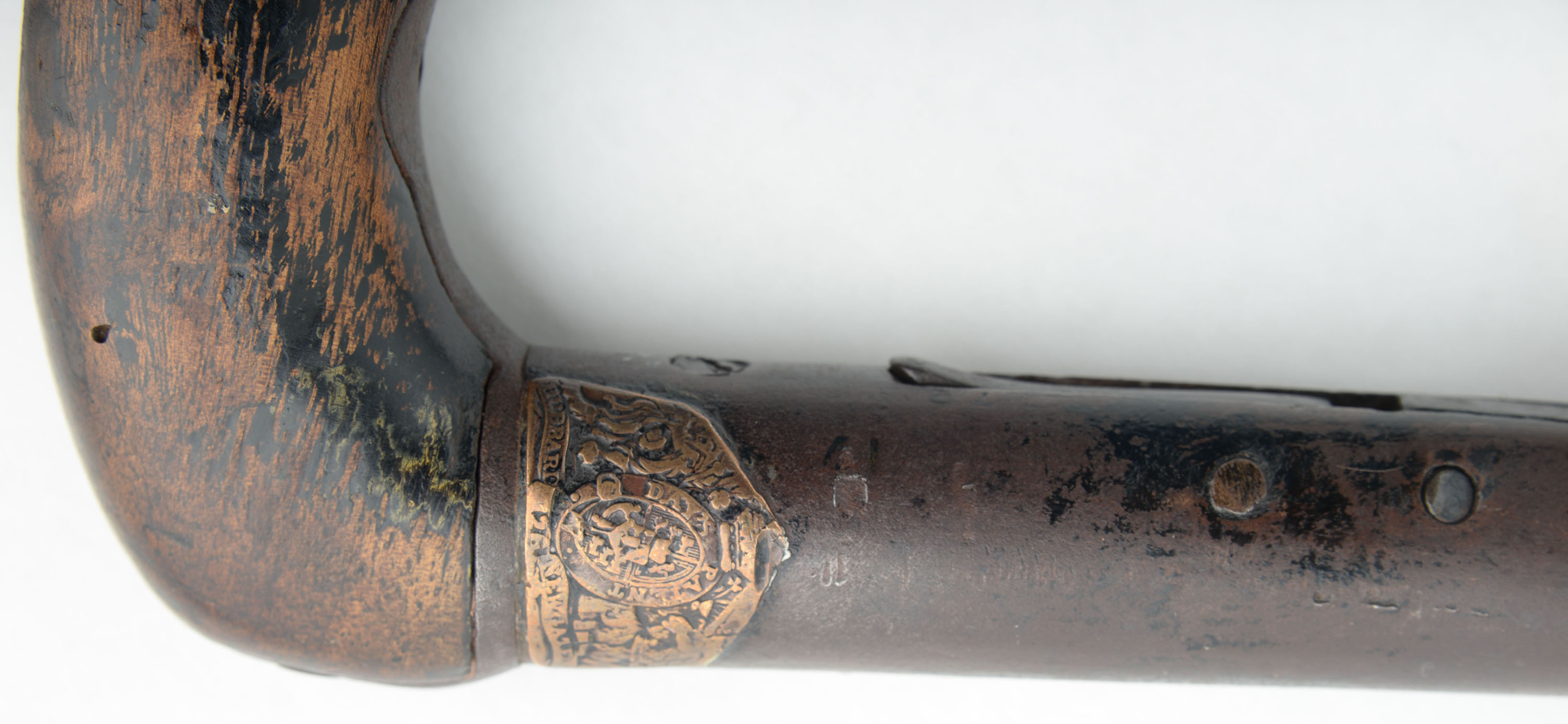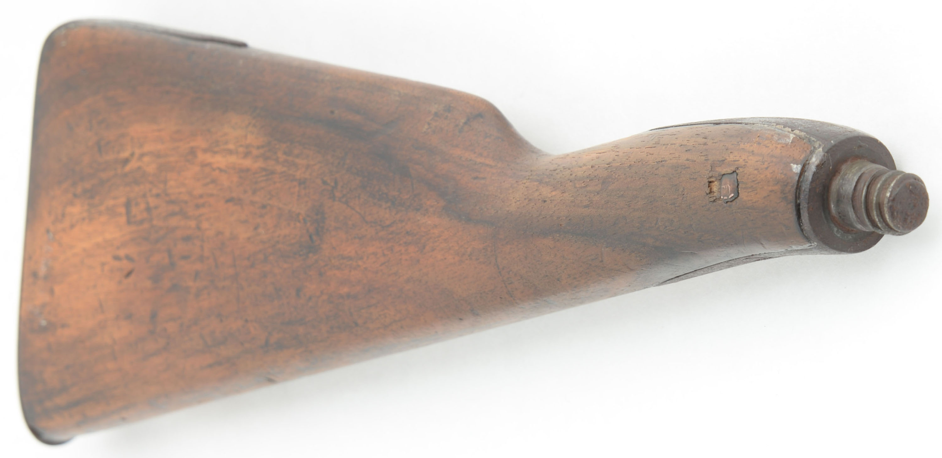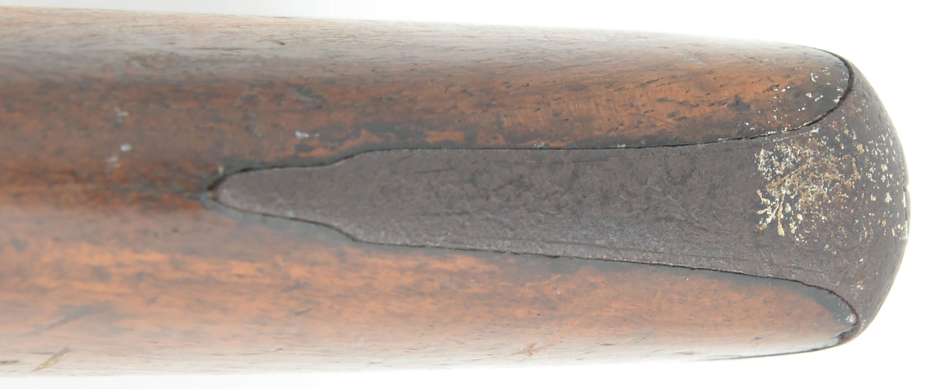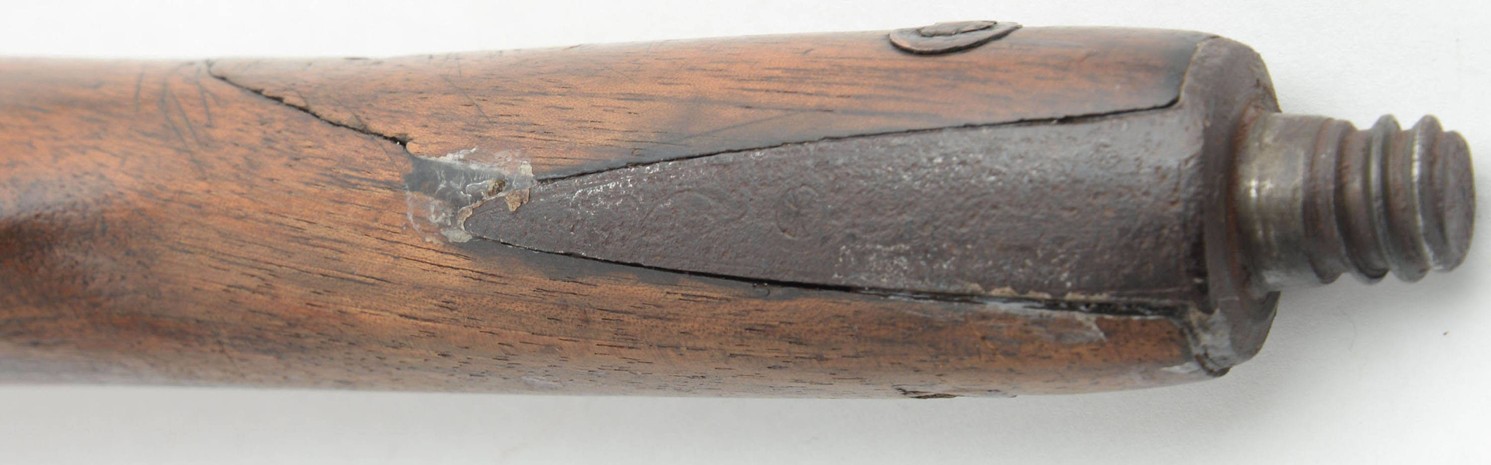 RARE J.P. Hubbard-London Day's Patent Can Gun, 50 cal, Circa 1827-35. No SN, Percussion, 28 1/4'' Barrel length. 34 3/4'' overall cane length, plus 11'' if mounted with screw on shoulder stock. The handle measuring 3 1/4'' long. The ''J.P. Hubbard-London Day's Patent Can Gun'' is a walking stick firearm, also known as a cane gun, that was popular in Britain during the first half of the 19th century. It utilized a ''Day's Patent'' ignition system, patented by John Day around 1823. This system was incorporated into various types of firearms including these types of cane gun. This example was manufactured by J.P. Hubbard, at his London address. Disguised as simple a walking canes, these were primarily marketed to urban gentleman for personal protection, but also to farmers & thus the screw on buttstock. These were muzzle-loading, percussion firearms with iron barrel, under hammer & trigger system, with curved walnut one piece grip handle. The under hammer design was likely used to keep the powder dry. The cane gun carries a medallion on the back left side of the barrel, which features an embossed coat of arms, with a lion & unicorn, & marked ''(J.)P. Hubbard 26 Newgales - Days Patent''. The trigger & hammer system extend from the barrel when the ring is pulled, engaging the tension spring. Once the trigger is pulled, the hammer drops onto a percussion cap previously affixed to the nipple. Mechanism appears to function properly, although the ring is a modern replacement. The piece shows a chocolate brown patina, with some spotty remnants of black finish on both the barrel & the walnut handle. The stock suffered a wrist break & has been glue repaired & further strengthen with screws & rivets. Stock carries the original metal buttplate. An authentic survivor of a bygone era, which is extremely rare, especially with the original accompanying stock. Antique, No FFL Req. - Value: 1000 to 2600