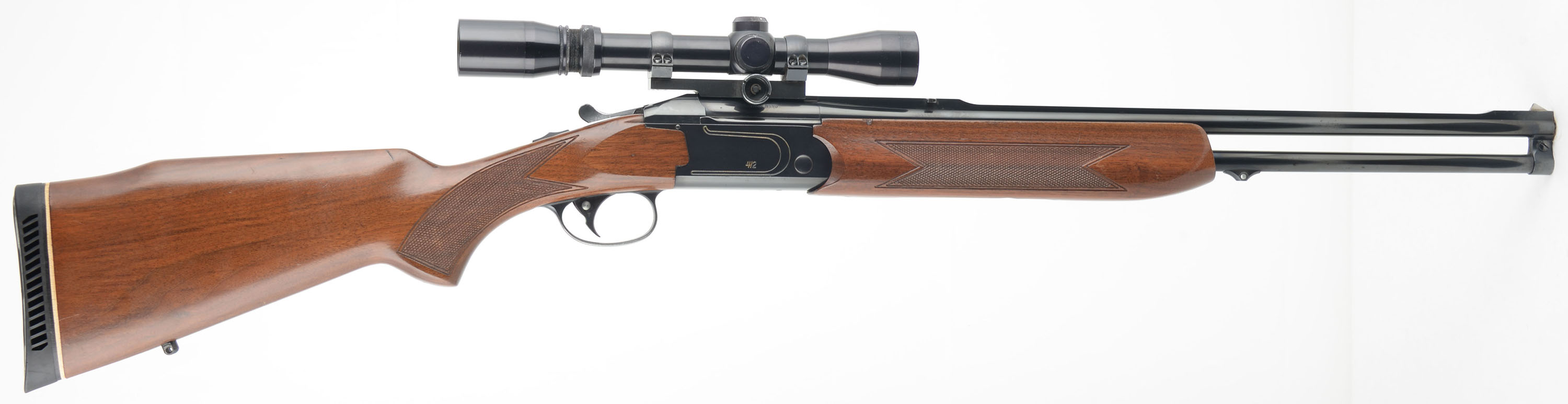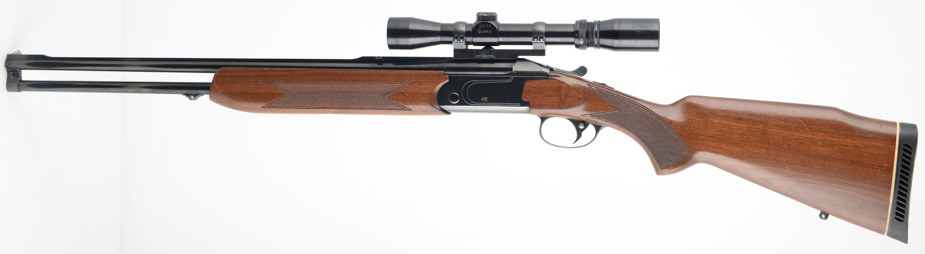 Valmet, Model 412 Double Rifle, CAL: 300 Win Mag, MFG: Modern, SN: 219657, Break Action O/U Double Rifle, 23 1/8'' barrels. This rifle is apparently started as a 30-06, but was gunsmith rechambered to 300 Win Mag, with the current caliber marked on the left side of lower barrel inside the receiver. The original checkered & flat pistol grip Monte Carlo style stock is excellent, with minor scratches, rubs & contusions to the excellent original finish. The original metal blue finish rates 90% overall, with most of the loss found on the belly edges & left side of receiver. The receiver has gold tone fill accenting the lettering & receiver embellishments. Bores are excellent. The receiver is mounted with a Burris 2X-7x scope, while the barrel's solid rib holds a folding rear sight & triangle blade front sight. The stock carries the original Valmet ventilated recoil pad. Sling mounting provisions & comes with a very nice padded sling. A high condition & quality Finnish made double rifle. FFL Req. - Value: 800 to 1500