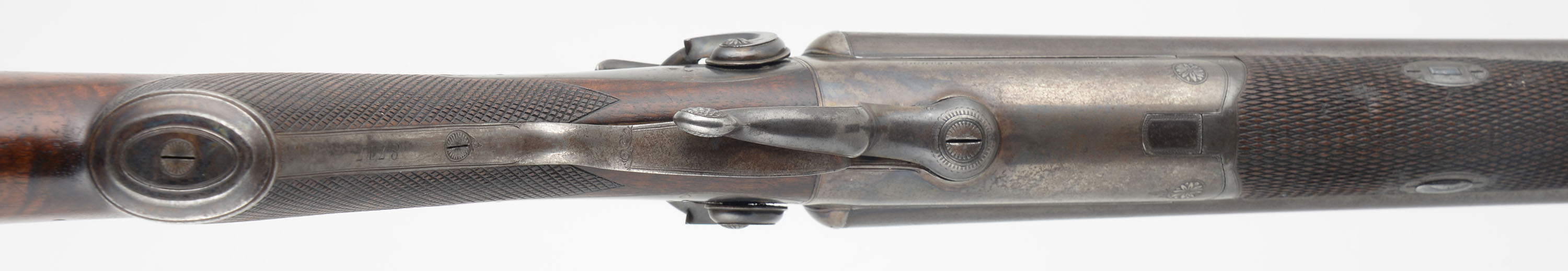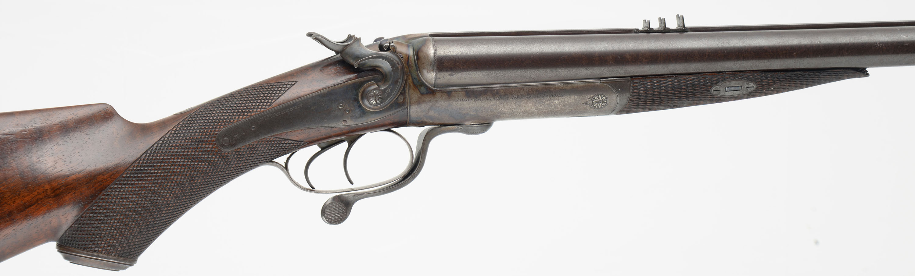 FANTASTIC W.W. GREENER, Model Hammer Double Rifle, CAL: 16 Bore, MFG: Ca. 1870 or at least the early 1870's. Antique, SN: 8717, Under Lever Break Double Hammer Rifle, 25'' Laminated Steel barrels, 10.2 lbs. While WW Greener records for the period prior to 1880 do not contain much information, but according to internet information, this 16-bore double rifle was made in 1871 & featured their patented self-retracting striker mechanism (Greener's solution to the tendency for firing pins in the early centerfire era to stick in the soft primers of cartridges of that time, effectively bolting the gun closed after discharge). Self-retracting striker shotguns & rifles were made by W.W. Greener between 1868 & 1875 & most had Jones under-lever opening mechanisms. Shotguns of this type are not common & rifles are quite rare.