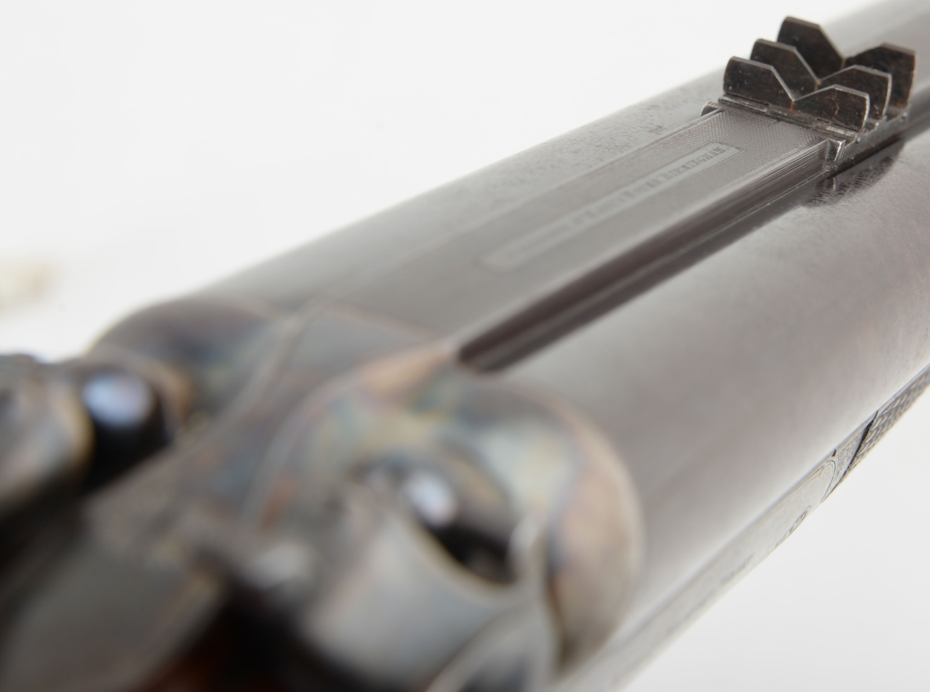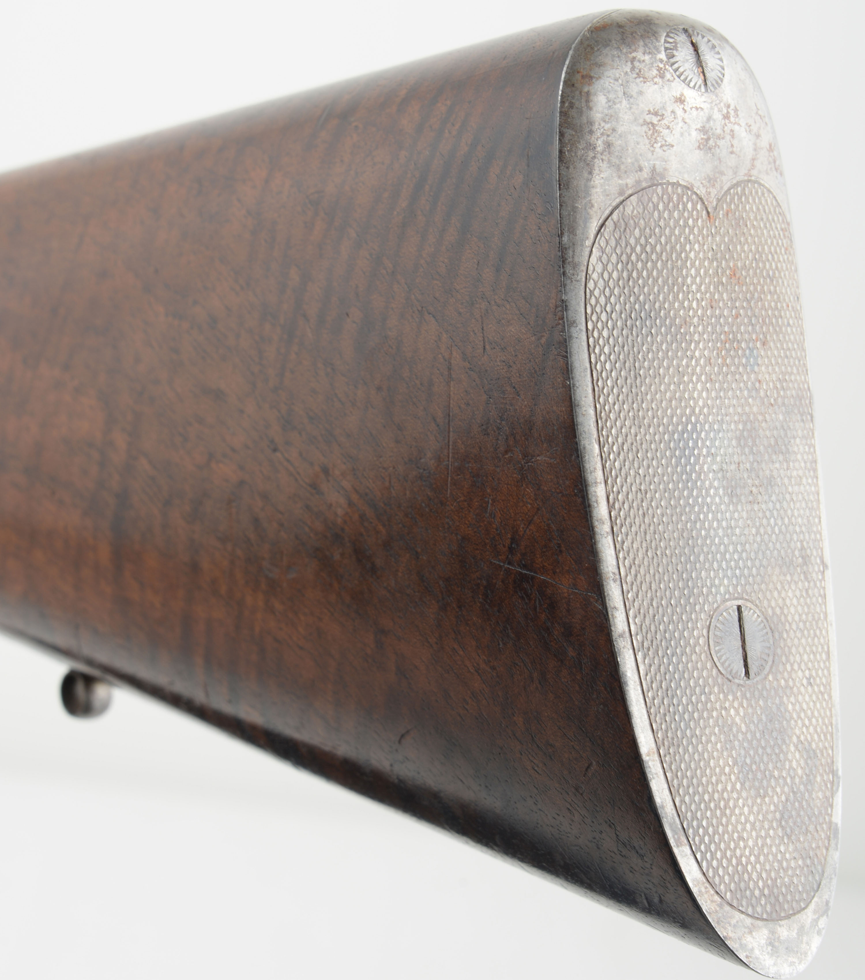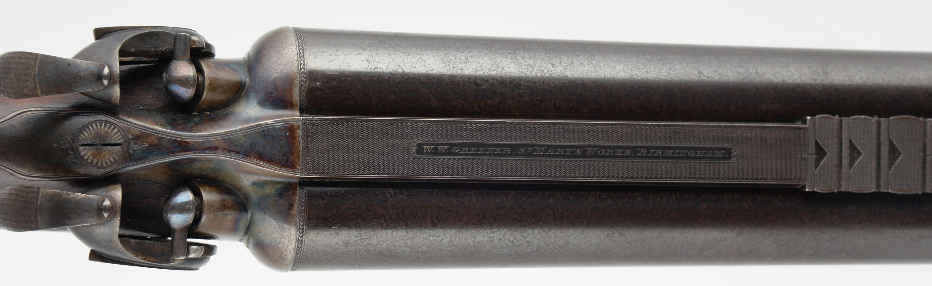 Regarding this rifle, the original hand checkered & silver capped pistol grip European walnut stocks are excellent, with very few minor handling marks, nicks or contusions to the excellent finish. The case-hardened receiver, lever, hammers trigger guard, & tangs all feature small accents of decorative scroll & border hand engraving, with large remnants of case-colors & smokey outlines. The case-hardened border engraved back action locks are each signed ''W.W. GREENER''. The right side of the receiver is engraved ''SIGHTED WITH 3 1/2 DRAMS OF POWDER''. The laminated barrels display beautiful milk chocolate patterns, with game rib engraved ''W.W. GREENER ST. MARYS WORKS. BIRMINGHAM''. The rib holds a recessed three-leaf rear sight & a long blade sight. Bores are excellent. Matching SN's found belly of both barrels, the water table & lower tang. Sling eyelets in stock & underside of the barrels. The buttstock holds a widow's peak checkered metal buttplate. Blank silver oval initial escutcheon inlayed in belly of the stock. An overall excellent, fine & investment grade antique W.W. Greener double rifle. Antique, No FFL Req. - Value: 5000 to 10000