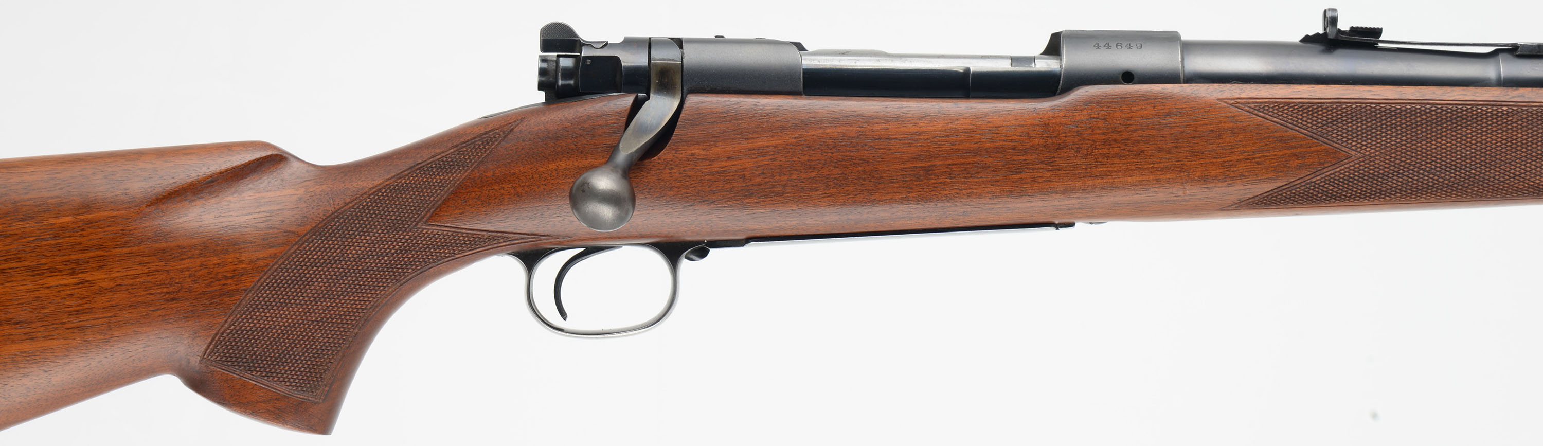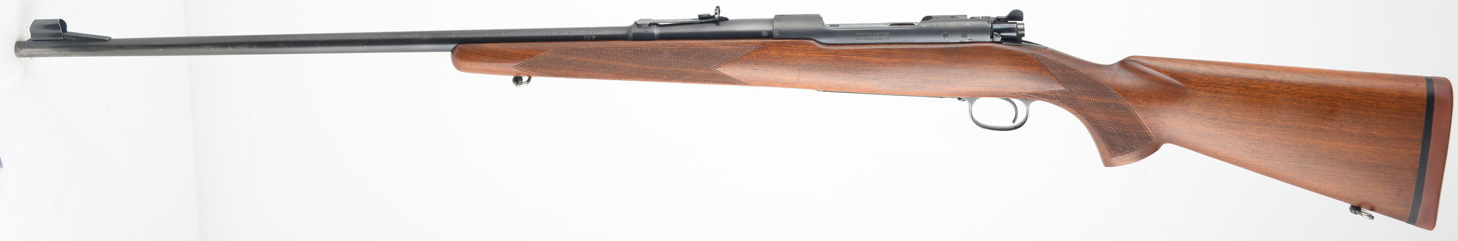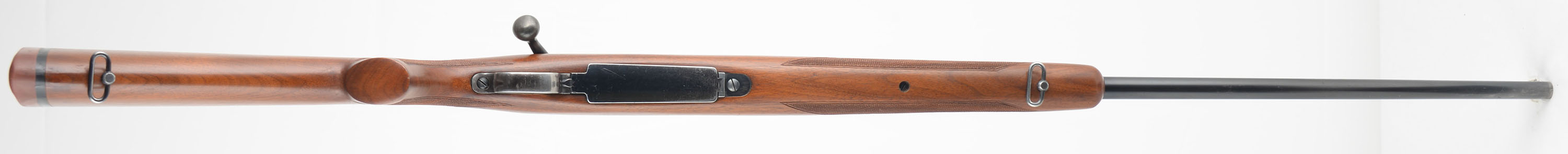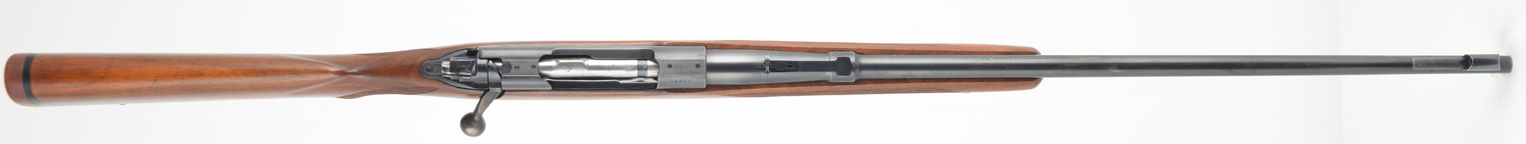 Winchester, Model 70, CAL: marked 300 MAGNUM IMP, MFG. 1942, SN: 446495, 26'' Round barrel. The barrel has the factory ''300 Magnum'' stamped on the left side, with the letter ''IMP'' stamped below it, indicating it has been rechambered to 300 MAGNUM IMP. The wood appears to have been professionally refinished, likely at the time of the caliber upgrade. The factory checkered & flat pistol grip wood stock is excellent, as lightly sanded & very nicely refinished. There appears to be a small inlay repair below the factory receiver sight provisions screws in the stock that is very well blended. The checkering appears to have been freshened as points are fairly sharp. There are very few minor rubs, light scratches or contusions remaining. Overall appearance of the stock & finish is excellent. The original metal blue finish rates 80% on barrel & receiver, while the trigger guard & floorplate shows additional wear. Bore is excellent. The receiver carries 4 scope mounting screw filled holes, two in the front of the receiver & two in the rear. The barrel has an adjustable rear sight & ramp & hooded front sight. The stock carries a Winchester solid recoil pad. Sling loops. Matching SN found on bolt. A sharp looking early WWII era vintage hunting rifle. FFL or C&R Req. - Value: 800 to 1500