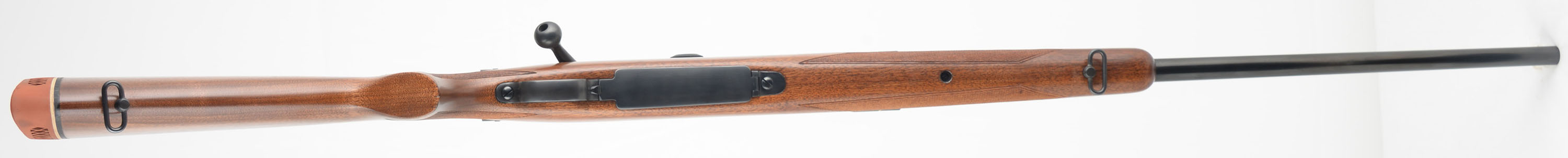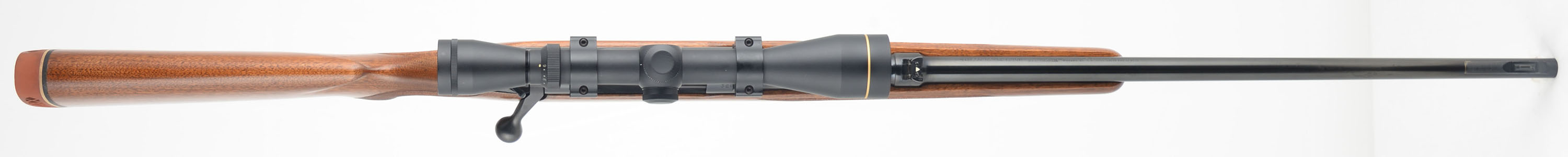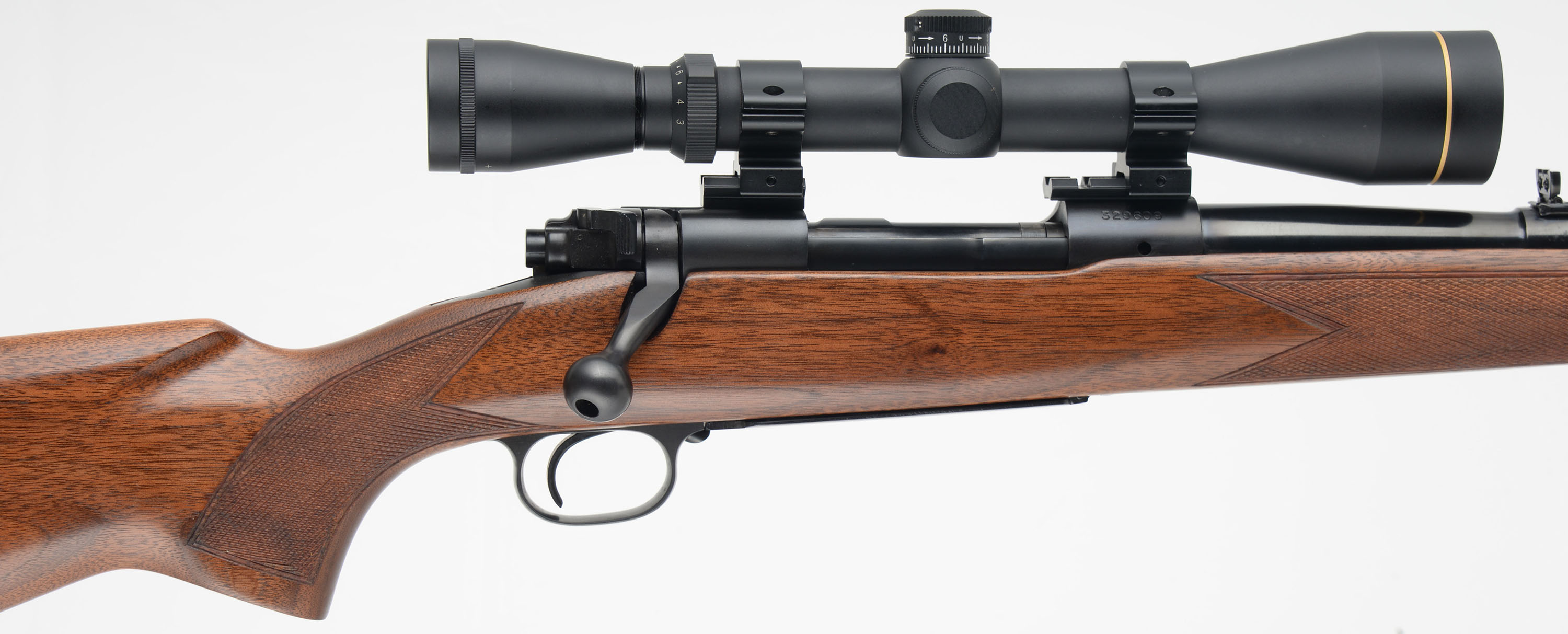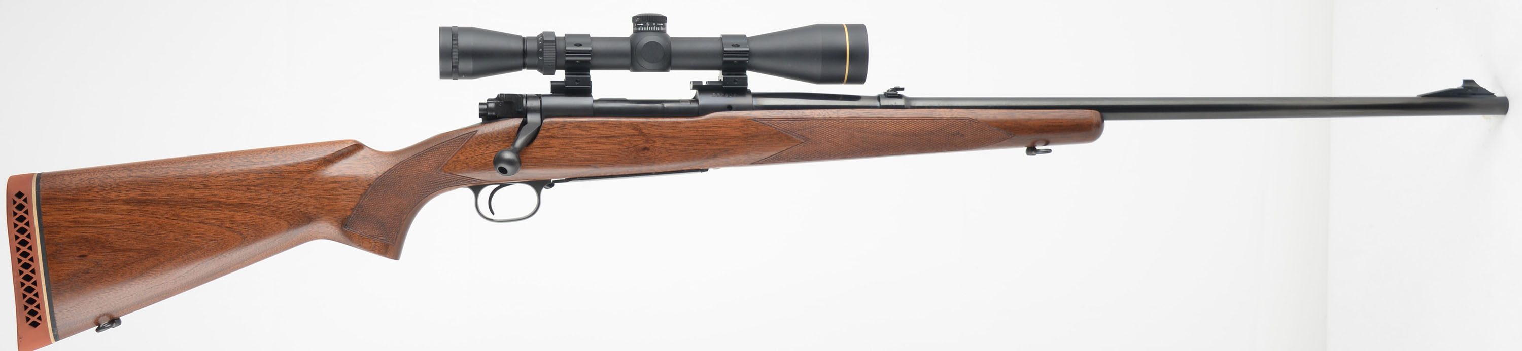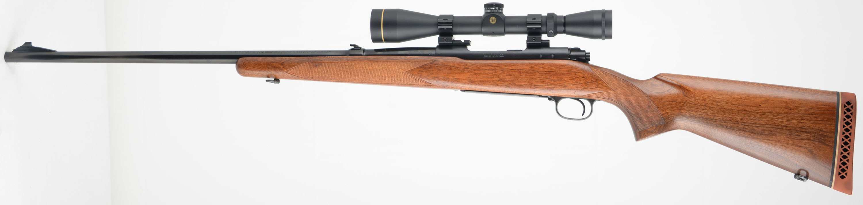 Winchester, Model 70, CAL: marked 30-06 SPFLD, MFG. 1955 (Pre-64), SN: 329609, 24'' Round barrel. This rifle was fully & professionally refinished. The factory checkered & flat pistol grip wood stock is excellent, as nicely refinished. The hand cut checkering was very nicely retraced & sharpened up. There are virtually no handling marks to the excellent finish. The metal blue finishes have been restored rating 98% overall, with full stampings remaining, but with an area of cleaned pitting under the blue about 6'' from muzzle. Bore is excellent & bright. The receiver carries a Leupold Gold Ring VX-2 3-9x40 scope, while the barrel is fitted with a folding leaf rear sight & ramped front sight. Stock carries a Pachmayr ventilated recoil pad. Sling loops. A sharp appearing pre-64 model 70 rifle. FFL or C&R Req. - Value: 600 to 1000