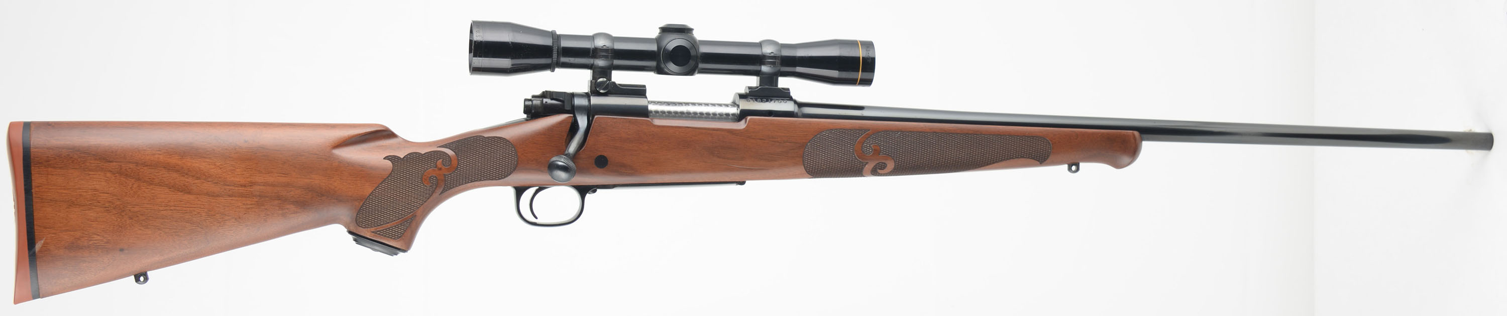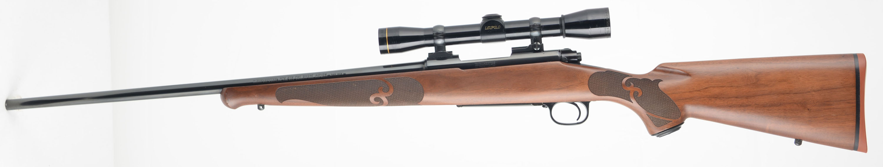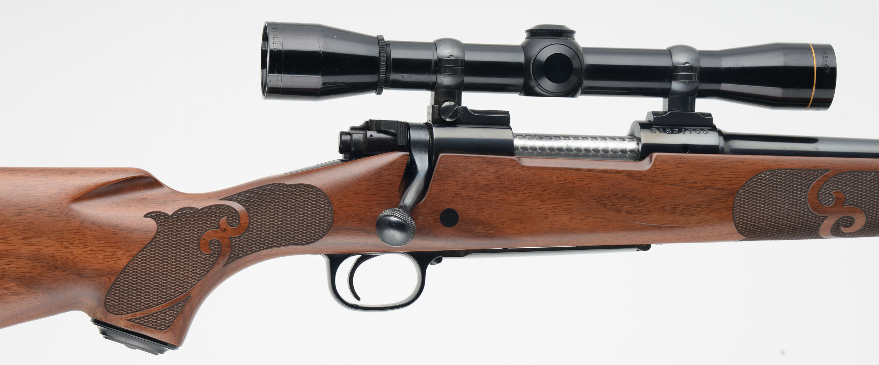 Winchester, Model 70 XTR FWT Short Action, CAL: 242 WIN, MFG: 1988, SN: G1821700, Bolt Action Rifle, 22'' barrel. The original checkered & capped pistol grip walnut stock is excellent, displaying few minor contusions & handling marks to the excellent original finish. The original metal blue finish rates 99% overall. Bore is excellent & bright, with sharp rifling. The receiver carries a Leupold Gold Ring M8-4X scope, while the barrel has no open sight provisions. Buttstock carries a Winchester solid rubber recoil pad. Serialized matching jeweled bolt. Sling stud. An excellent & all original Model 70 Featherweight. FFL Req. - Value: 800 to 1200