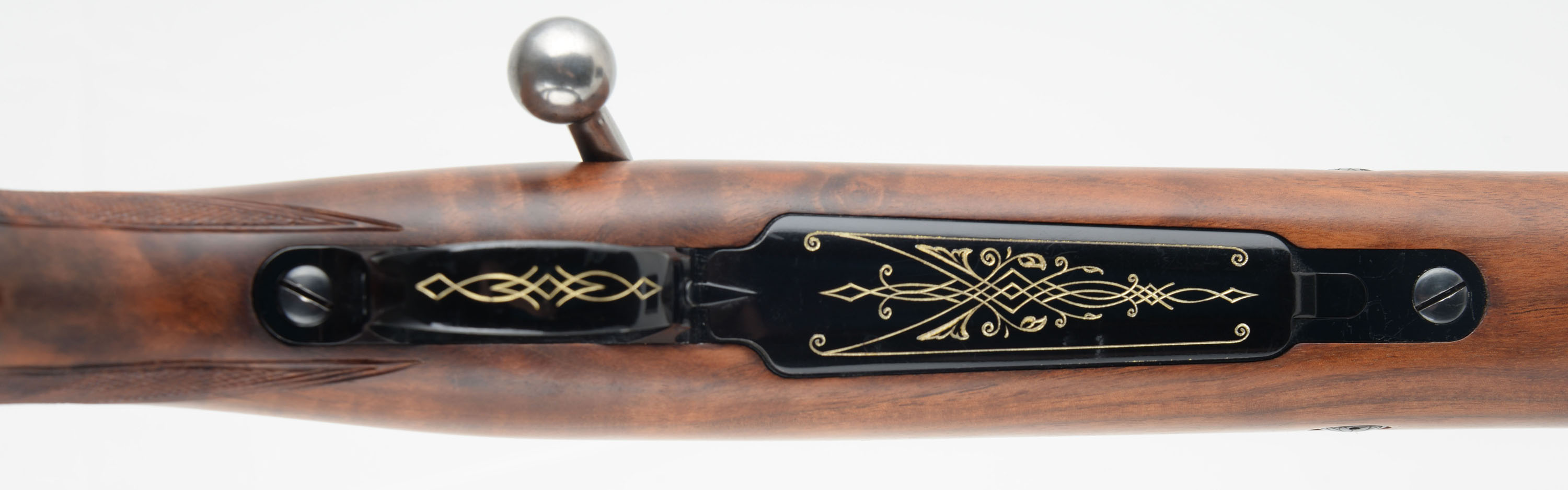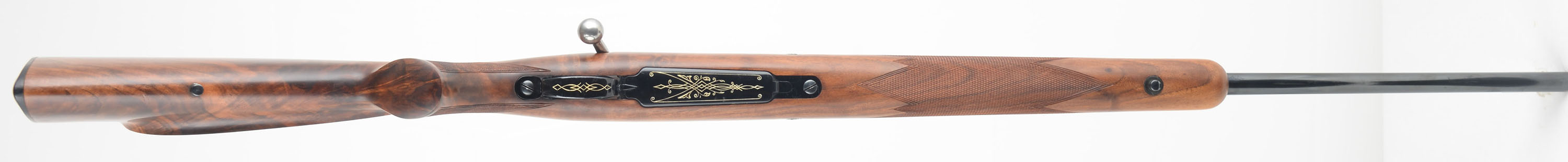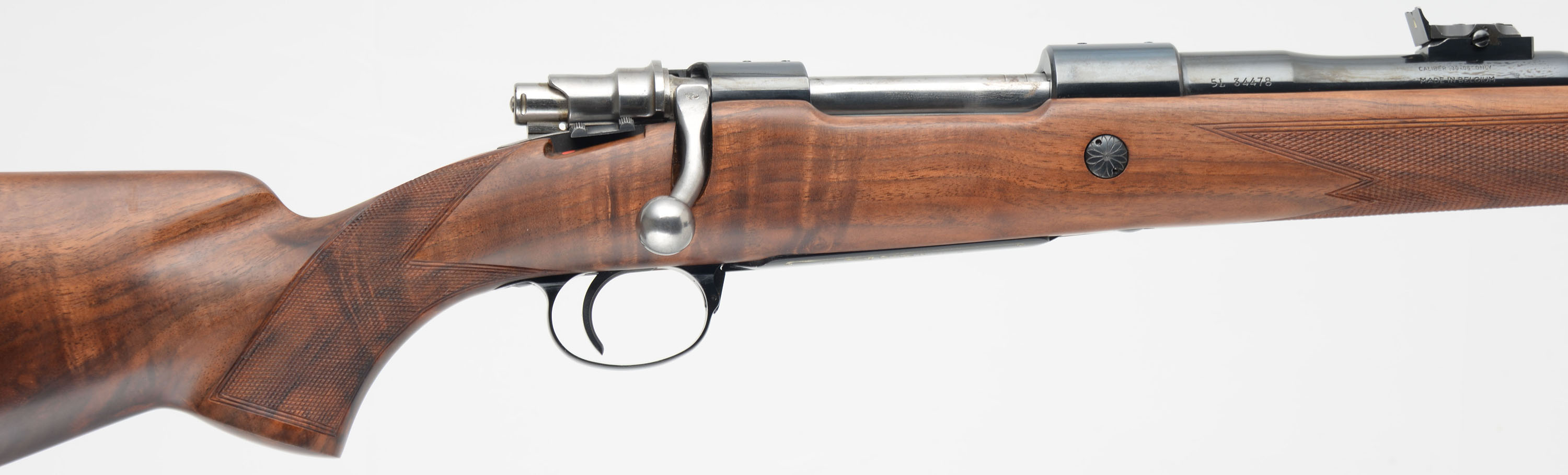 Browning (FN), High-Power Rifle Safari Grade, CAL: 30-06 Sprg, MFG: 1965, SN: 5L34478, Bolt Action Rifle, 22'' Barrel. The original checkered, cheeked & flat pistol grip Monte Carlo walnut stock is excellent, with very few tiny handling marks to the excellent factory finish. Fantastic rippled contrasting grain. The original metal blue finishes rate 98% overall, with slight discoloration & outline from previous scope block mounting in the factory provisions. Engraved floorplate & trigger guard. Bore is excellent. The barrel carries a raised platform rear & ramped hooded front sights. Buttstock carries a Browning plastic buttplate. Factory sling studs. FFL or C&R Req. - Value: 1500 to 2000