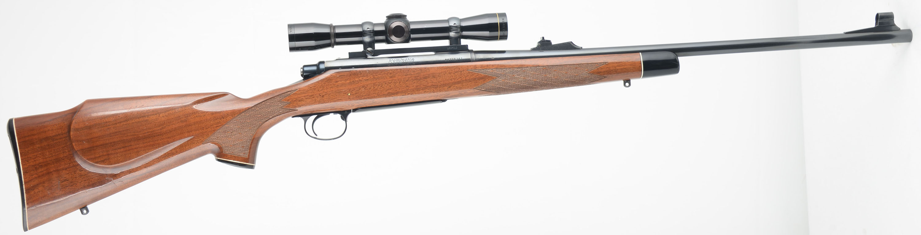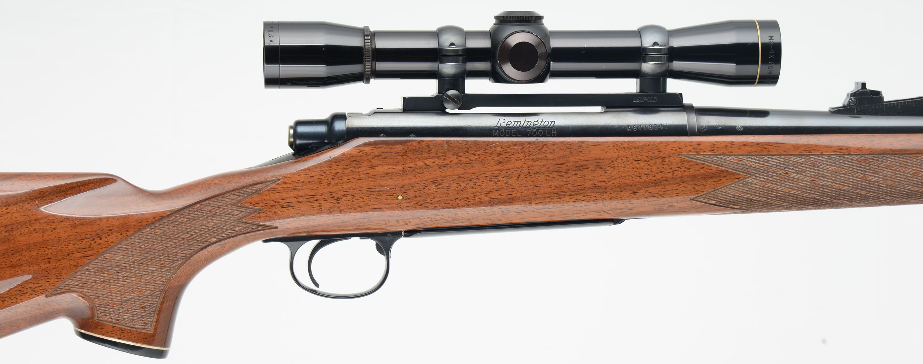 Remington, Model 700 LH LEFT HANDED, CAL: 30-06 SPRG, MFG:1979, SN: A6776347, Bolt Action Rifle, 22'' round barrel, The original cheeked, hand skip-line checkered & capped pistol grip Monte Carlo style wood stock is excellent, with just a couple of minor handling marks, scratches or light contusions to the original high gloss finish. The stock carries an ebony toned forend tip & plastic pistol grip cap. The original metal blue finish rates 95% overall. Bore is excellent. The receiver holds a Leupold Gold Ring M8-4x compact scope mounted on a Leupold rail, while the barrel carries the rear ramp sight & a hooded front sight. Stock carries a checkered buttplate. Sling studs. An overall excellent condition LEFT HANDED rifle, with a high quality scope. FFL Req. - Value: 600 to 1000