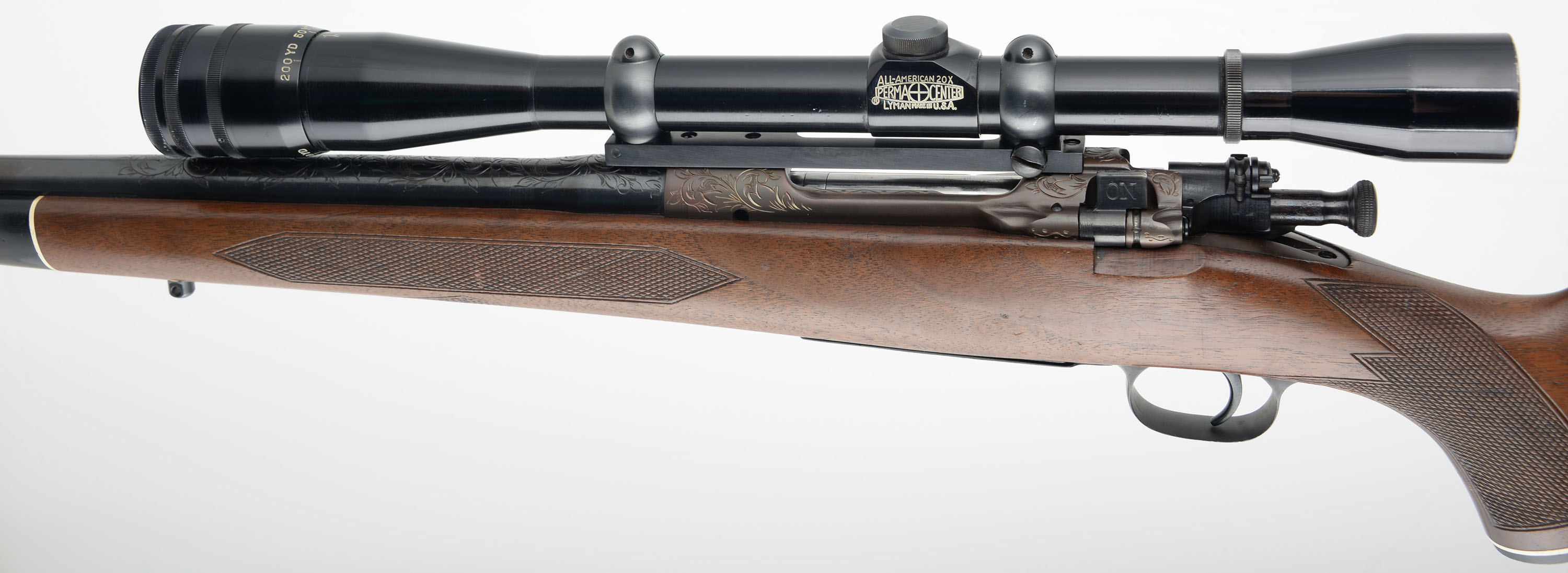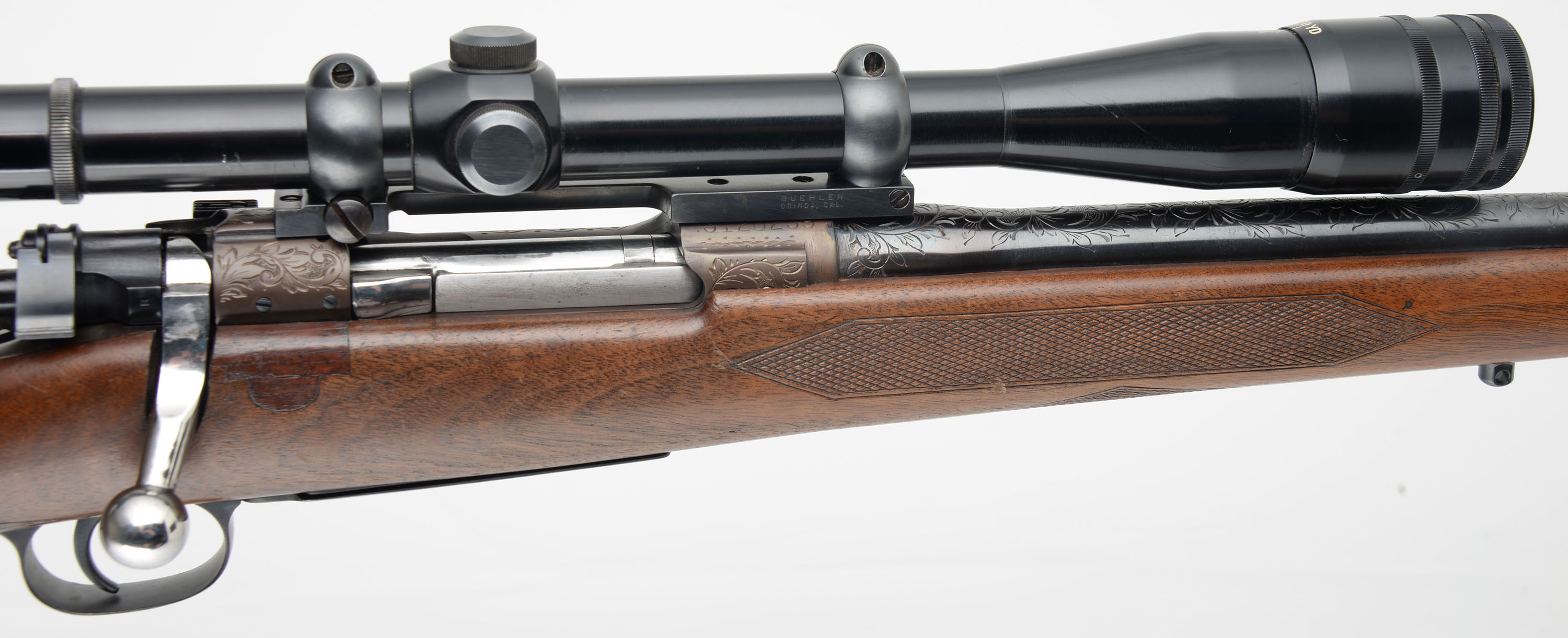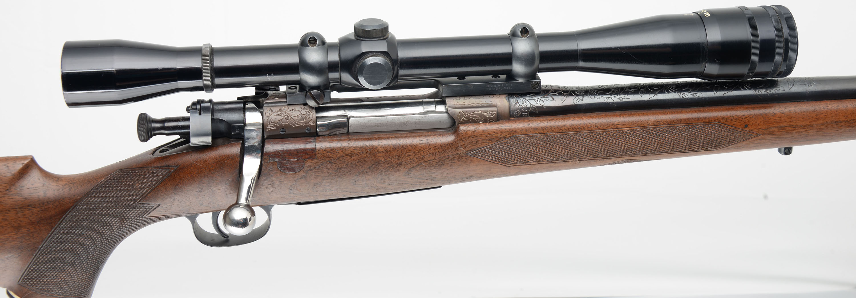 ENGRAVED CUSTOM Remington, Model 1903 Action, CAL: 30-06, MFG: 1942, SN: 3120239, Bolt Action Rifle, 24'' barrel. The custom cheeked & capped pistol grip Monte Carlo wood stock is excellent. It has an ebony style forend tip. There is an inlay of wood in front of the bolt handle to fill a previous cutout. The wood shows several minor scrapes, scratches & contusions to the finish. The metal displays scroll & foliage hand engraving to the receiver, barrel, floorplate & trigger guard, with the floorplate also featuring a stag head, The receiver has a unique bronze tone finish, while the barrel & other metal components have a traditional blue finish, which is excellent. Bore is excellent. The receiver carries a Lyman Perma Center All-American 20X scope, while the barrel has no open sight provisions. Buttstock carries a Pachmayr White-Line ventilated recoil pad. Sling studs. A nicely built custom bolt action rifle. FFL or C&R Req. - Value: 800 to 1200