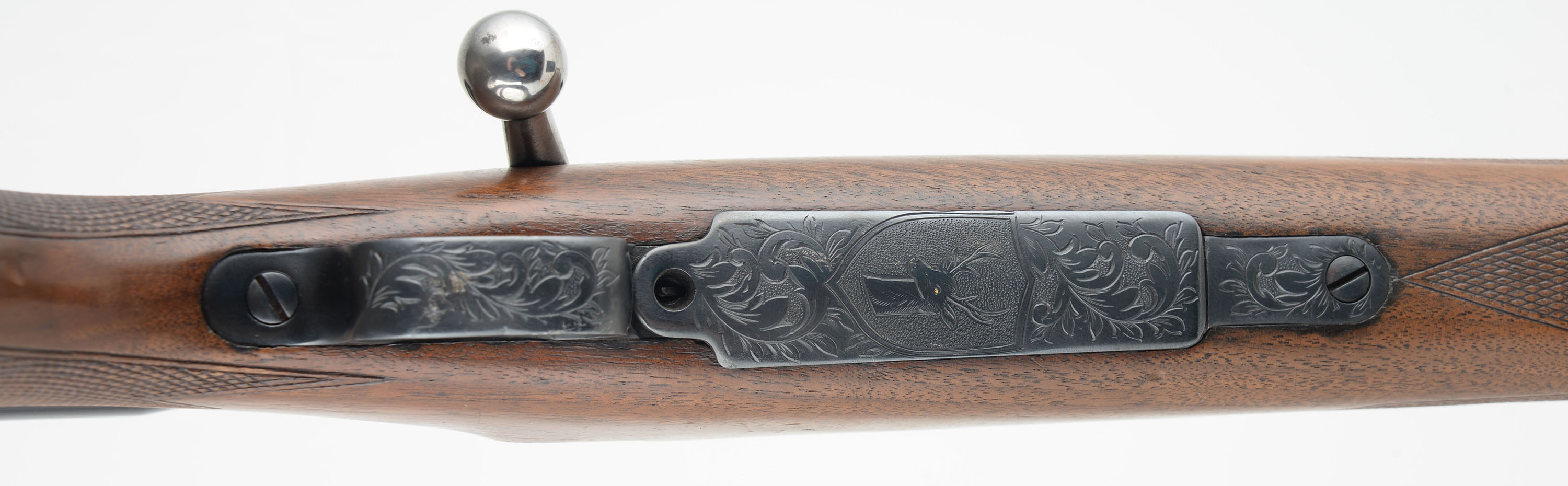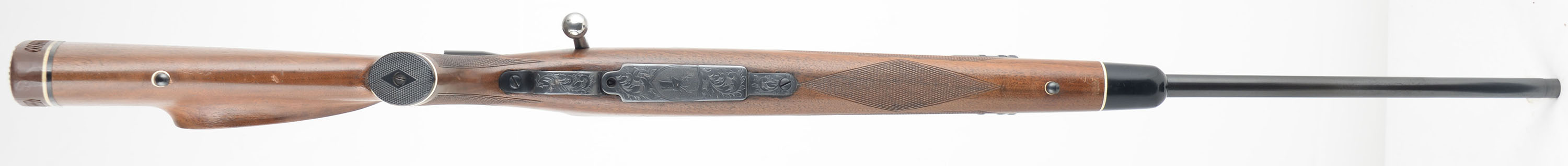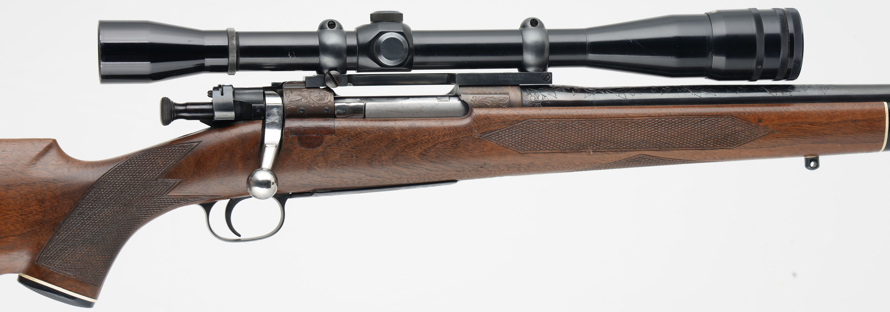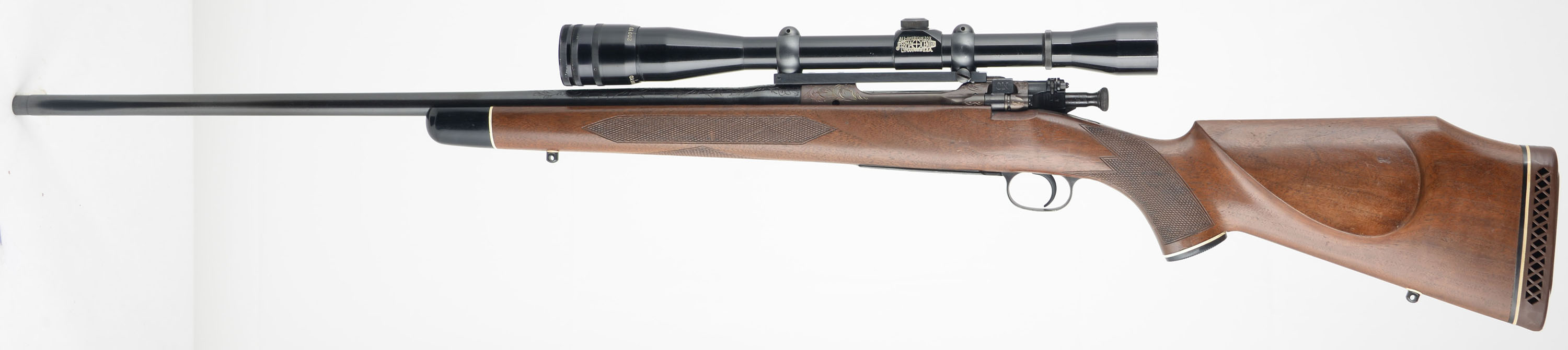 ENGRAVED CUSTOM Remington, Model 1903 Action, CAL: 30-06, MFG: 1942, SN: 3120239, Bolt Action Rifle, 24'' barrel. The custom cheeked & capped pistol grip Monte Carlo wood stock is excellent. It has an ebony style forend tip. There is an inlay of wood in front of the bolt handle to fill a previous cutout. The wood shows several minor scrapes, scratches & contusions to the finish. The metal displays scroll & foliage hand engraving to the receiver, barrel, floorplate & trigger guard, with the floorplate also featuring a stag head, The receiver has a unique bronze tone finish, while the barrel & other metal components have a traditional blue finish, which is excellent. Bore is excellent. The receiver carries a Lyman Perma Center All-American 20X scope, while the barrel has no open sight provisions. Buttstock carries a Pachmayr White-Line ventilated recoil pad. Sling studs. A nicely built custom bolt action rifle. FFL or C&R Req. - Value: 800 to 1200