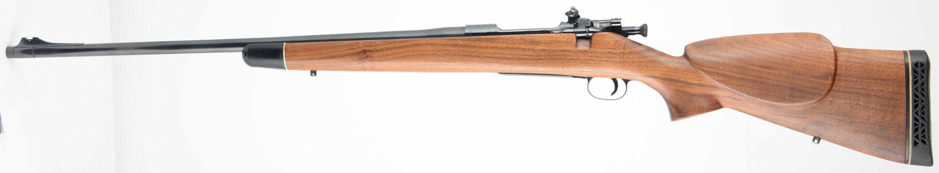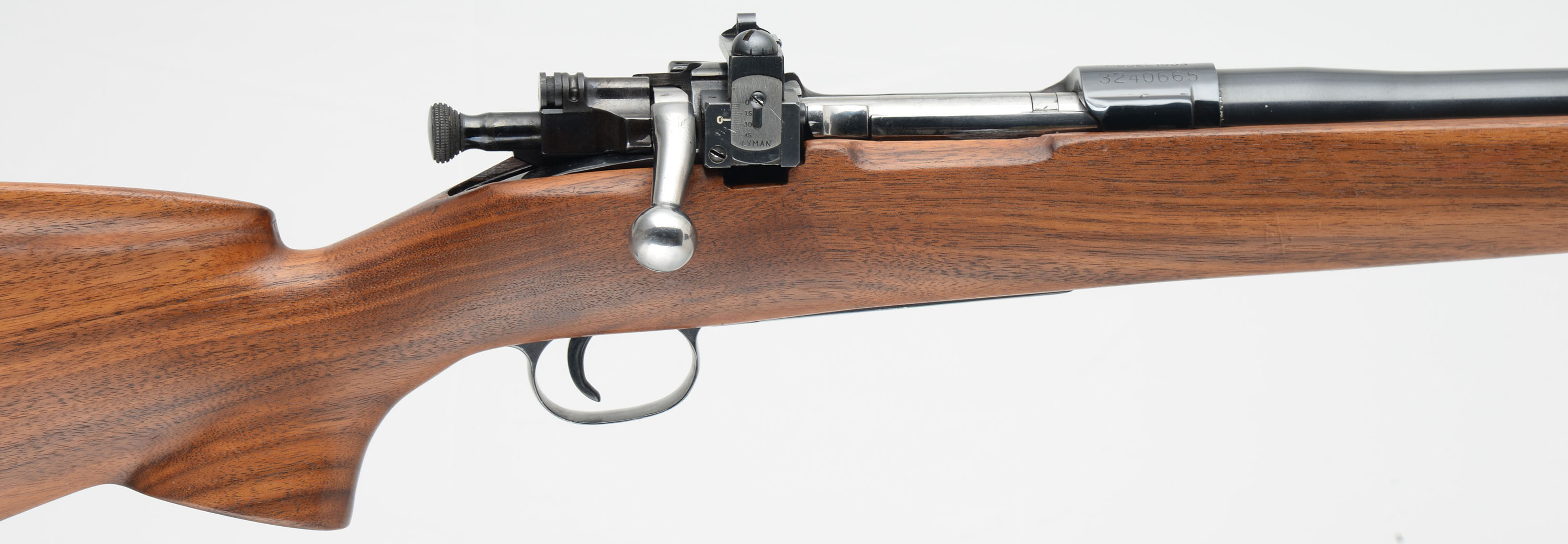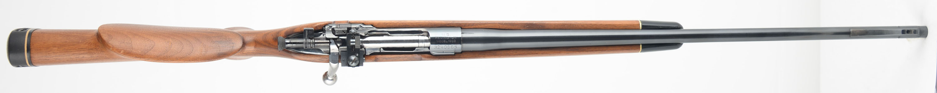 CUSTOM Remington, Model 1903 Action, CAL: 30-06, MFG: 1942, SN: 3240665, Bolt Action Rifle, 24 1/2'' barrel. The custom cheeked & pistol grip Monte Carlo wood stock is excellent. It has an ebony style forend tip. The wood shows several minor scrapes, scratches & contusions to the finish. There is a small screw hole on the flat of the pistol grip from possible forend cap. The metal blue finishes rate 95% on the barrel, 90% on the receiver. Bore is excellent. The receiver carries a Lyman left side mounted receiver sight, while the barrel has a ramped dovetail sight provision without a current sight. Buttstock carries a White-Line ventilated recoil pad. Sling studs. A well built custom bolt action rifle. FFL or C&R Req. - Value: 500 to 800