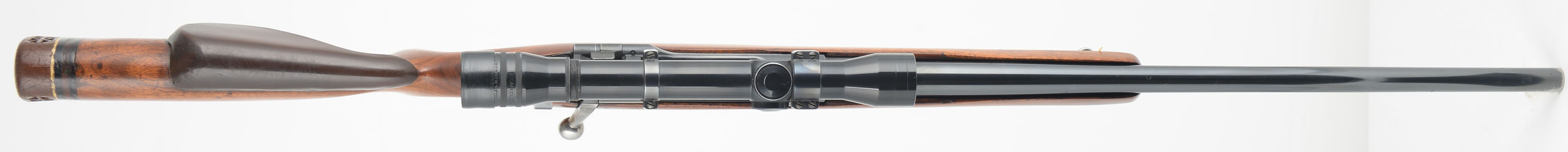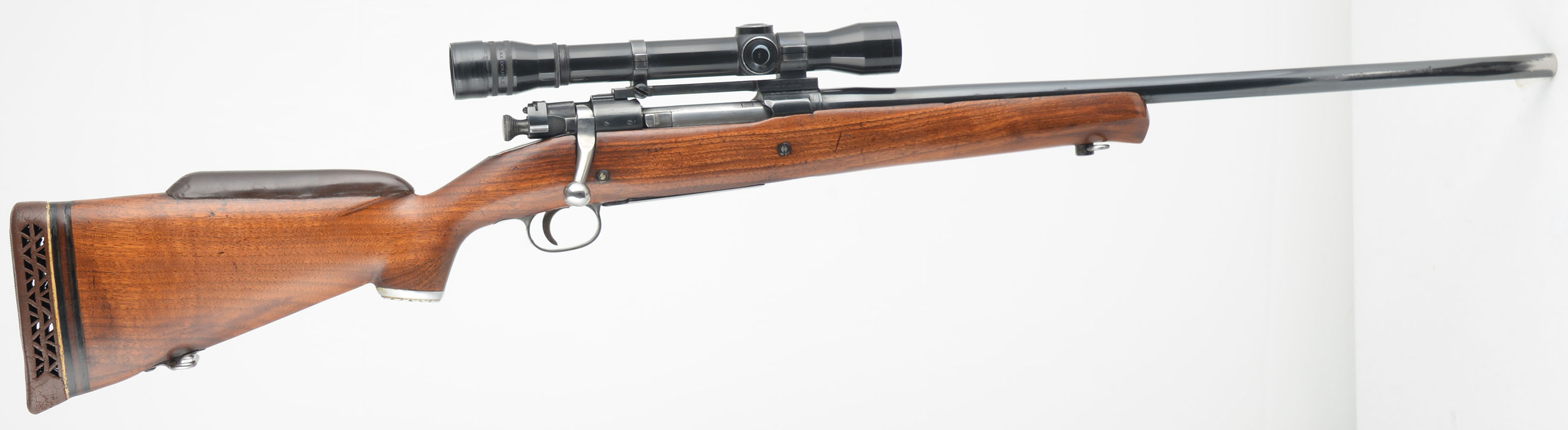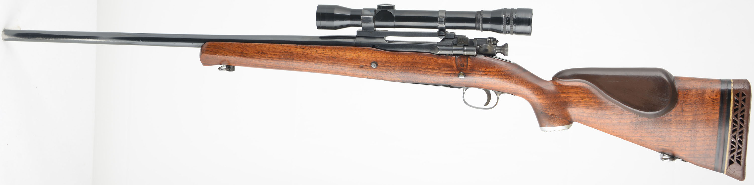 Remington, Model 1903 Sporterized, CAL: 30-06, MFG: 1943, SN: 3341547, Bolt Action Rifle, 20 1/2'' barrel. The altered & customized original stock has an added cheek & metal capped pistol grip, with is very good & solid. The stock has been cut down & given a schnabel style forend tip. The wood shows several minor scrapes, scratches & contusions to the finish. The metal blue finish rates 75% overall. Bore is good, with spots of roughness amongst thinning rifling. The receiver carries a Stith Mounts Bear Cub 4X Double scope mounted on Redfield mounts, while the barrel has no open sight provisions. Buttstock carries a White-Line ventilated recoil pad. Sling loops. This rifle has a worn trigger sear, which allows the striker to drop when moving the bolt after the rifle is cocked. It cannot be safely unloaded & could easily misfire, therefore is not safe. This rifle will require gunsmith repair to function properly & thereafter is being sold ''AS-IS'' with no returns. FFL or C&R Req. - Value: 200 to 400