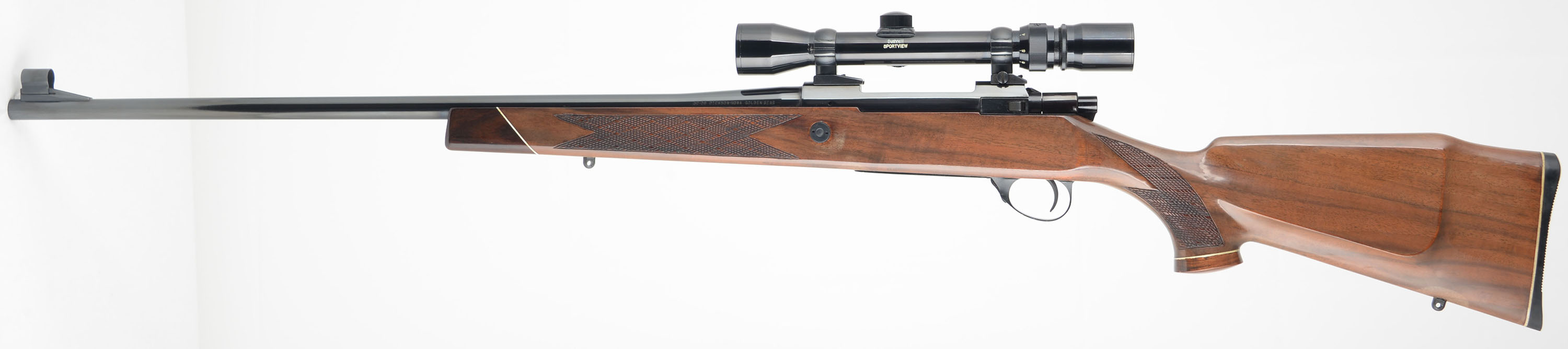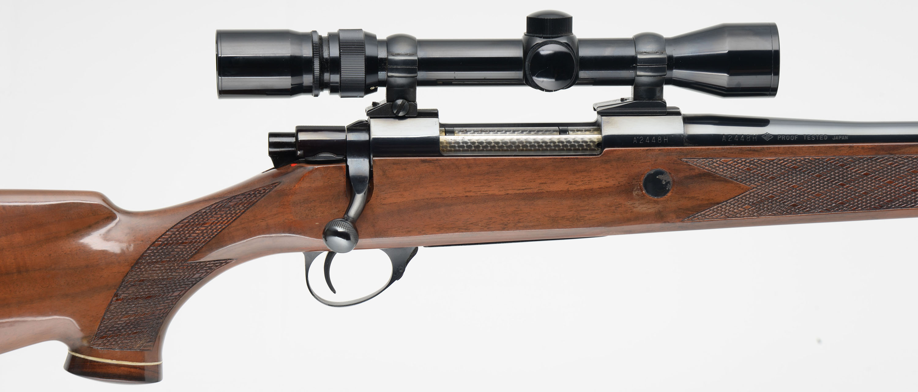 Dickson-Howa, Model Golden Bear, CAL: 30-06 SPRG, MFG: 1967, SN: A2448H, Bolt Action Rifle, 24 1/2'' barrel, Howa of Japan presented the Howa Golden Bear bolt action rifle at the Chicago Shot Show in 1967. Approximately 3000 Golden Bear rifles were exported to U.S.A & passed all the tests at HP White Laboratory, which is one of the worlds most prestigious firearms testing laboratories. After the introduction of the rifle, Howa won the fame & acceptance in the U.S market. As most Sako enthusiast are aware, the ''Golden Bear'' was an almost exact copy of the Sako Finnbear. Conventional wisdom is that Sako sued Howa for patent infringements, which stopped the production & sale of the Golden Bear. The original skip line checkered, cheeked & capped pistol grip Monte Carlo walnut stock is excellent, with rose wood slant-cut forend tip & pistol grip cap. The original finish is very good, but has started to haze some & has a couple of areas of discoloration. There are a few light scratches & contusions to wood & finish. The original metal blue finish rates 98% overall. Bore is excellent. The receiver carries a Bushnell Sportview scope, while the barrel has a hooded ramp front sight. Stock carries the factory buttplate. Sling studs. A very nice, high quality & fairly rare hunting rifle. FFL or C&R Req. - Value: 400 to 800