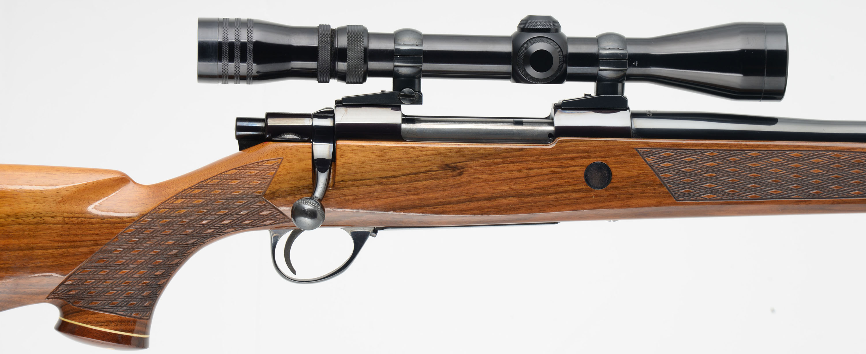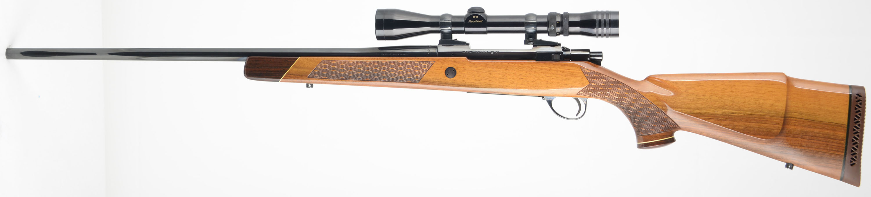 Sako, Model Finnbear/L61R, marked Cal. 7mm Rem Mag, MFG. 1971 Finland, SN: 60153, Bolt Action Rifle, 24 1/2'' Round barrel, The original factory, skip-line checkered, flat pistol grip, & cheeked Monte Carlo wood stock is excellent & original. The stock features a slant cut rose wood forend tip & pistol grip cap. There are very few tiny handling marks or rubs to the excellent original finish. The original metal blue finish rates 95% overall, but with additional wear of thinning on the peg through the stock ahead of the receiver & on the floorplate, The receiver is toning a lovely plum. Fitted with a Redfield 3-9X scope, while the barrel has no provision for open sights. Bore is excellent, Stock carries a Sako ventilated recoil pad. Factory sling studs. These high quality Sako rifles are desirable amongst hunters & collectors. FFL or C&R Req. - Value: 1200 to 2000