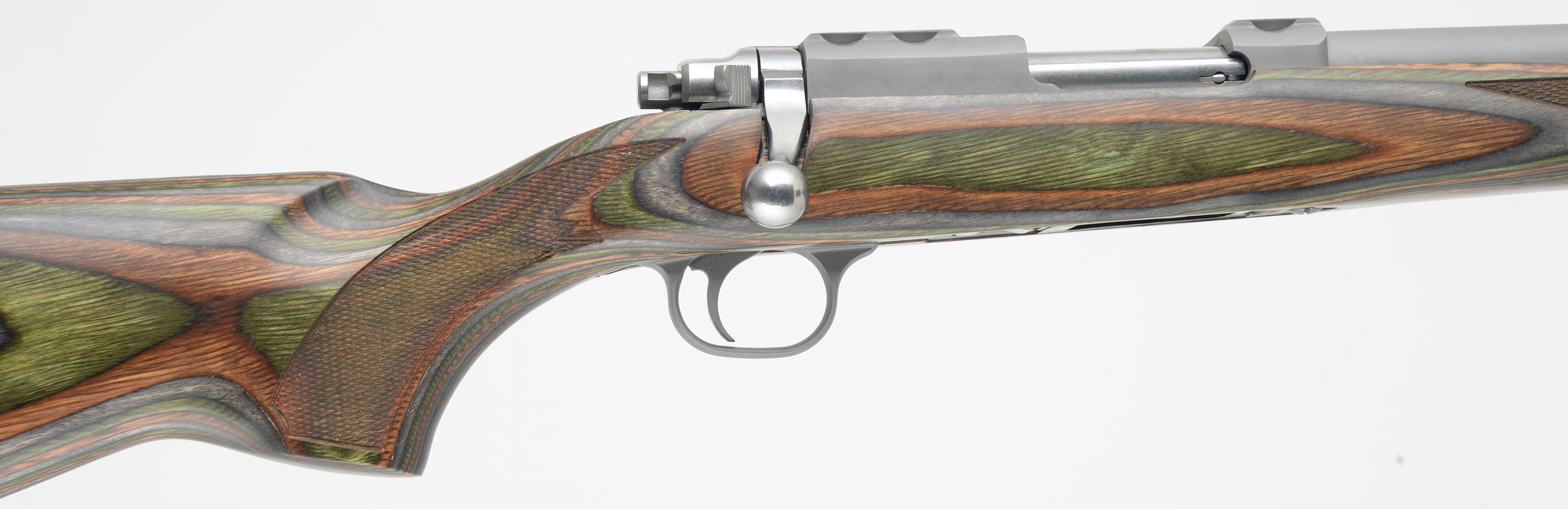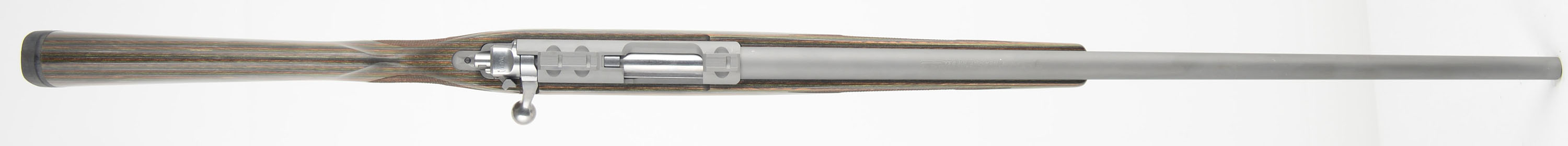 BOXED Ruger, Model 77/22, CAL: 22 Hornet, Stainless Target Grey, MFG: Modern, SN: 720-90720, Bolt Action Rifle, 24'' barrel. The original checkered & flat pistol grip laminated wood stock is excellent, with virtually no handling marks to the excellent original finish. Sharp checkering. The metal finish is a satin stainless gray & rates 99% overall. Bore is excellent. The receiver has integral scope mounts machined directly into the receiver, & comes with the factory scope mount rings for future scope mounting. No provision for open sights on the barrel. Buttstock carries a Ruger logo solid black rubber recoil pad. Sling studs. Factory detachable mag. This rifle comes from a closed gun shop where it was backstock inventory. It does not appear that the scope mounts were mounted or that it was shot, however it does have a couple of minor handling rubs on the barrel from in store handling. Basically, near new old stock, which comes in the original box, with factory paperwork, finish matching scope rings, & lock. MSRP is $1349. Excellent overall. FFL Req. - Value: 1000 to 1300