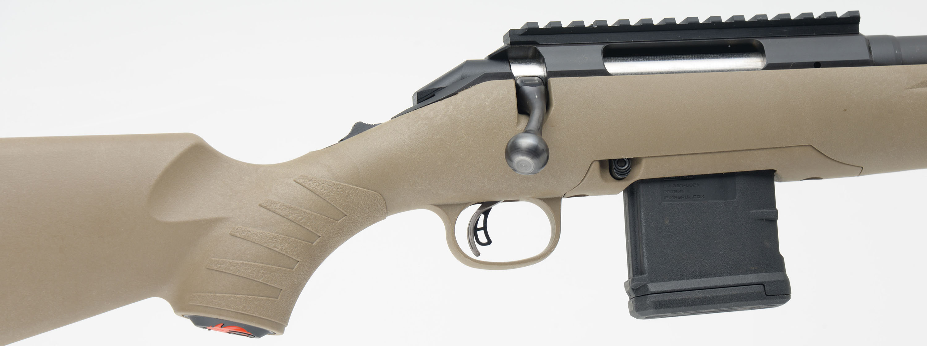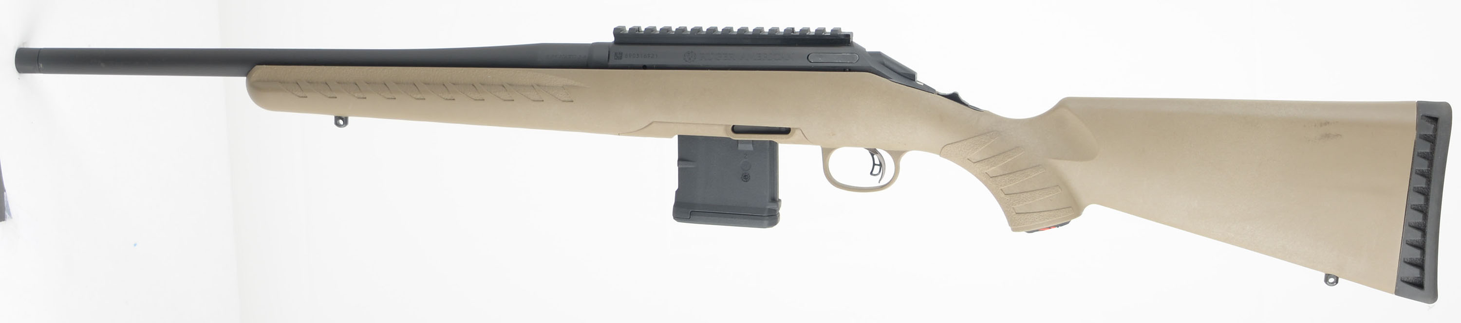 BOXED Ruger Model ''American'' Ranch FDE, CAL: .5.56 NATO, MFG: Modern, SN: 690316921, Bolt Action Rifle, 16 1/8'' Hammer-forged tapered barrel, with capped threaded muzzle tip for possible brake or silencer mounting. The original capped pistol grip, flat dark earth composite stock is excellent. The original matte black metal finishes are 99%+ overall. Bore is excellent. The receiver carries a picatinny rail, while the barrel carries no open sight provisions. Ruger Marksman adjustable trigger. Tang Safety. Black rubber recoil pad, LOP 13.75'' over pad. Ruger detachable extended mag. Swing studs. Comes in the original factory box, with packaging, paperwork & lock. Near new, excellent overall carbine length rifle. FFL Req. - Value: 400 to 600