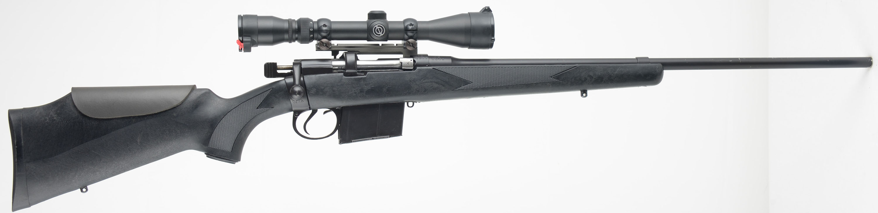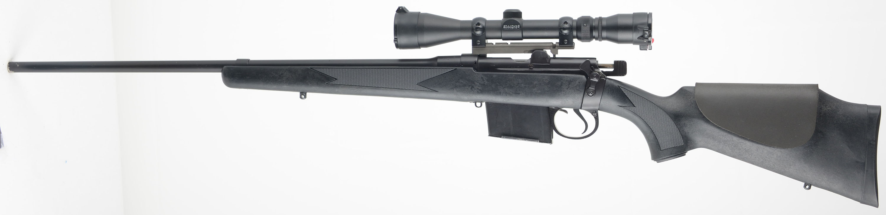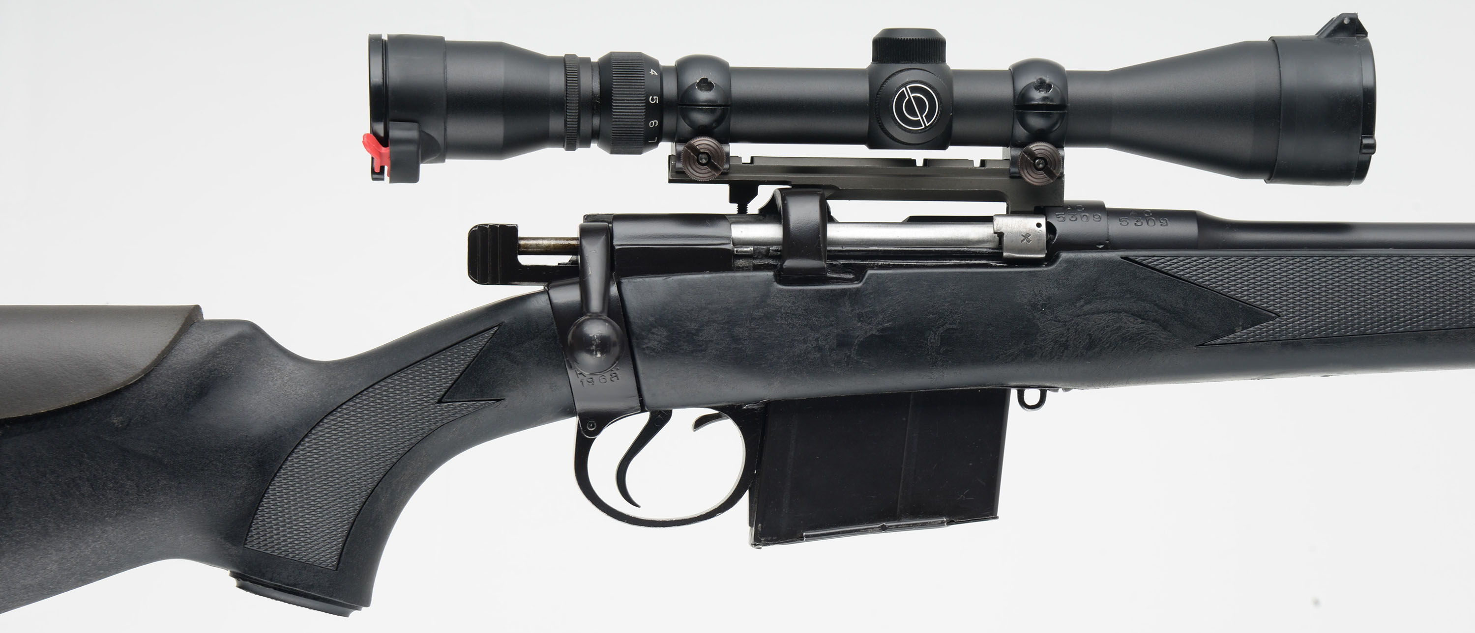 Rifle Factory Ishapore-India, Model Lee Enfield 2A1 SMLE, 7.62 X51mm Nato Cal., MFG. 1968 (receiver), SN: AC5309, Bolt Action Rifle, 24'' Round barrel, This rifle was imported by Century Arms. The updated cheeked, checkered & capped pistol grip synthetic stock is excellent, with no real handling marks. The current metal blue finish rates 90% overall, with some abrasions on the forward half of the barrel. The receiver carries a Simmons 8-Point Fully Coated Wideview 3-9x40 scope with flip-up caps. The barrel carries no open sights. Bore is excellent & bright. Stock carries a checkered black plastic buttplate. Sling studs. Detachable 10 round mag. FFL or C&R Req. - Value: 300 to 500
