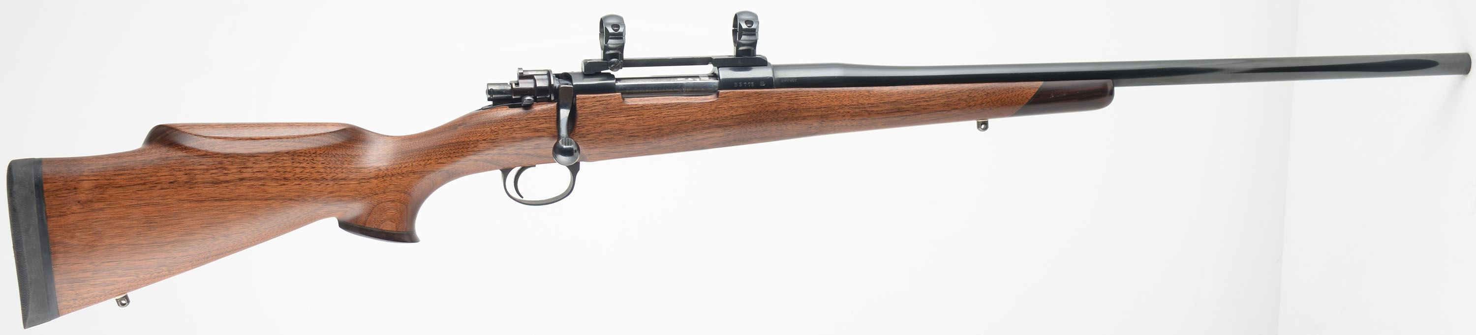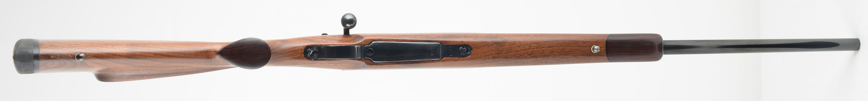Custom DWM, Model: 1909 Argentino Mauser Action, Cal: 240 Weatherby, MFG: 1910 German, S/N: B3773, Bolt action Rifle, 22 1/2'' barrel. The custom cheeked & flat pistol grip Monte Carlo stock is excellent, with the rosewood slant cut forend tip & pistol grip cap. Its features give the custom stock has the appearance of a Weatherby style stock. The deluxe wood displays excellent grain & has very few tiny handling marks to the excellent overall finish. The metal blue finish rates 95% overall, with some cleaned pitting under the blue on the floorplate. The left side of receiver is marked ''MAUSER MODELO ARGENTINO 1909'', ''DEUTSCHE WAFFEN-UND'', ''MUNITIONSFABRIKEN BERLIN'', right side of receiver is marked with S/N, Left side of the barrel is stamped ''M. Robinson''. Bore is excellent & bright. The receiver carries a set of rings on a Redfield bar mount, while the custom barrel carries no open sight provisions. The stock carries a Decelerator solid rubber recoil pad. Excellent overall & nicely built. FFL or C&R Req. - Value: 400 to 800