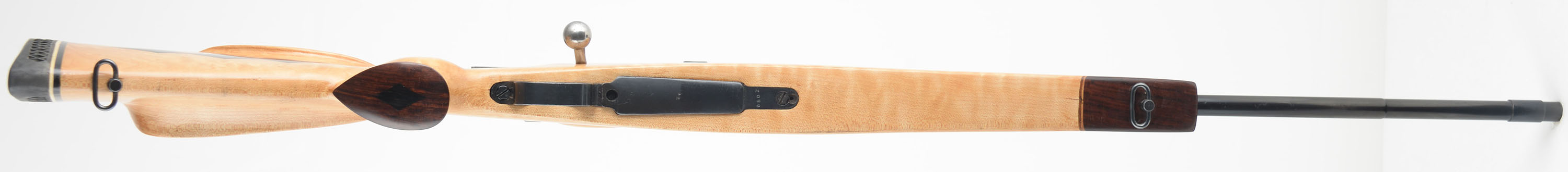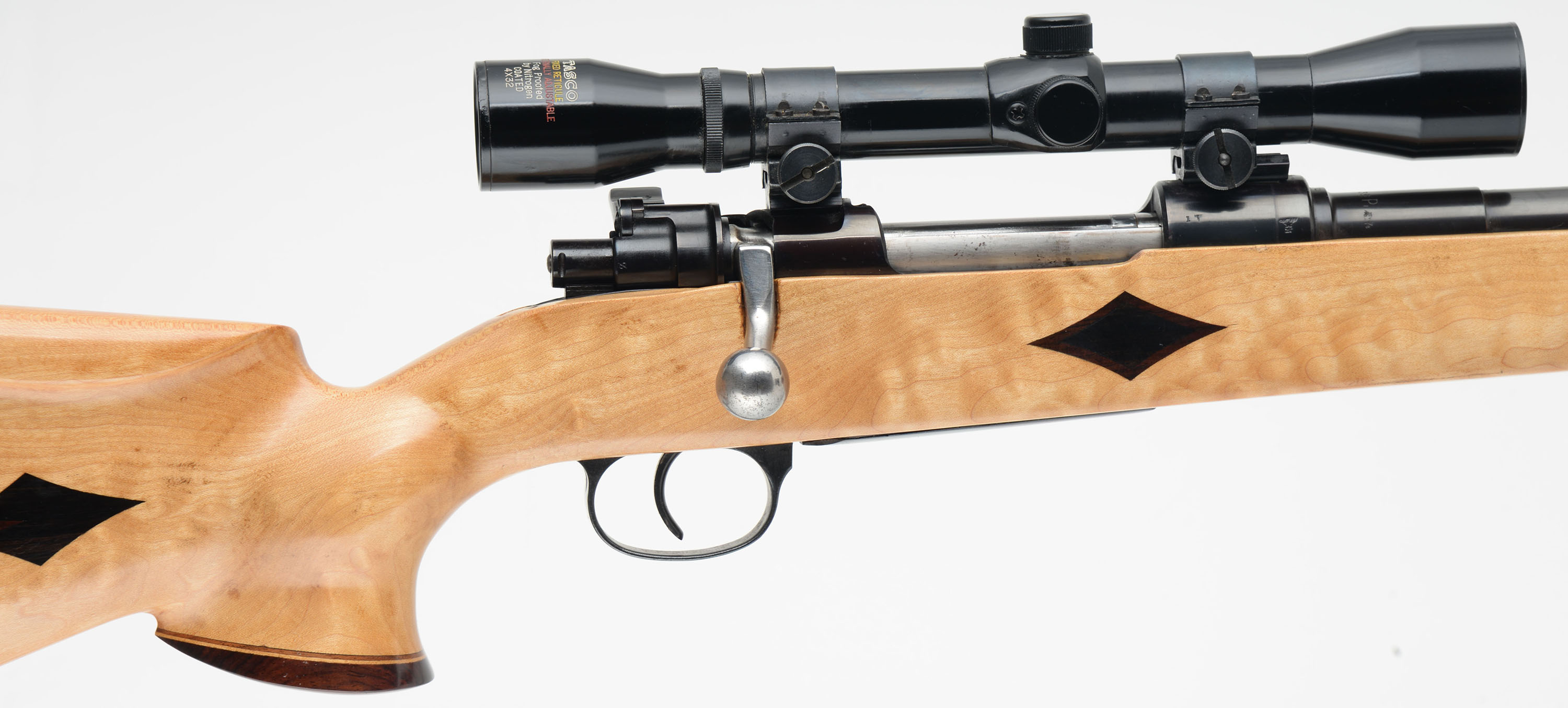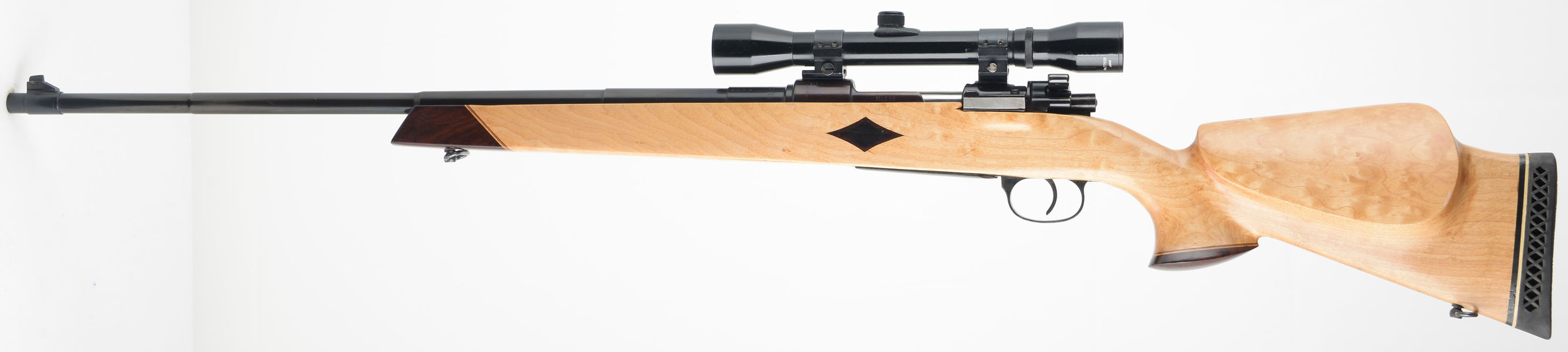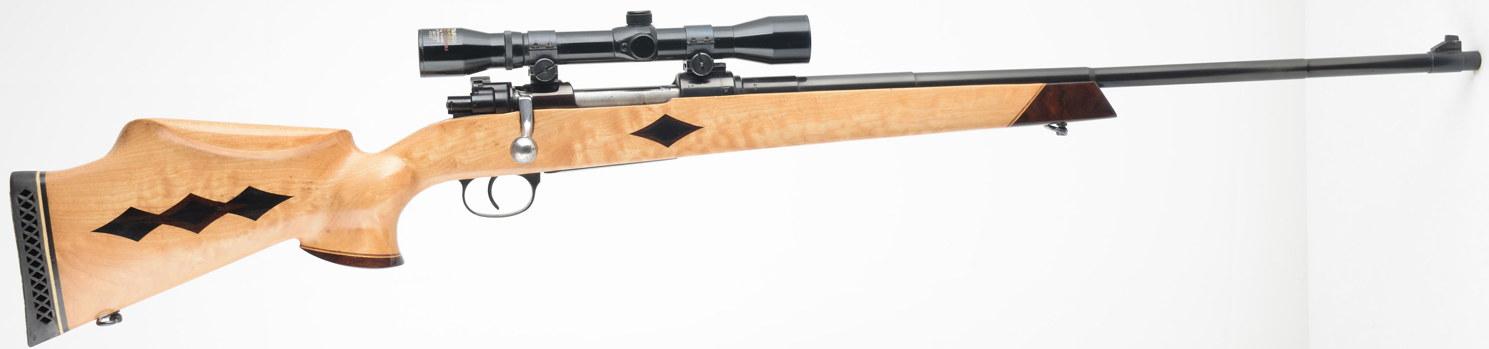 Sporterized Rifle, Built from a Gustloff Werke (bcd code) K98K Swedish Mauser, CAL: 7.92x57mm (8mm Mauser), MFG: 1941 (action), SN: 2049, Bolt Action Rifle, 23 3/4'' stepdown barrel. WWII era rifle, with Nazi proof stampings. The upgraded cheeked & capped pistol grip Monte Carlo style maple wood stock is excellent, with slant cut rosewood forend tip & pistol grip cap. The stock also displays rosewood & ebony diamond inlays, & the stock is reminiscent of a Weatherby style, There are a few handling marks, scrapes & light contusion, as well as a larger gouge where the bolt occasionally hits the upper comb. The stock's finish & overall look is excellent. The current metal blue finish rates 85% overall, with the receiver finish toning plum. The barrel appears to be the original, with the original ramped front blade sight. The receiver carries a Tasco Fixed Reticule Internally adjustable 4-32 scope. Bore is excellent & bright. Stock carries a Pachmayr White-Line ventilated recoil pad. Sling loops. A nicely sporterized or custom military to hunter conversion. FFL or C&R Req. - Value: 250 to 500