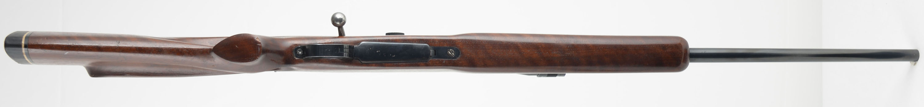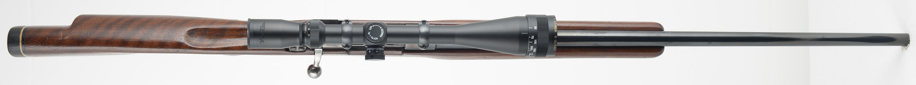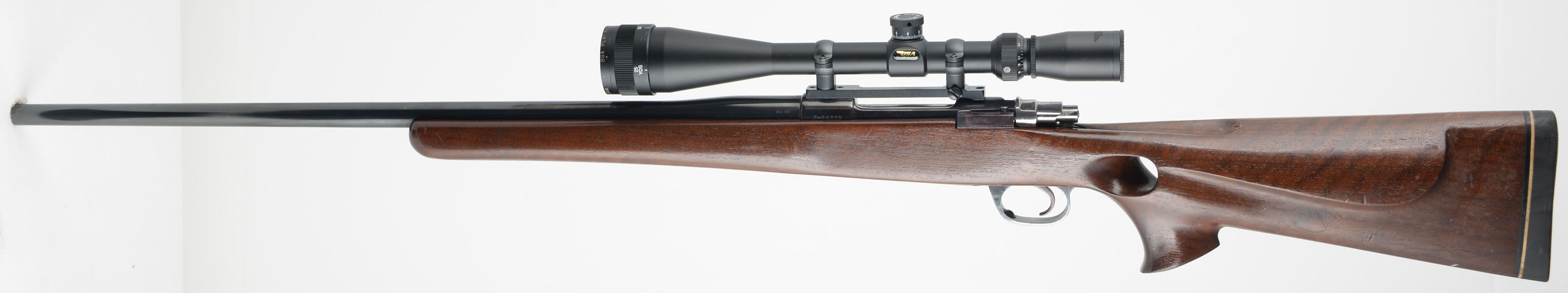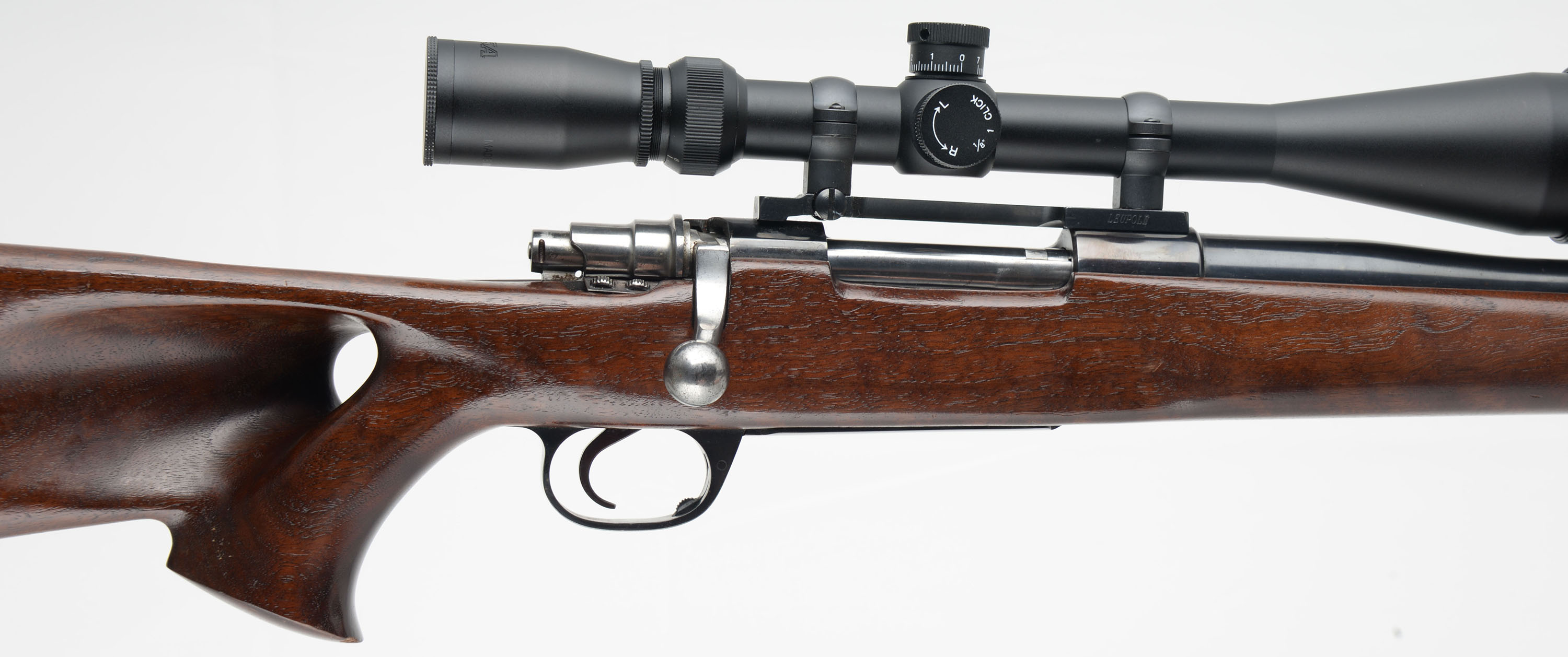 Custom Commercial Mauser Action, Cal: 6mm Rem, MFG: 1930's-60's, S/N: Z-55319, Bolt action Rifle, 26 1/2'' barrel. The custom & very unique straight-line comb, cheeked & thumbhole pistol grip stock is excellent. There are several minor handling marks, scratches & contusions to the excellent overall finish. There is a small chip to the edge of the pistol grip & some scratches at the top of the comb from bolt removal. The metal blue finish on the barrel & receiver rates 90%, 80% on floorplate & trigger guard, with areas on the receiver toning plum. Bore is excellent & bright. The receiver carries a BSA Platinum 8-32X44 scope on Leupold mounts, while the custom barrel carries no open sight provisions. The stock carries a solid rubber recoil pad. Sling studs. A solidly built custom Mauser action rifle. FFL or C&R Req. - Value: 300 to 600