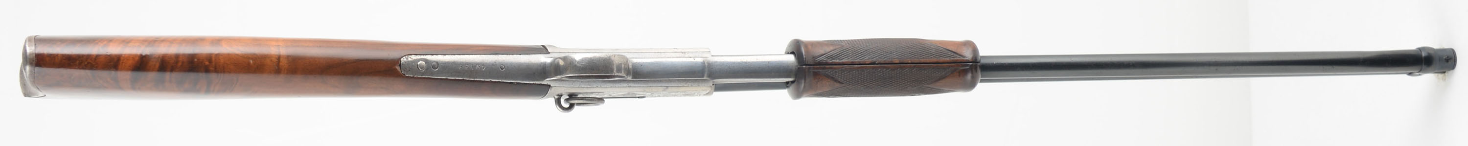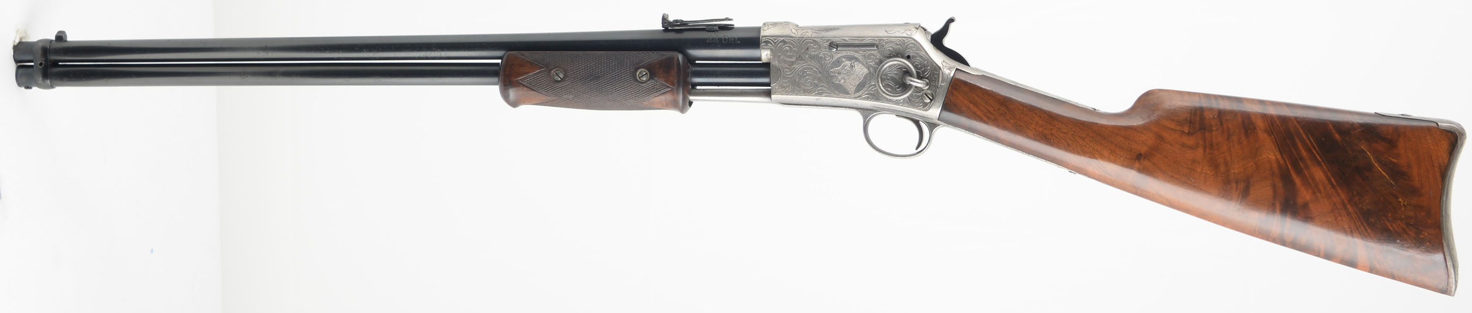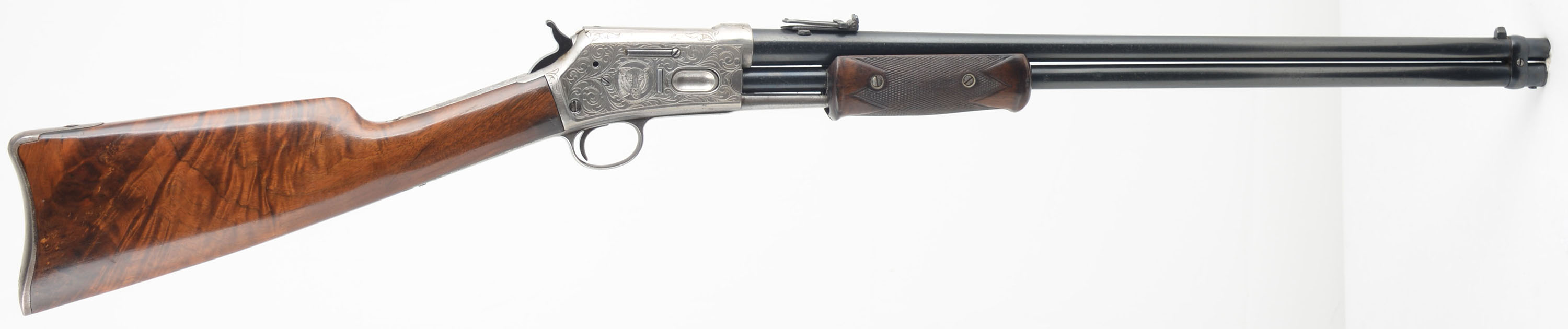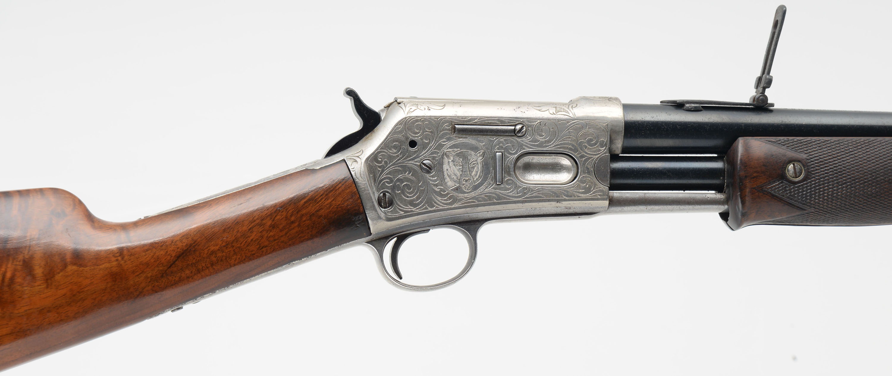 ENGRAVED Colt Lightning, Medium Frame, SADDLE RING, Marked 44 Cal., MFG: 1890, SN: 49138, Pump Action Rifle, 20 1/4'' Round barrel. This rifle was custom engraved & refinished. The original straight grip wood stocks are very good, with correct checkered forend & non-checkered stock. The stock has been sanded & refinished, displaying fantastic rippled & contrasting grain. The forearm appears to carry the original finish, with an added thin layer of finish. The stocks have minor scratches, nicks & contusions. The receiver, trigger guard, buttplate & forend sliding bar have all been polished & left in the white, with some remains of cleaned pitting. The receiver has been hand engraved with a scroll & fan motif, also featuring a bear on the right & boar on the left. The barrel & mag tub have been buffed & reblued, retaining approximately 80% coverage of the blue. There is cleaned pitting, abrasions, contusions & dents under the reblue, with additional spotting loss. Bore is fair, with spotty areas of cleaned pitting or roughness amongst rifling. The barrel holds a box blade front sight & a flip-up slide adjusting ladder sight. The rear ladder sight is mounted backwards & displays considerable pitting under the refinish. Buttstock carries a carbine style metal buttplate. Mechanically tries to lock-up in the rear cocking position & is loose or fails to lock up in the forward position after working the action. The rifle has not been test fired, may need some adjustment. Antique, No FFL Req. - Value: 1500 to 3000