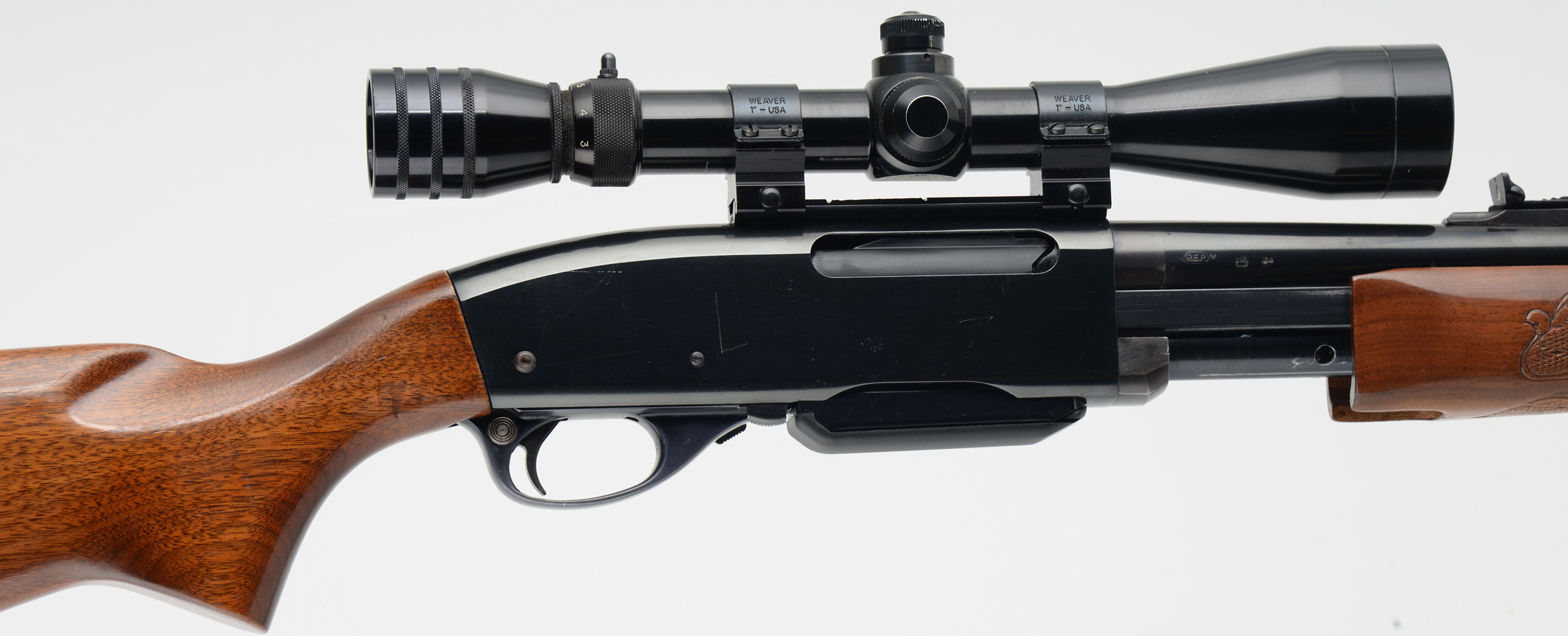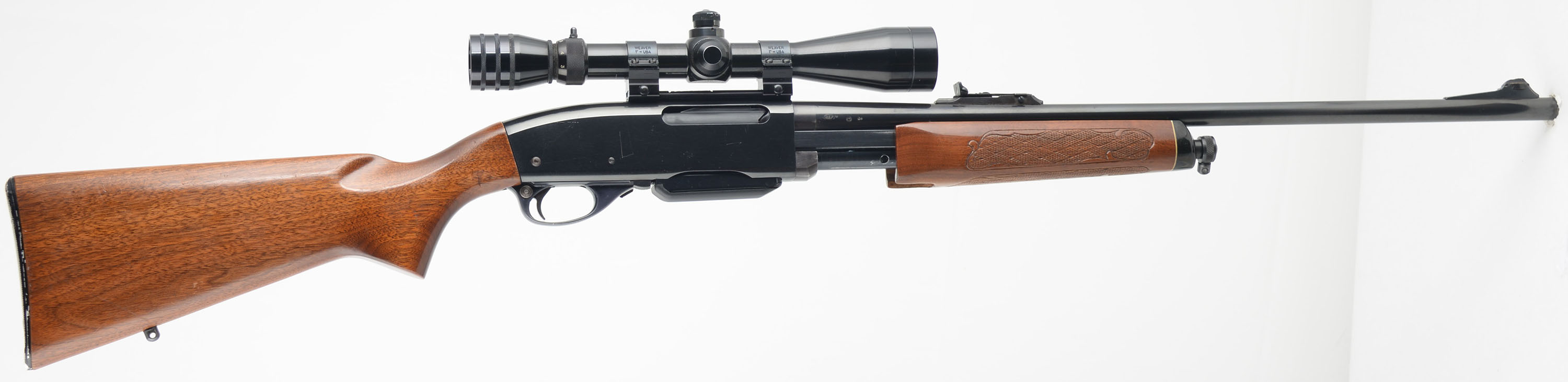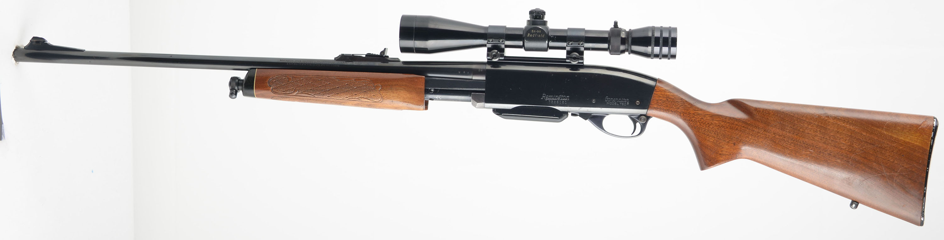 Remington, Model 760 Gamemaster, 243 WIN. Cal., MFG. 1972, SN: 7226121, Pump Action Rifle, 22'' round barrel, The Remington factory standard grade stock has a flat pistol grip, but no checkering. The factory skip-line checkered wood forend has the ebony tip. Both stock appear to carry their original finish & are excellent, but with some handling marks, scrapes & minor contusions. The original metal blue finish rates 85% overall, with some spotting on the left side of the receiver. The receiver carries a Redfield 3X-9X scope on Weaver ring, while the barrel carries an adjustable rear sight & a ramped blade front sight, missing the bead. Bore is excellent & bright. Stock carries a Remington alloy buttplate. Detachable mag. Sling stud provisions. A quality pump hunting rifle. FFL Req. - Value: 400 to 600