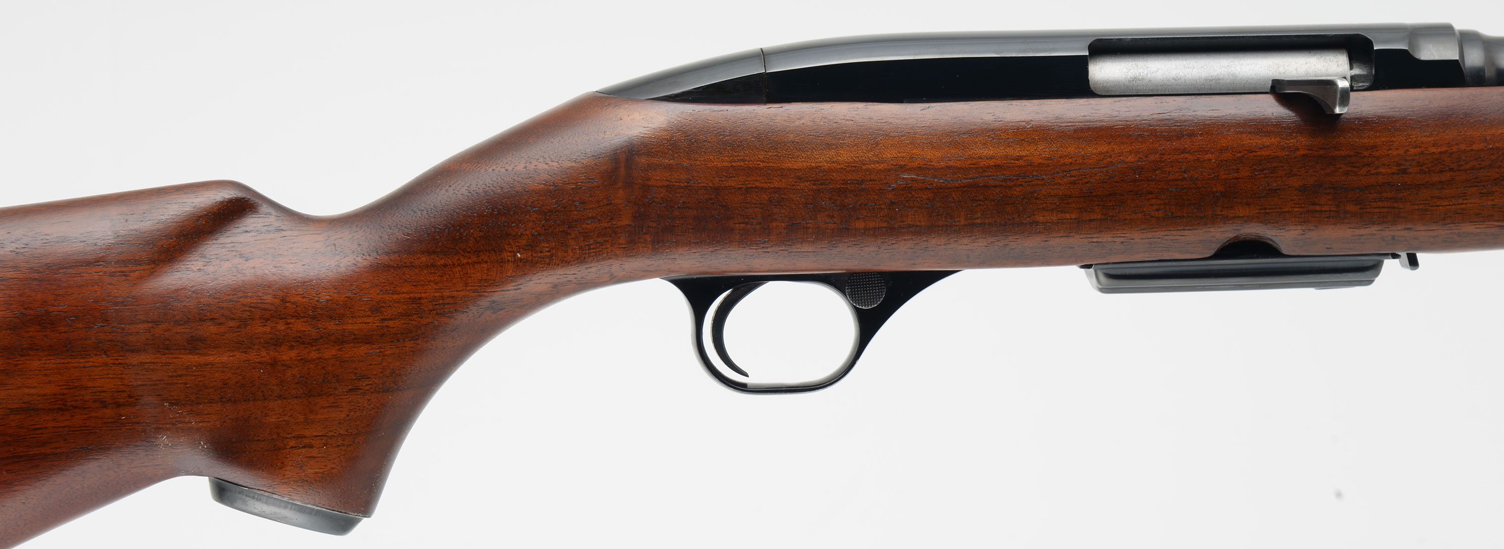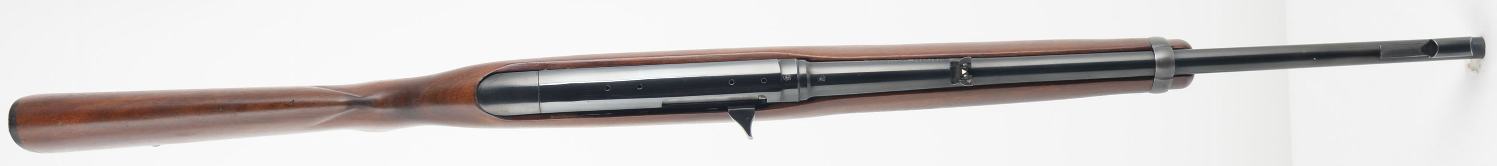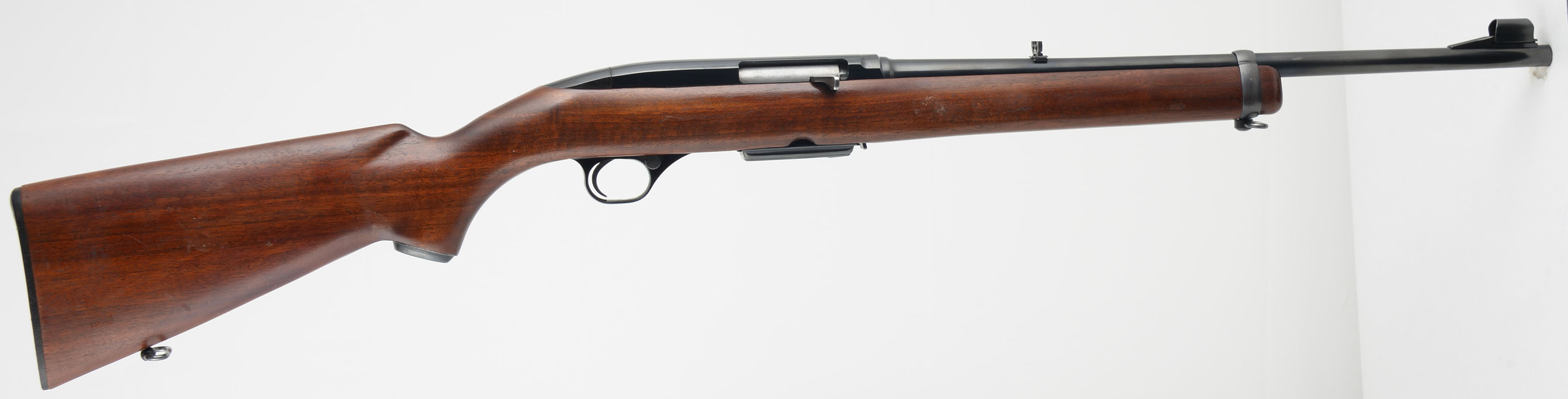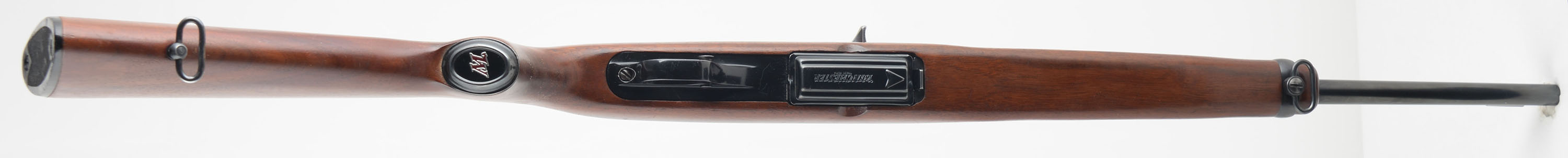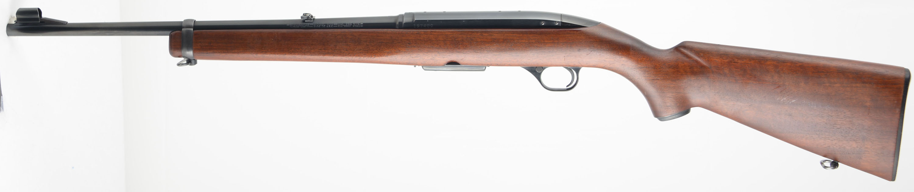 Winchester, Model 100 Carbine, marked Cal. 284 WIN, MFG. 1964-73, SN: 157400, Semi Auto Rifle, 19'' Round barrel. The original metal capped pistol grip stock is excellent, with minor finish level scuffs or scratches to the original finish. The original factory metal blue finish rates 95% overall. Bore is excellent. Factory folding rear & hooded ramp front sights. Top of the receiver has four open factory holes from previous scope mounting. Original checkered black plastic buttplate. Original Winchester marked 4 round detachable mag. Sling swivels. Comes with the original & period correct instruction booklet. An overall excellent semi auto model 100 rifle. FFL or C&R Req. - Value: 400 to 600