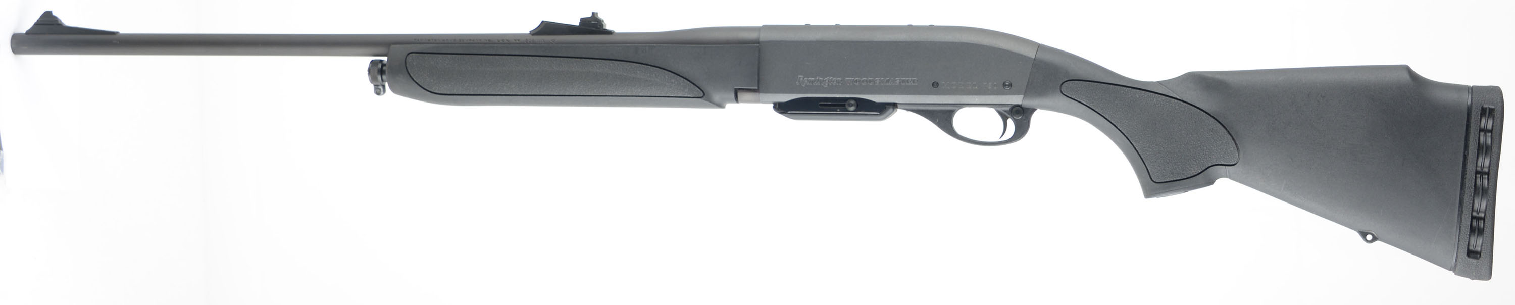 BOXED Remington, Model 750 Woodsmaster, CAL: 308 WIN, MFG: Modern, SN: D8016992, Semi Auto Rifle, 22 1/2'' barrel. The original flat pistol grip, black synthetic stocks are excellent, with textured grip panels. The original matte metal finish rates 100% overall. Bore is excellent. The barrel holds factory sights. Stock carries a Limb Saver rubber recoil pad. Comes in the original box, with a second detachable mag, still sealed in packaging, trigger lock & paperwork. Sling provisions. Overall excellent & original condition, FFL Req. - Value: 500 to 1000