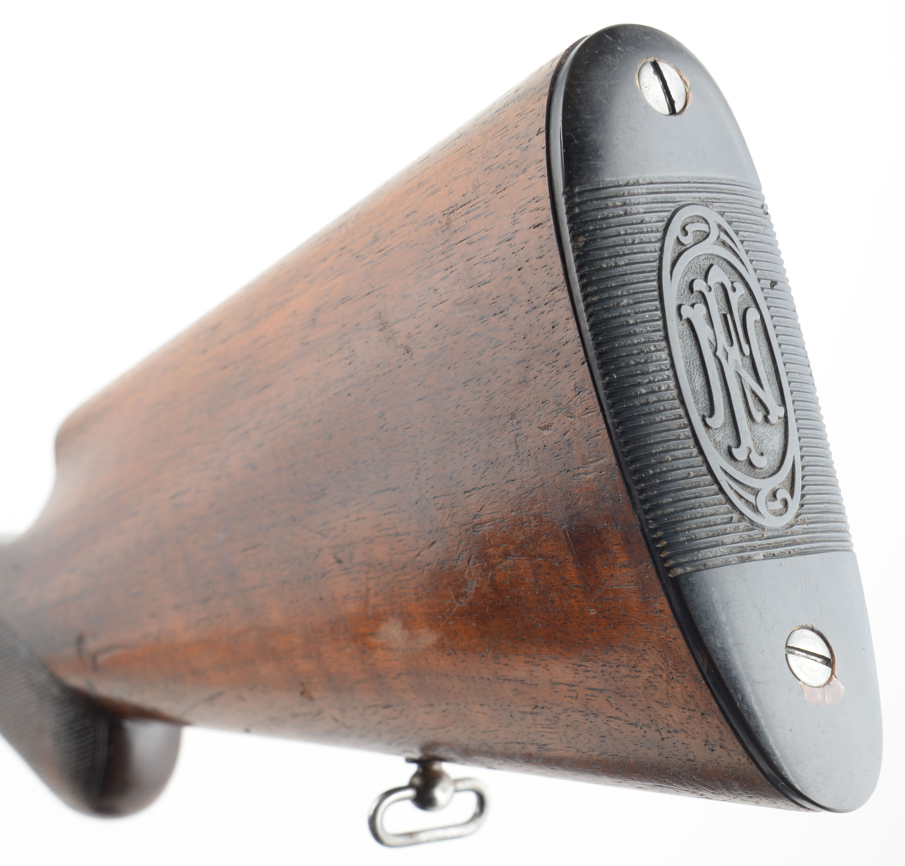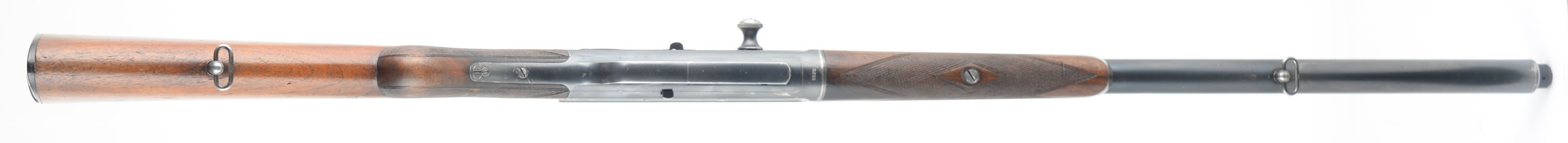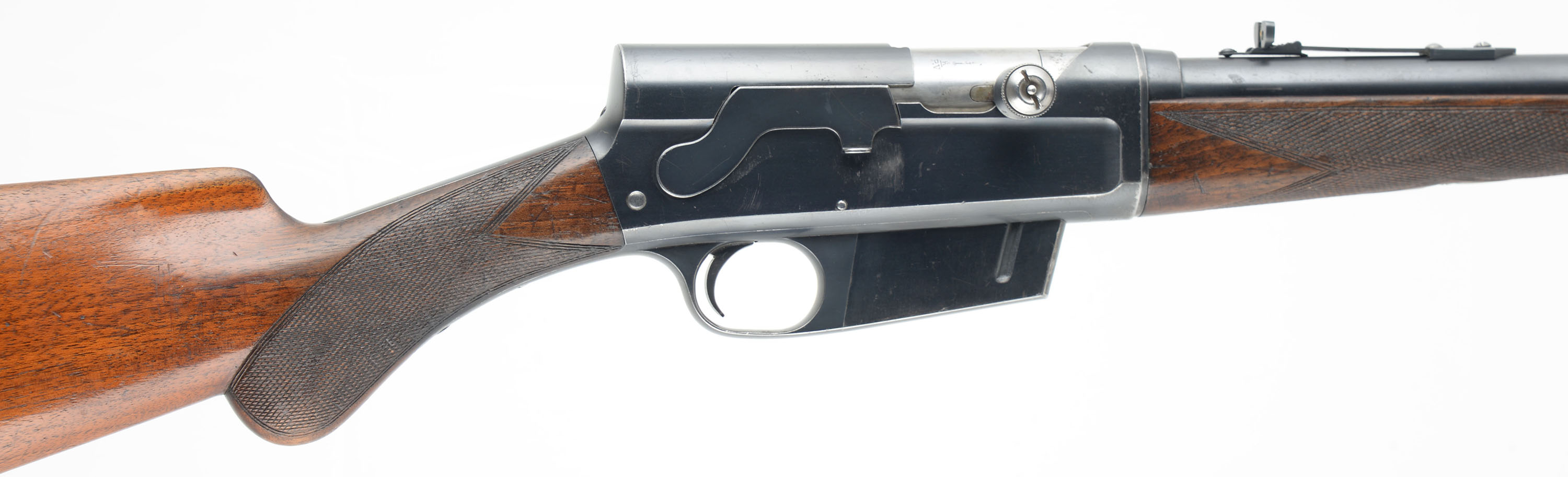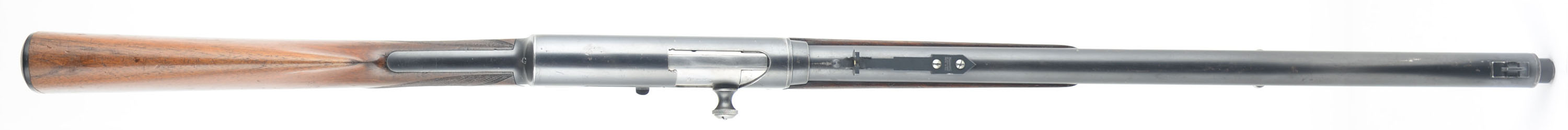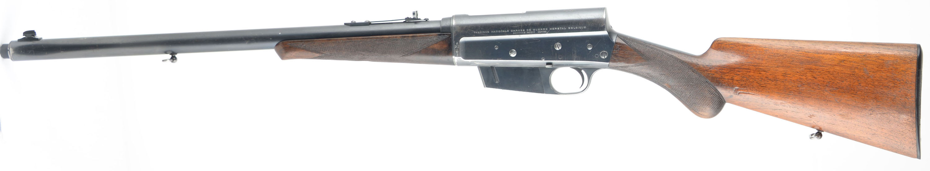 RARE FN (Fabrique Nationale), Model 1900 No-Rib Variation, .35 Rem Cal., MFG. 1910-36, SN: 2011, Semi-Auto Rifle, 22'' barrel, In Belgium it was known as ''La Carabine Automatique Browning'', in Germany it was the ''Selbstladebchse Browning Kaliber 9mm'', but in the U.S. we know it simply as the F.N. 1900. Records indicate only 4,913 Model 1900's were ever produced. While records indicate 2909 rifles were produced for the years 1910-21, with no allocation to a particular year during that time, it is likely that SN 2011, a mid 1910's production rifle. This rifle, invented by John Browning, was one of Europe's first successful semi auto high-power rifle. FN obtained the rights to produce the rifle as early as 1902, however, they chose to focus their production efforts on the A5 shotgun, which they acquired production rights to at the same time. They correctly viewed greater consumer sales potential in the A5. By 1904 restrictive importation tariffs into the U.S. caused Browning to negotiate with FN to allow manufacture of his shotgun within the U.S. The Remington Arms Co. was eager to work with John Browning & acquire the rights to manufacture both his autoloading shotgun & his autoloading rifle. FN was first to introduce the long-recoil shotgun (A5), but it was Remington that first produced John Browning's long-recoil rifle in 1906, dubbed the ''Autoloading Rifle'' or more commonly known today as the Model 8. If the Remington Model 8 is the grandfather of American semi-automatic sporting rifles, the F.N. 1900 is its European twin. The FN model 1900 was marketed throughout the world except the U.S., while the model 8 was intended for the U.S. market. Production comparisons place the model 8 at around 70,000, nearly a 14 to 1 difference. Since the FN was not sold in the U.S. market, few examples of the limited 4913 total produced are found amongst collectors in the U.S. It is known that some were vet bring-backs from two World Wars & at least a few were imported by Val Browning into the US. Since the FN was exported to Canada, some have made their way south of the border. Regardless of how they arrived, they are rare & very desired amongst Remington 8 & 81 collectors. Produced with old-world craftsmanship, these rifles are a testament to Fabrique Nationale's word-wide reputation for manufacturing high quality firearms. It doesn't take long to notice there were probably more hours of labor involved in producing the FN over the Remington. A close inspection & disassembly of both rifles will reveal a significantly superior fit & finish with the Belgium made version, even over early production Model 8s. The FN came in two versions, neither of which were a higher grade than the other. One version, the most common, had a solid barrel rib running the length of the jacket, the other rarer variation had a standard barrel jacket like the Model 8 with no rib. This example is one of rarer mid production variations without the rib. These take-down rifles were often broken down into the 22'' & 20'' halves & placed into travel cases. The rifle has an English walnut round knob pistol grip stock & schnabel tip forend. Hand cut factory checkering is 20 lines-per-inch, with the early 1st style forearm checkering pattern. All hand fit & assembled. To that point, stocks do not always interchange one rifle to another & factory LOP can vary by as much as a full inch. The stocks original condition is excellent, with thinning finish wear, minor handling scuffs, scratches & contusions. The original metal blue finish is approximately 85% overall, with blue thinning at the carry points of the receiver & barrel, along with some minor scratches & abrasions. The left side of the receiver carries the factory roll stamp & proof markings. Bore is very good. Barrel is fitted with a Marble's rear sight & Marble's 37M elongated blade front sight. Original FN buttplate. Factory sling loops. Tight smooth action & functions as it should. An overall excellent & eye catching example of this rare & highly collectible mid production rifle. FFL or C&R Req. - Value: 3000 to 5000