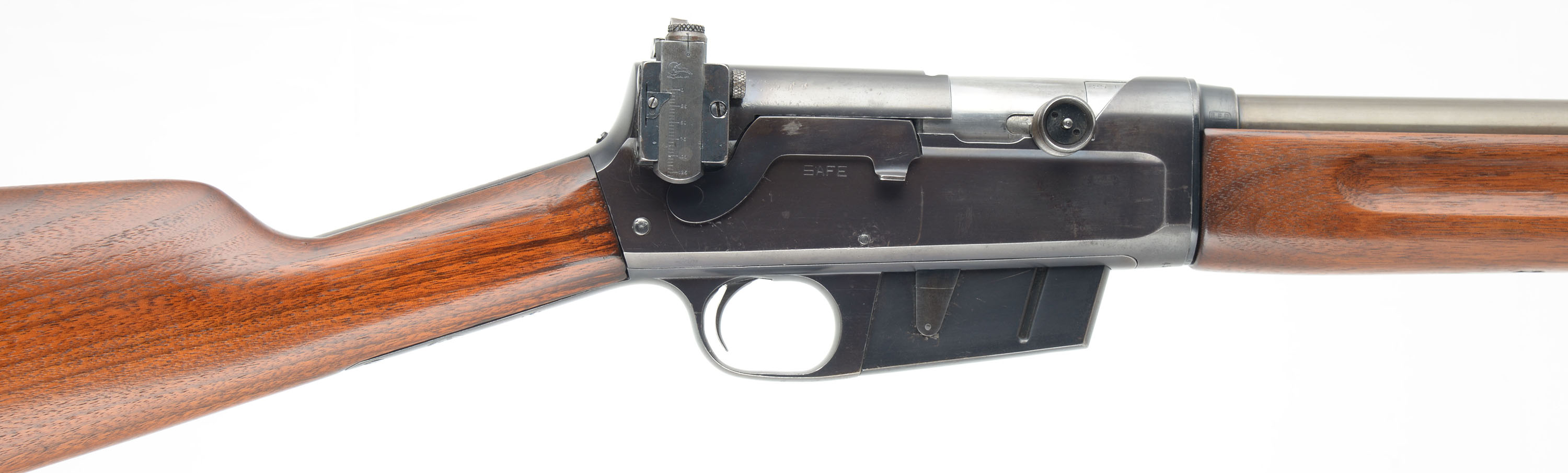 EXTREMELY RARE Remington, Model 8, TRIALS RIFLE, .25 Rem Cal, MFG. 1920, SN: 45616, Semi-Auto Rifle, 22'' barrel. This isn't just any Model 8, this one of the very Rare U.S. Trials models! In 1921, the Army Infantry School at Fort Benning received 25 Model 8 rifles chambered for .25 Remington. Warfare was evolving at the time, & the U.S. needed rifles to test the viability of a semi-automatic platform. While the model 8 was not developed nor intended for actual combat, these rifles were upgraded for testing & the development of tactics & military doctrine of a semi-auto rifle. The rifles were upgraded in collaboration with Springfield Armory with upgraded sights & a lengthened military style grooved forend with sling swivels. The barrels were provided without rear sight provisions, as the rear sight was to be the Lyman 48 aperture peep sight. The book ''The Great Model 8'' by John Henwood lists the serial range for these rifles as 42200 to 45737 for known examples. This one falls within the later portion of that range. The original straight grip stock & forend are excellent, with both appearing to have been lightly sanded & nicely finished. There remain very few tiny handling or wear marks, with the exception of one larger scrape/contusion just above the sling loop on the right side of the stock. The original metal blue finish on the receiver rates 70%, toning a bit plum as it thins. The finish on the barrel has evenly wore or simply faded to a thin brown patina. Bores on any Model 8 rifle in 25 caliber are rarely great for whatever reason, however the bore on this rifle maintains an excellent bore. The rifle carries the correct Lyman 48 aperture peep sight & the special customized tall blade front sight mounted on a raised base. The buttstock carries a vintage Red Duck ventilated recoil pad, which required a small wood inlay into the toe to fill the void where the lower tang would have been on the original crescent metal buttplate. The stocks carry the original sling loops which are unique to the trials rifle. 5 round fixed magazine. Tight action. This is a rare opportunity to purchase the rarest variation of the Remington 8 & 81 family, & the Holy Grail to enhance any Remington collection.* FFL or C&R Req. - Value: 10000 to 15000