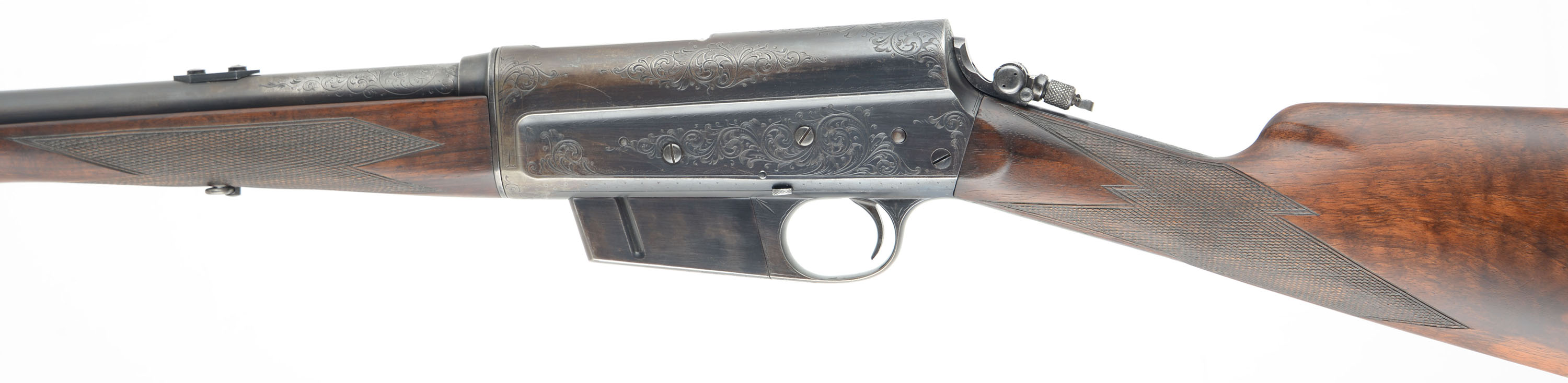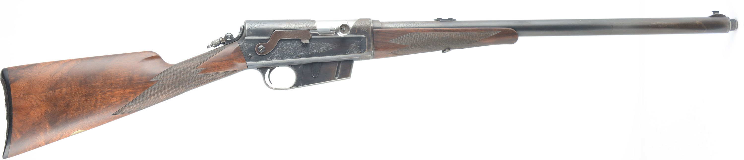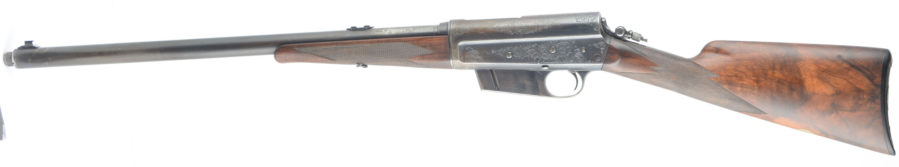 RARE & ENGRAVED Remington Custom Shop Rifle, Model 8 ''D'' Grade, .35 Rem Cal, MFG. 1910, SN: 20637, Semi-Auto Rifle, 22'' barrel. This rifle, invented by John Browning, was America's first successful semi auto high-power rifle. These take down rifles were often broken down into the 22'' & 20'' halves & placed into travel cases for train rides to countryside hunts & shoots. This special order custom shop rifle has a straight grip, high grade English walnut stock & forearm. Stocks are excellent, with wonderful figure to the grain & factory hand checkering at 22 lines-per-inch. Special ordered with a blank gold medallion in the belly of the stock for initials, typically found on the higher ''F'' grade rifles. There is a small group of small chatter contusions near the toe, with virtually no other marks to the excellent finish. The original metal blue finish rates 70% overall, The receiver side panels are covered with what Remington marketed as ''rich scroll hand engraving''. Engraving is also found on belly of magazine, trigger guard, tangs & barrel jacket. Bore is excellent. Fitted with a Lyman tang sight, a Marble's rear sight blank & blade front sight. Stock carries the original checkered Remington plastic buttplate. 4 round fixed magazine. Tight action & functions as it should. A beautiful & rare engraved rifle in the very popular to hunt with 35 Rem caliber. FFL or C&R Req. - Value: 3500 to 6500