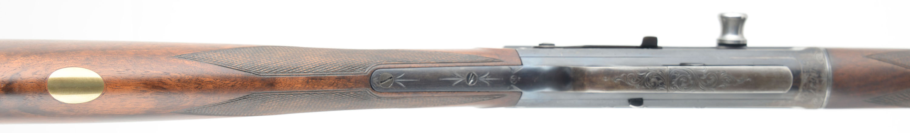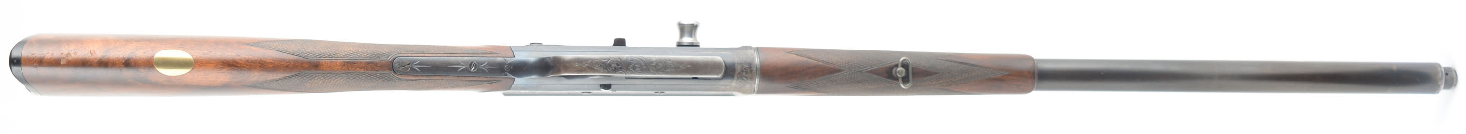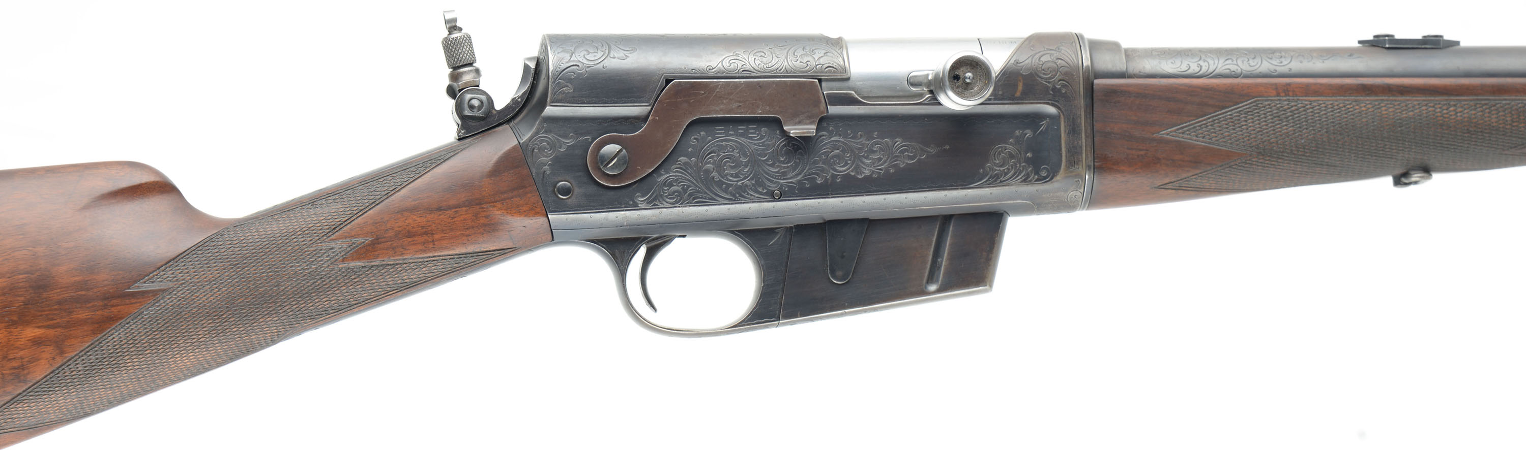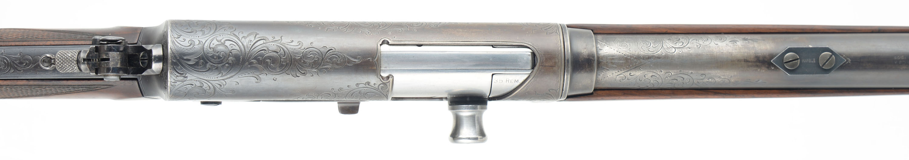 RARE & ENGRAVED Remington Custom Shop Rifle, Model 8 ''D'' Grade, .35 Rem Cal, MFG. 1910, SN: 20637, Semi-Auto Rifle, 22'' barrel. This rifle, invented by John Browning, was America's first successful semi auto high-power rifle. These take down rifles were often broken down into the 22'' & 20'' halves & placed into travel cases for train rides to countryside hunts & shoots. This special order custom shop rifle has a straight grip, high grade English walnut stock & forearm. Stocks are excellent, with wonderful figure to the grain & factory hand checkering at 22 lines-per-inch. Special ordered with a blank gold medallion in the belly of the stock for initials, typically found on the higher ''F'' grade rifles. There is a small group of small chatter contusions near the toe, with virtually no other marks to the excellent finish. The original metal blue finish rates 70% overall, The receiver side panels are covered with what Remington marketed as ''rich scroll hand engraving''. Engraving is also found on belly of magazine, trigger guard, tangs & barrel jacket. Bore is excellent. Fitted with a Lyman tang sight, a Marble's rear sight blank & blade front sight. Stock carries the original checkered Remington plastic buttplate. 4 round fixed magazine. Tight action & functions as it should. A beautiful & rare engraved rifle in the very popular to hunt with 35 Rem caliber. FFL or C&R Req. - Value: 3500 to 6500