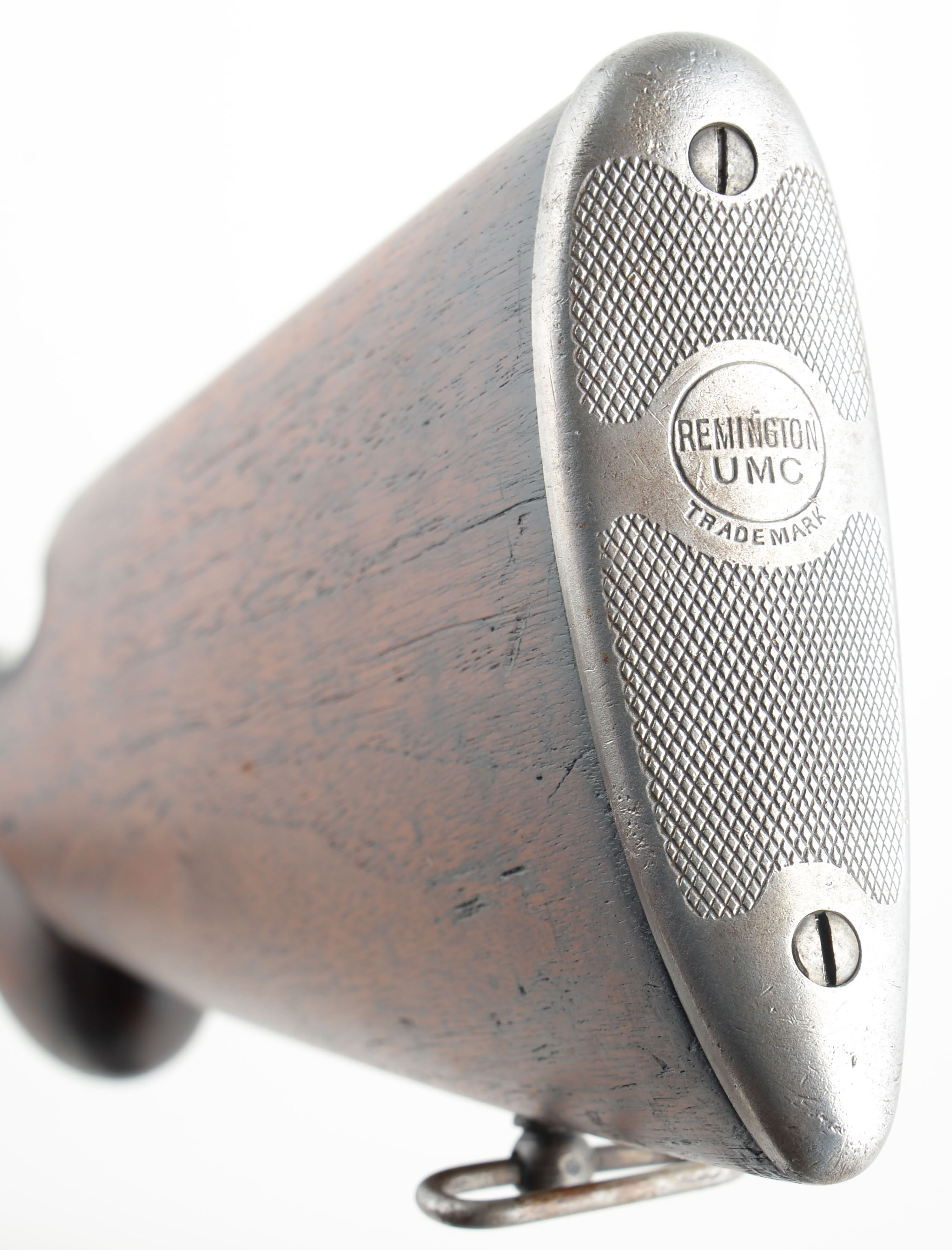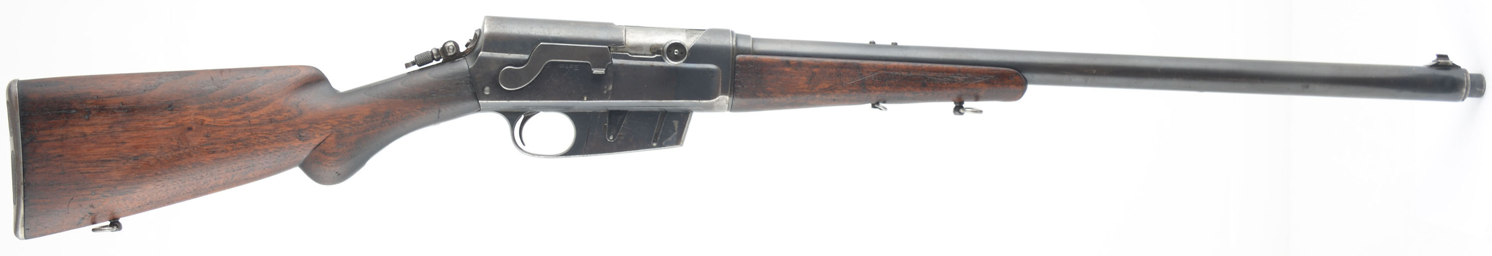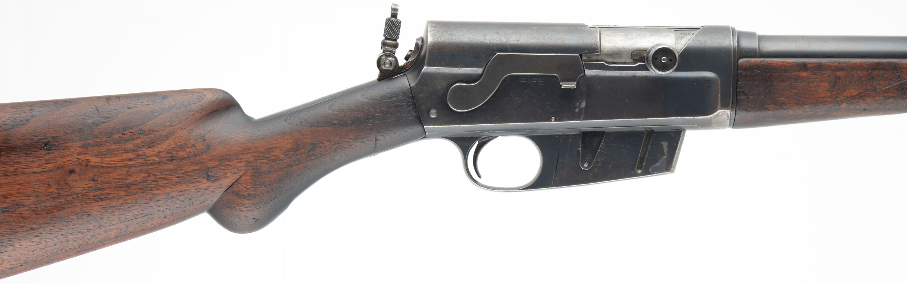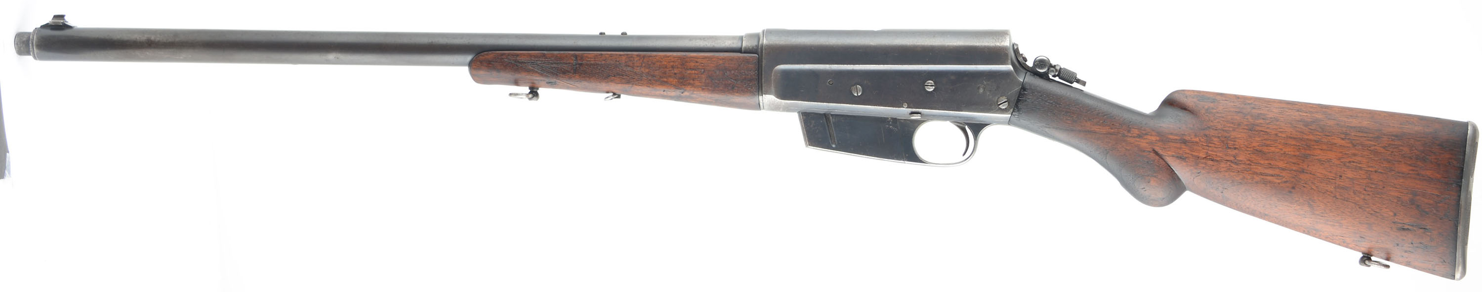 Remington, Model 8 Semi-Deluxe, 30 REM CAL, MFG. 1915, SN: 35818, Semi-Auto Rifle, 22'' barrel. The original round knob pistol grip wood stocks are very good & solid. The hand checkering on the forend has worn thin & smoothed many of the lines, but about half the lines remain visible. The stock has been sanded & reoiled, with the wear & sanding having removed the checkering if it was present previously. The inside of the forend is not stamped with a ''3'' or ''C'' for grade confirmation, which in this case leads to the assumption that this is a special order ''A'' grade that was factory upgraded with checkering, costing the customer an additional $5 at the time of ordering. Sometimes collectors refer to these ''A'' grade rifles with factory checkering as deluxe or semi-deluxe rifles. This rifle does displays a bit of wave to the grain & does carry 20 lines per inch checkering with borders. The original finish on the forend has worn away & has been reoiled, which has darkened the wood. There are several minor scrapes, scratches & contusions to the stocks. The original metal blue finish remains at 60% overall, with loss due to wear & density thinning developing a thin brown patina. The receiver carries a Lyman tang sight, while the barrel has filler screws in the rear sight provisions & a standard front blade sight. Bore is very good, with strong rifling. The left side of the barrel carries not only the manufacture date stampings, but a repair codes from where the rifle was returned to the factory for unknown repair or upgrade. These repair stampings typically are a 3 or 4 digit code ending in ''3'', in this case ''BT3''. Stock carries one of the rarest of the buttplate options, the checkered reverse teardrop Remington UMC metal buttplate. 5 rd fixed magazine. Period sling loops in the stock & forend. Smooth tight action. A rarer checkered rifle that has seen some time in the woods, but remains a good example of a special ordered hunting rifle. FFL or C&R Req. - Value: 600 to 1000