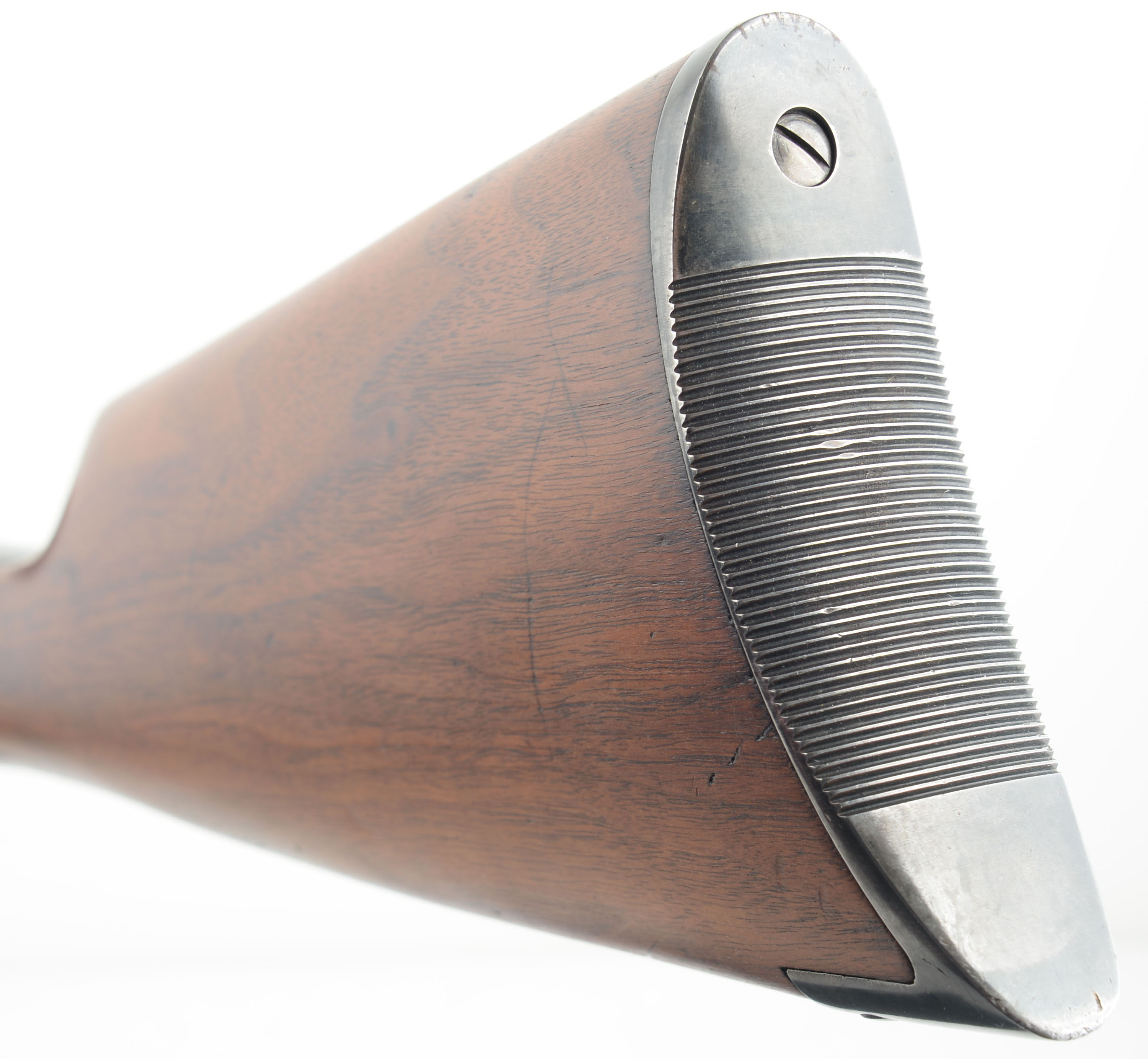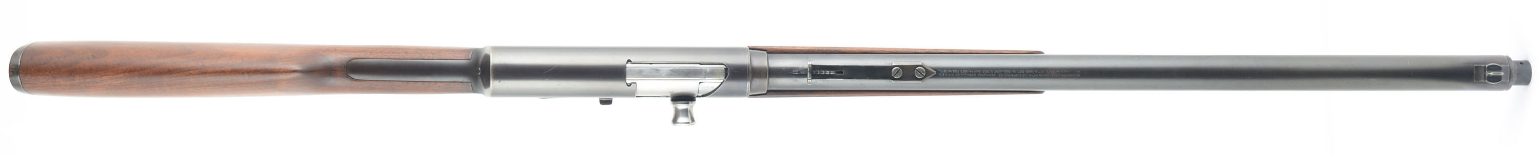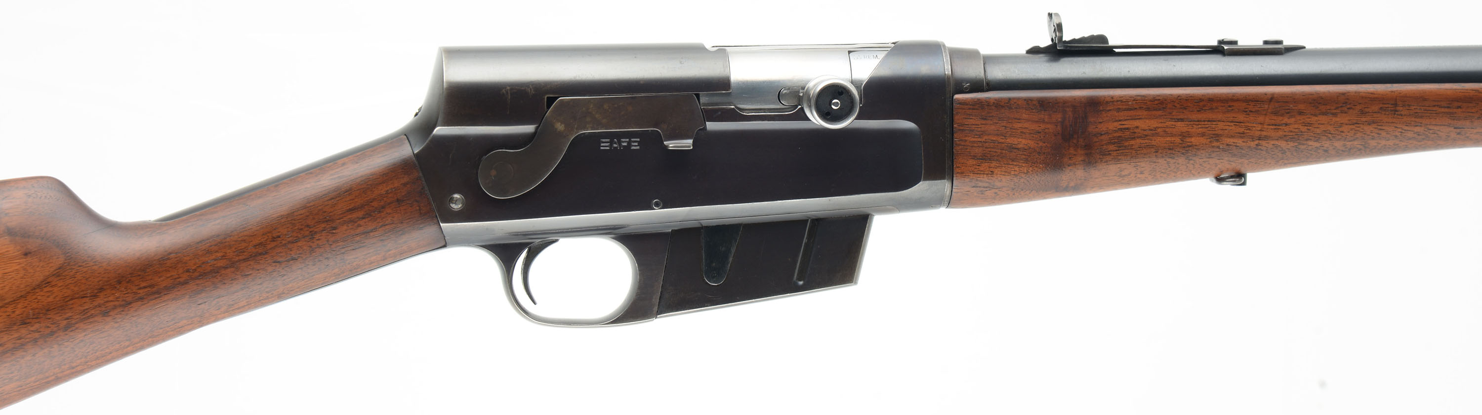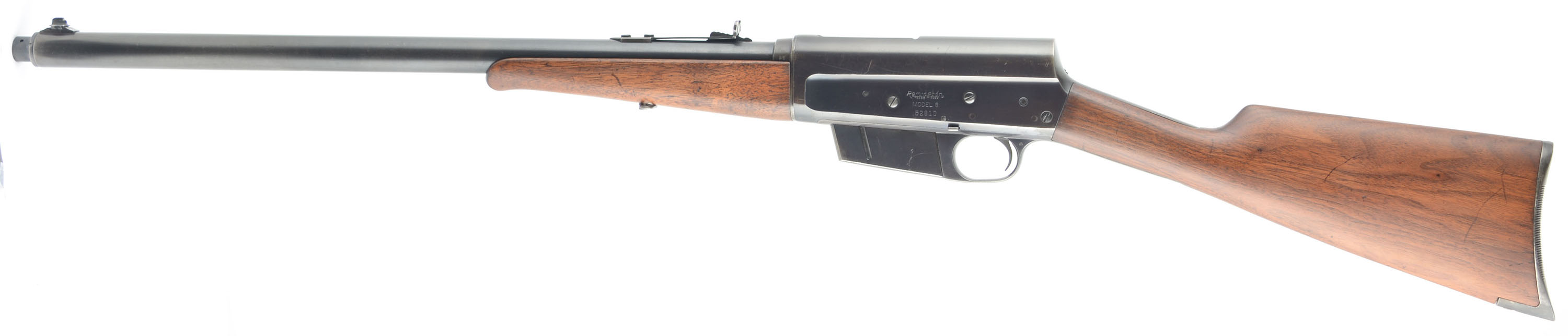 Remington, Model 8, .35 Rem Cal, MFG. 1926, SN: 52810, Semi-Auto Rifle, 22'' barrel. The original straight grip & schnabel forend stocks are excellent, having been cleaned, lightly sanded & an added layer of oil finish was placed over what remained of the original finish. There are still the remains of several minor scuffs, scratches & contusions to the wood & finish. The original metal blue finish rates 85% on barrel, 80% on the receiver, with the bluing toning a bit more to a plum brown on the receiver & mag. Bore is excellent. The barrel carries a standard adjustable rear sight & a Marble No. 6 blade front sight. Stock carries the bottom tang serrated crescent metal buttplate. 4 round fixed magazine. Tight smooth action. A very nice looking & good hunting rifle. FFL or C&R Req. - Value: 600 to 800