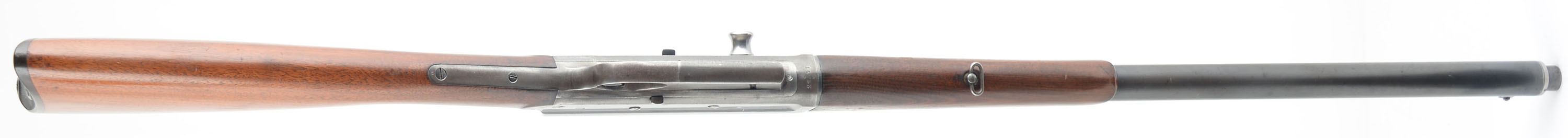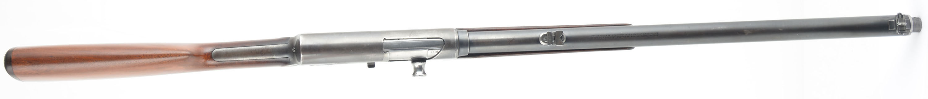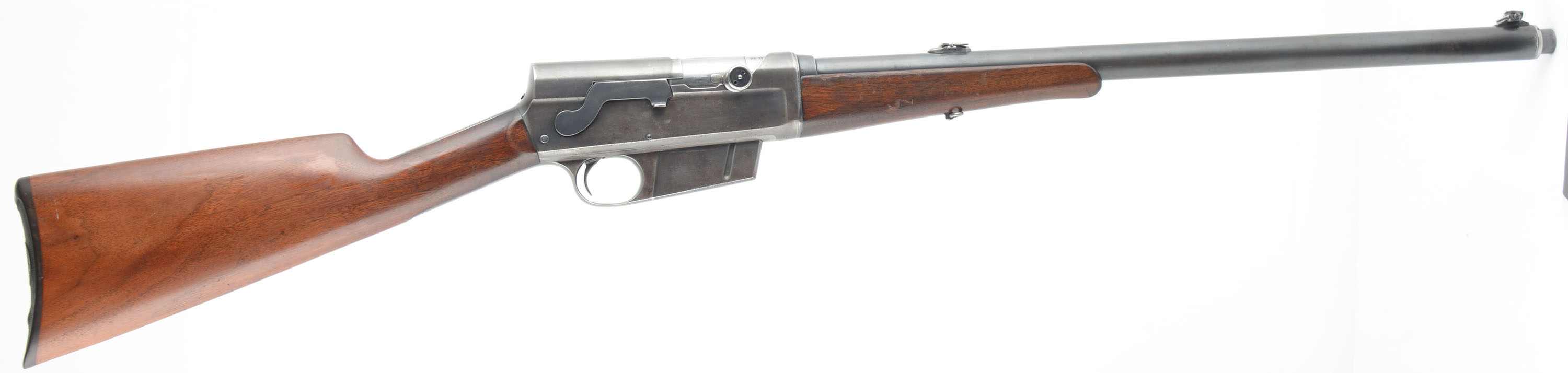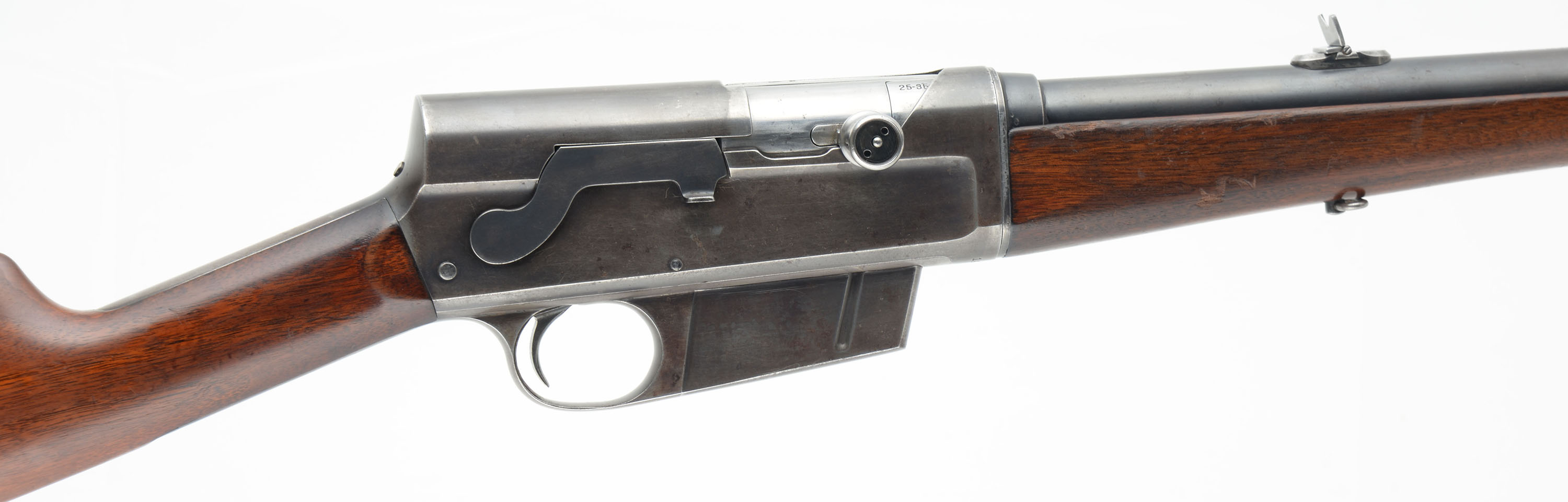 Remington, Model 8, .25 Rem Cal (marked 25-35 Rem), MFG. 1909, SN: 14733, Semi-Auto Rifle, 22'' barrel. Although this rifle fires a .25 Rem rimless cartridge, it carries the original early & rarer .25-35 caliber marking. Remington tried to utilize the 25-35 marking to take advantage of the popularity of Winchester's 25-35 caliber. They were quickly forced to change their caliber marking to .25 Rem on later examples, as these rifles would not accept the rimmed 25-35 cartridges. This makes this early caliber marked rifle even rarer than the fairly rare standard .25. The original straight grip & schnabel forend stocks are excellent, with both appearing to carry the original finish. There are a few minor scuffs, scratches & contusions to the wood, with the forend showing most of that wear & some thinning of the finish. The original metal blue finish rates 60% on the barrel, with the finish on the receiver evenly thinned or worn to an even thin gray/brown patina. Bore is very good. Barrel is fitted with a Lyman dual folding leaf rear sight on the early oval base & a very unusual unmarked horizontal or windage adjusting front blade sight. 5 round fixed magazine. Tight smooth action. The rare early caliber marking makes this rifle very collectible. FFL or C&R Req. - Value: 800 to 1200
