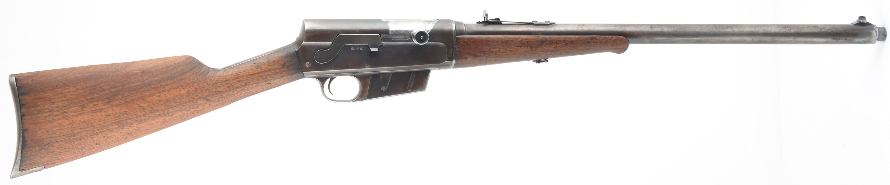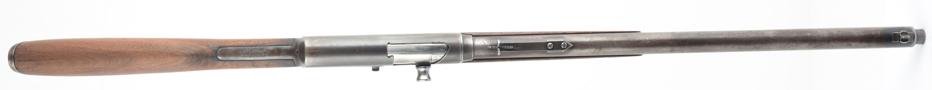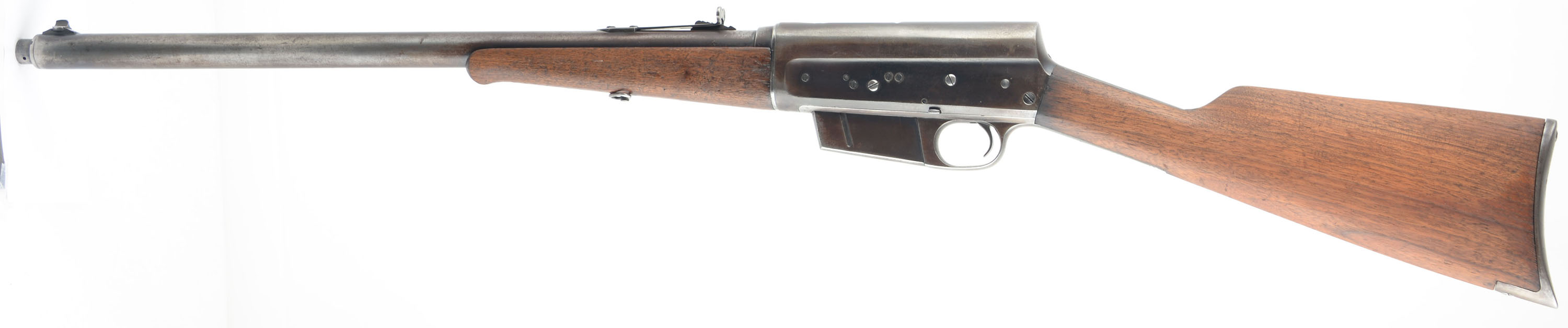 Remington, Model 8, .25 Rem Cal, MFG. 1923, SN: 48490, Semi-Auto Rifle, 22'' barrel. The original straight grip & schnabel forend stocks are good & solid, but with most of the original finish having been worn off or stripped from the wood. The stock may have also been lightly sanded, but both pieces of furniture retain several minor scuffs, scratches & contusions, more so found on the forend. The stock has two very short tight hairline cracks emanating from the end of the upper tang, plus a 2 1/2'' crack at the top of the comb emanating from the upper buttplate screw. The metal finish has worn & mostly thinned to a thin brown patina, with remnants of original blue remaining in more protected areas. There are four screw filled holes on the left side of the receiver from a previous scope mount. Bore is good, but with some areas of roughness amongst strong rifling. Barrel is fitted with standard adjustable rear & Lyman blade front sights. Buttstock carries a Remington UMC smooth lower tang crescent metal buttplate. 5 round fixed magazine. Tight action. This is one of the rarer calibers often sought by collectors. FFL or C&R Req. - Value: 500 to 800