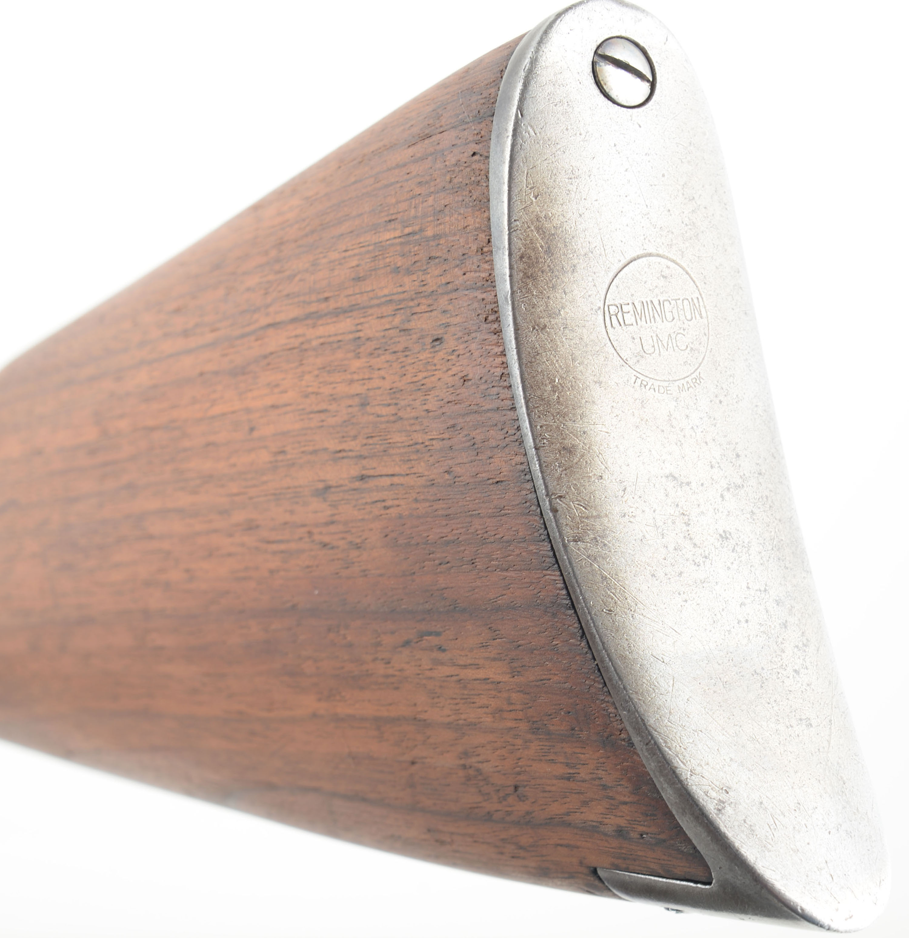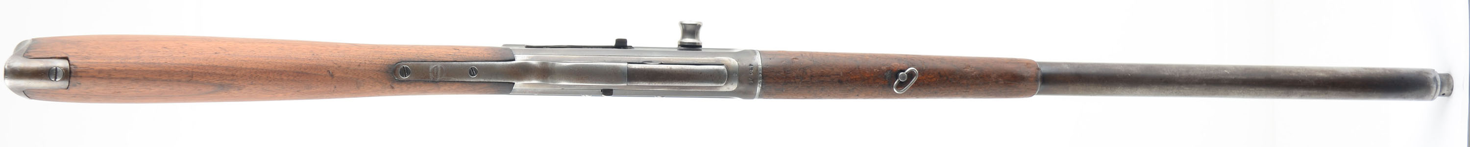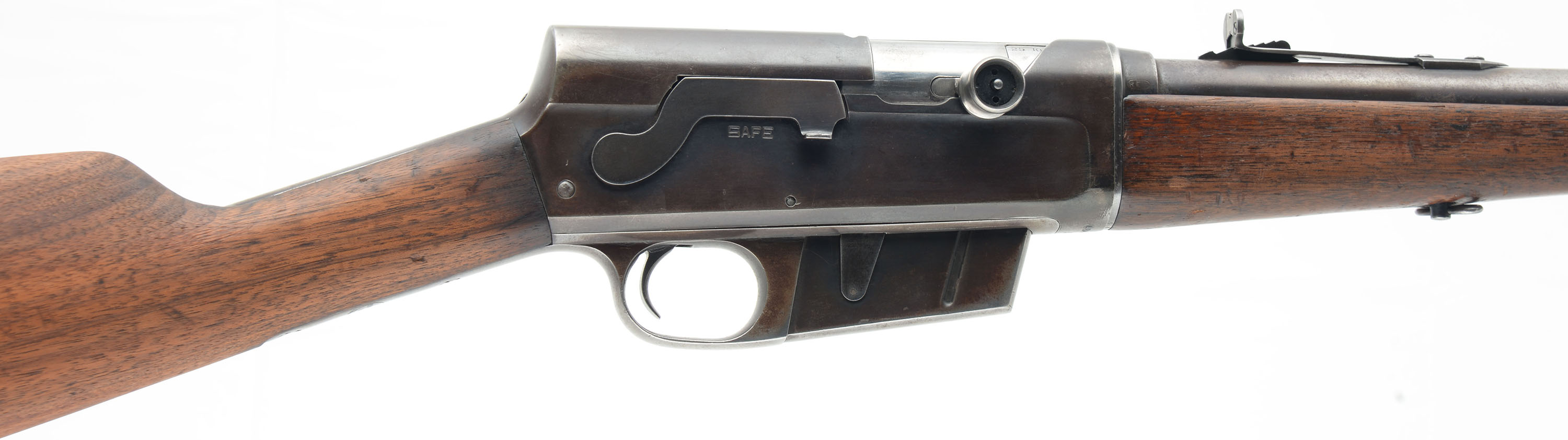 Remington, Model 8, .25 Rem Cal, MFG. 1923, SN: 48490, Semi-Auto Rifle, 22'' barrel. The original straight grip & schnabel forend stocks are good & solid, but with most of the original finish having been worn off or stripped from the wood. The stock may have also been lightly sanded, but both pieces of furniture retain several minor scuffs, scratches & contusions, more so found on the forend. The stock has two very short tight hairline cracks emanating from the end of the upper tang, plus a 2 1/2'' crack at the top of the comb emanating from the upper buttplate screw. The metal finish has worn & mostly thinned to a thin brown patina, with remnants of original blue remaining in more protected areas. There are four screw filled holes on the left side of the receiver from a previous scope mount. Bore is good, but with some areas of roughness amongst strong rifling. Barrel is fitted with standard adjustable rear & Lyman blade front sights. Buttstock carries a Remington UMC smooth lower tang crescent metal buttplate. 5 round fixed magazine. Tight action. This is one of the rarer calibers often sought by collectors. FFL or C&R Req. - Value: 500 to 800