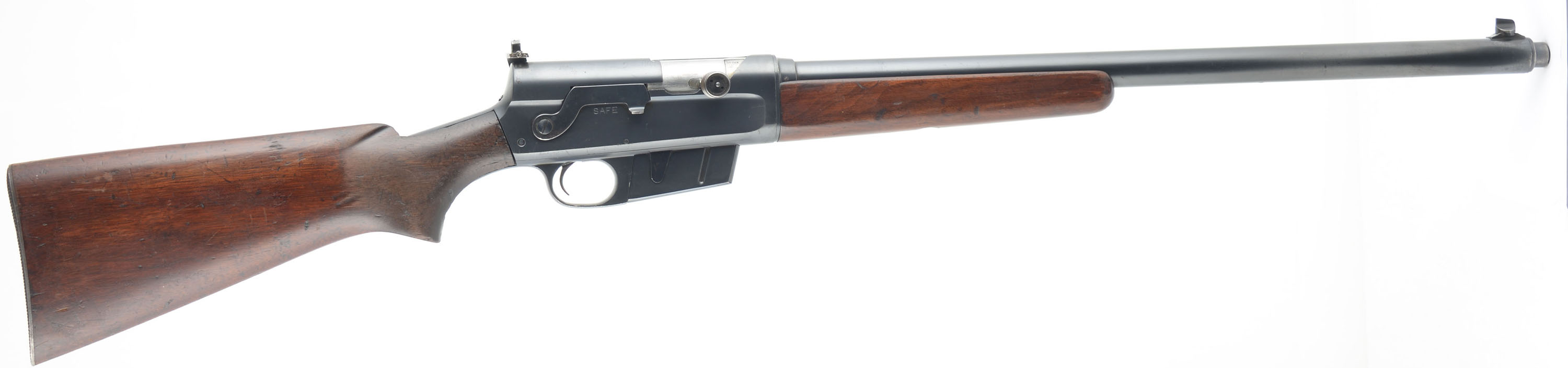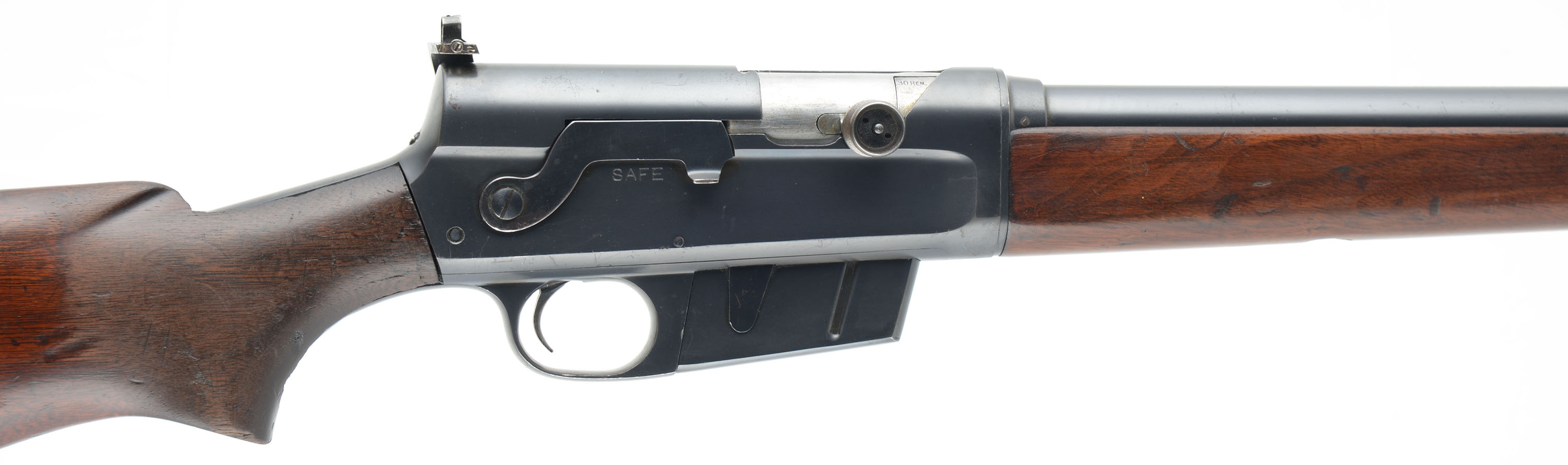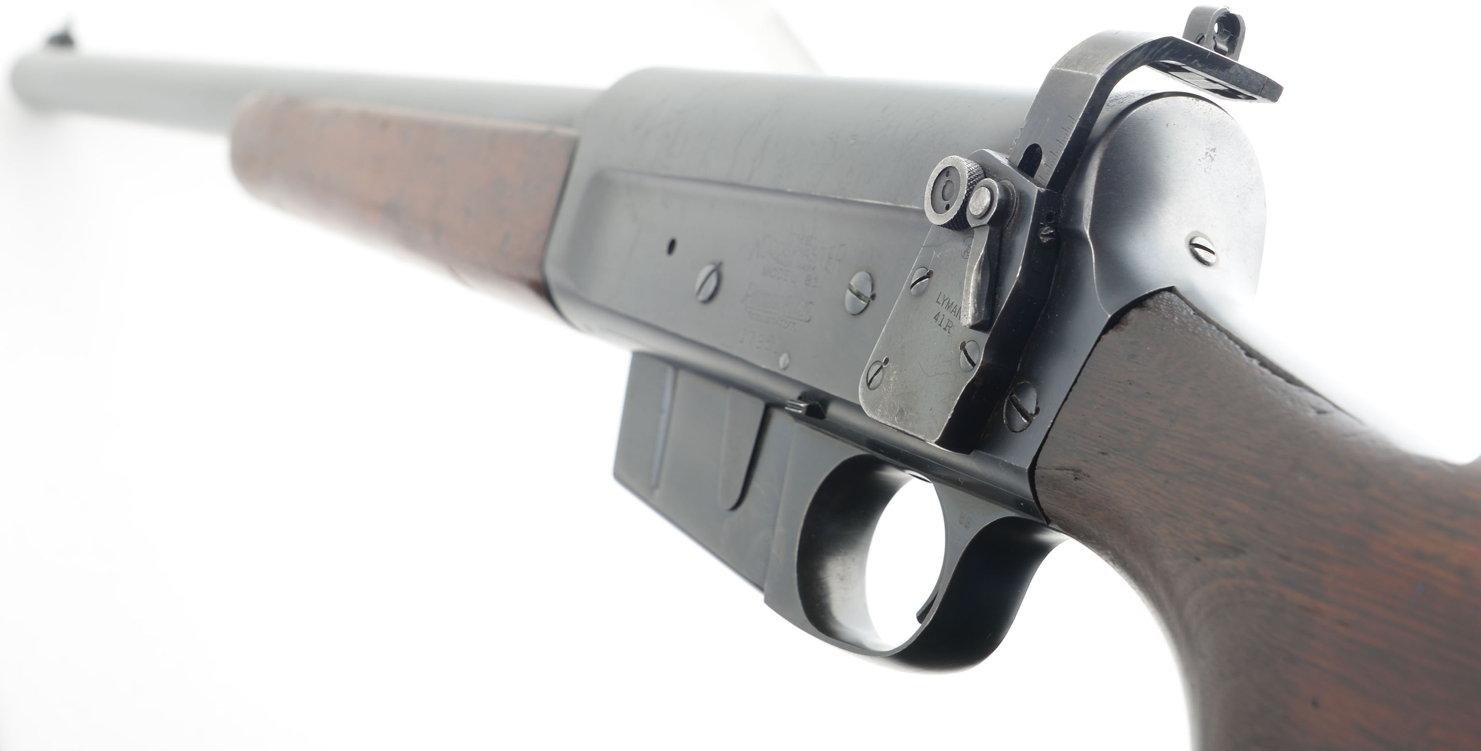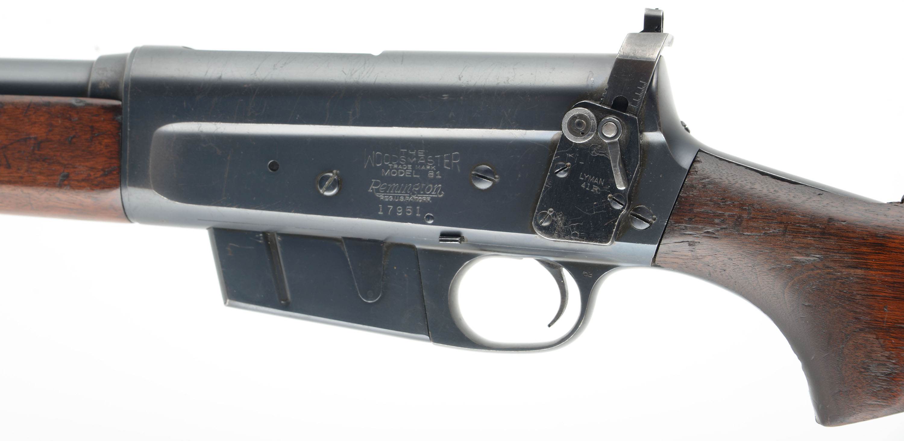 RARE Remington, Model 81 F.B.I. Rifle, .30 Rem Cal, MFG. 1942, SN: 17951, Semi-Auto Rifle, 22'' barrel. In mid 1938, Remington & the Federal Bureau of Investigation worked together to develop a replacement for the Winchester Model 1907s, that were then in service. The FBI had become dissatisfied with the .351 Self-Loaders & sought Remington to come up with an alternative service rifle that could produce similar ballistics, but function more reliably. The Model 81 FBI rifle was Remington's answer. An excellent history & production development of these rifles can be found in John Henwood's ''The Great Remington 8 & Model 81 Autoloading Rifles''. The FBI rifles, in actuality, was only a slightly modified version of Remington's production Model 81 rifle. Aesthetically, most would not notice the subtle differences that were made to the guns to meet the FBI requirements. That is why many a hunter or gun trader has owned, used & traded one of these rifles without knowing they had a surplused FBI rifle. There were actually two variations, the first more easily distinguishable, the later more closely related to a standard 81. Of the early type, the most prominent features are the unique receiver markings & the Lyman 41R receiver sight. Please take note that the Early-Type comes in two configurations. One was manufactured without rear sight holes altogether, only a smooth barrel jacket. Another configuration was manufactured with rear sight holes & a factory installed Lyman #12 rear sight-blank.