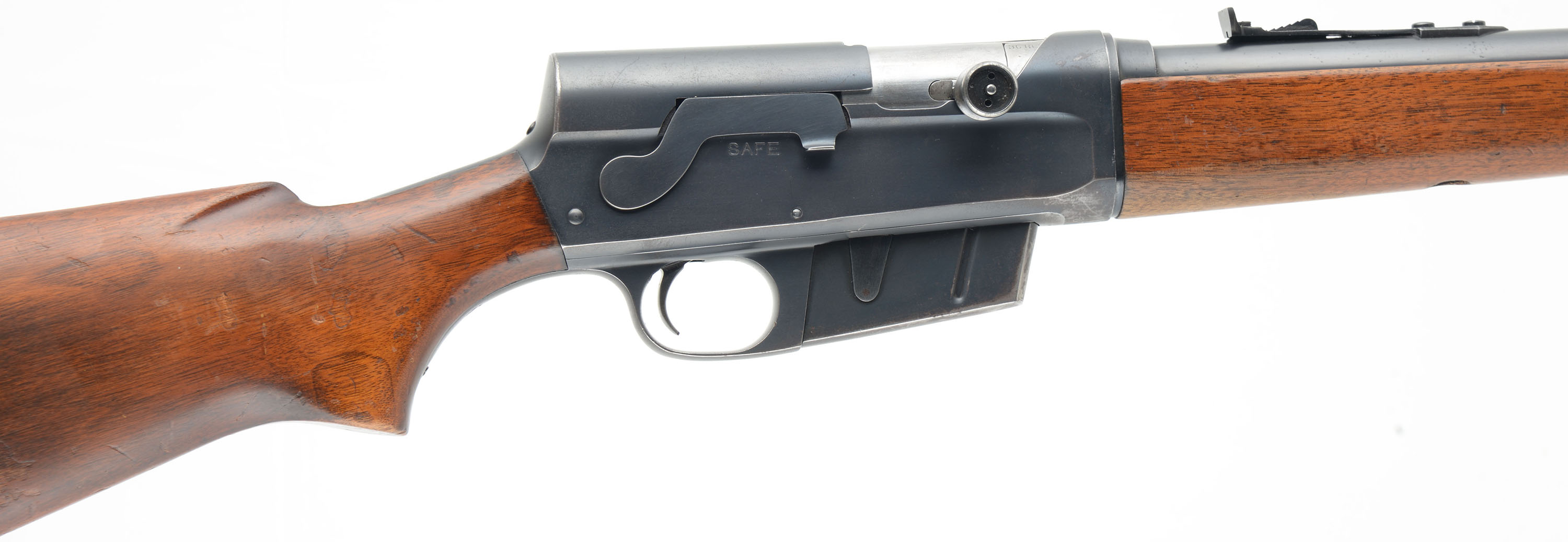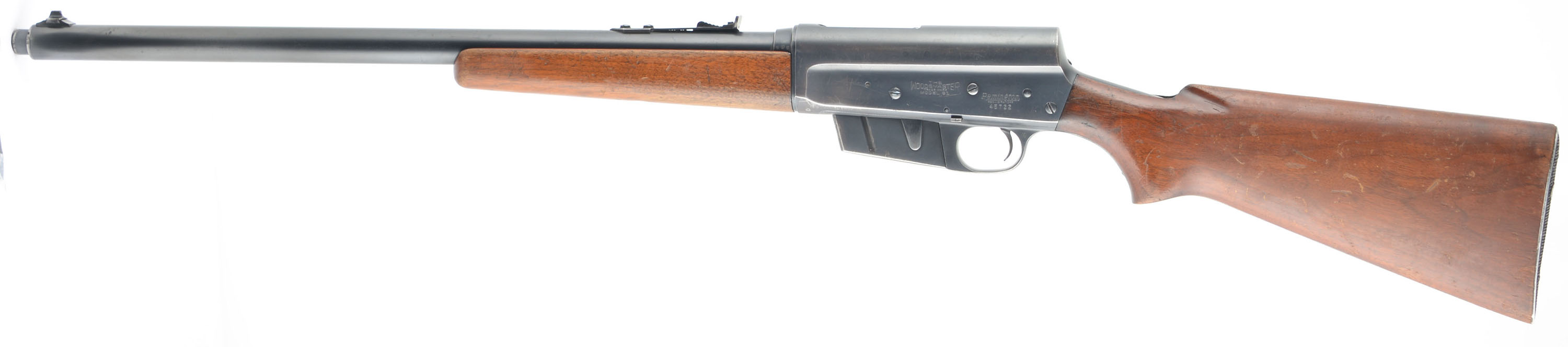 Remington, Model 81, 30 REM CAL, MFG. 1949, SN: 45722, Semi-Auto Rifle, 22'' barrel. The original flat pistol grip wood stocks are excellent, but with several minor to small scrapes, scratches, contusions, flaking & thinning to the original finish. The original metal blue finish rates 90% on the barrel, 80% on the receiver, with much of the wear loss located on the belly of the receiver & mag. The barrel carries standard rear & front sights. Bore is excellent. Stock carries the Remington checkered metal buttplate. 5 rd fixed magazine. A very nice original standard 81 rifle. FFL or C&R Req. - Value: 700 to 1000