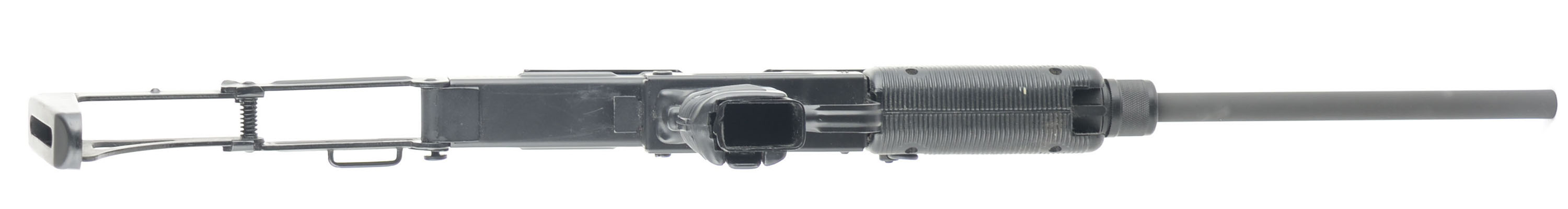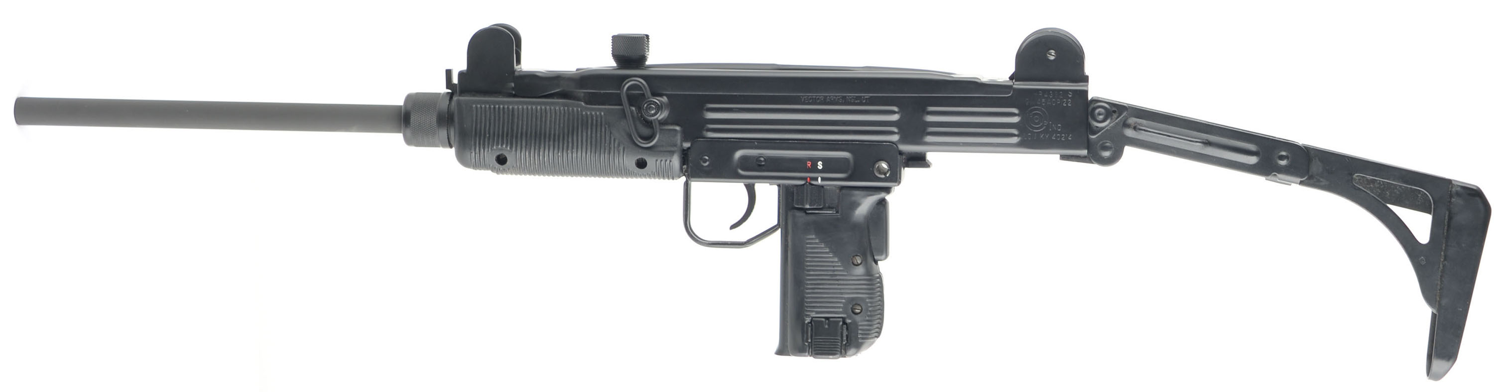 CONDITION: The grooved black polymer pistol grip & foregrip are excellent with a couple minor scuffs & light handling wear. Metal folding buttstock. The parkerized finish on the barrel rates 98% with a minor scuff. The black paint finish on the rest of the metal rates 97% with a few light scratches. The left side of the receiver is marked ''VECTOR ARMS. NSL. UT'', the rear left side of the receiver is marked ''HR4332S'', ''9mm/45 ACP/ 22'', ''GROUP IND'' in their logo, ''LOU KY 40214''. The right rear side of the receiver is marked with the S/N. The bore is excellent. The receiver holds a adjustable post front sight with protective ears, & a non-adjustable, aperture flip up L sight with 100 & 200 meter positions. The folding buttstock has carries no buttplate, but the shoulder end is grooved for better control. The gun appears to be in full working mechanical order. Comes with a 3'' dummy/display barrel, it is solid all the way through & is basically a barrel blank. It does mount to the gun, but it will not function with the firearm & is only for display purposes. Does not come with a mag. FFL Req - Value: 1200 to 2400