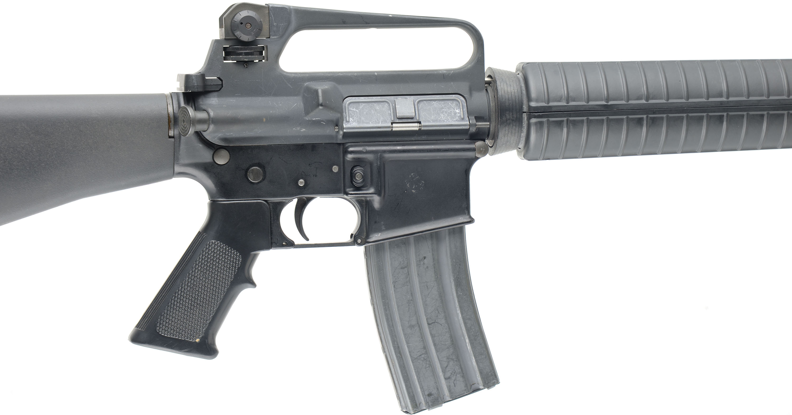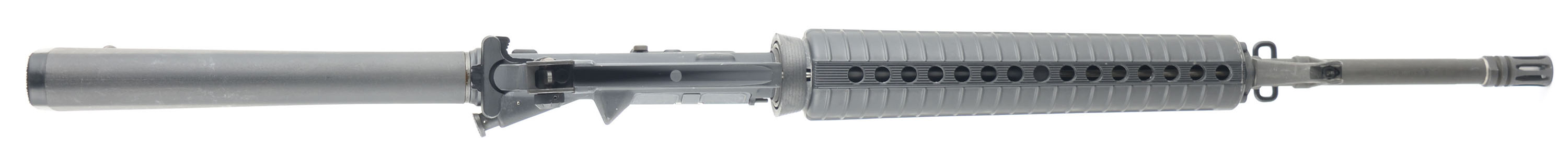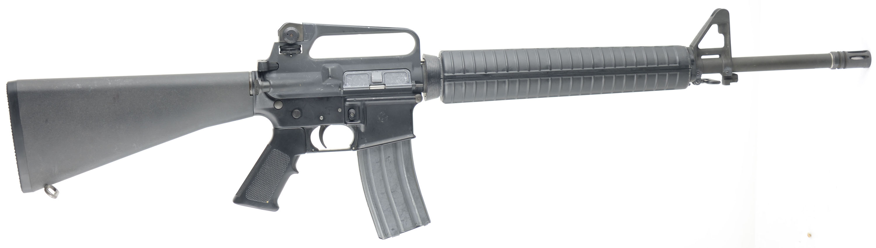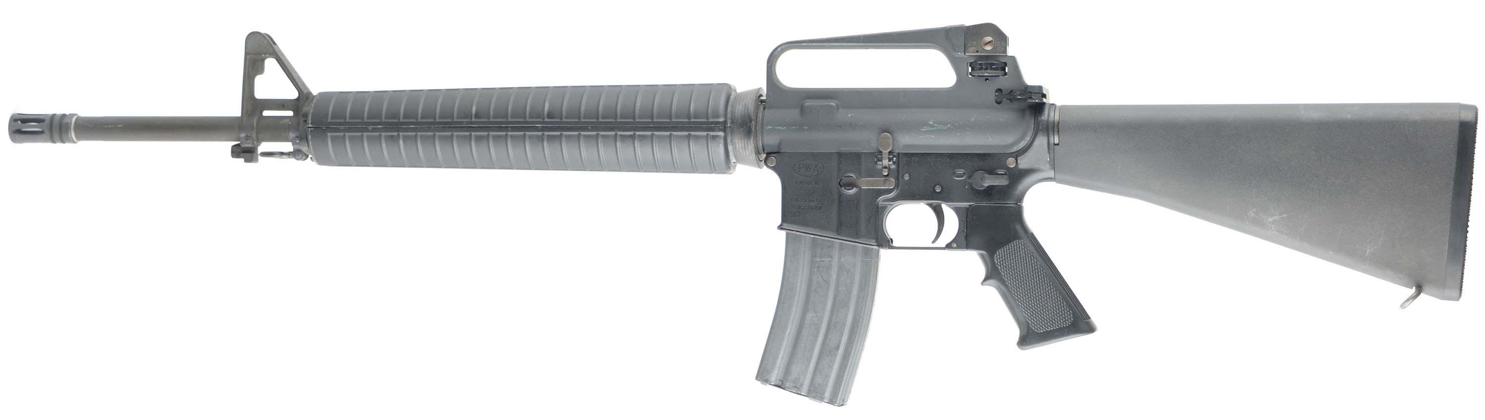 Pac-West Arms (PWA), Model: Commando (M16A2 configuration), Cal: 5.56 x 45mm, MFG: Early-Mid 1980s, S/N: 29680, Semi-auto rifle, 20'' barrel. The M16A2 style polymer buttstock, pistol grip & handguard rate very good to excellent with scuffs & scratches from use. More concentrated scuffs & scratches on bottom of pistol grip & the end of the handguard. The gray parkerized finish on the barrel & upper receiver rates 92% with scuffs, scratches, paint transferring scratches, & wear from use. The black paint finish on the lower receiver rates 95% with a few minor scuffs & scratches from use. The bolt release sends the bolt forward with any sharp jolt to the firearm. There is some light rust spots inside the chmaber & on some other steel compentes from being in stoarge without cleaning for a time. The bore is excellent, its bright & shiny with minor wear from light use. The rifle holds the standard M16A2 sights with a elevation adjustable post front sight with protective ears on the gas block. The receiver carries a M16A2 fixed carry handle with a fully adjustable aperture rear sight. The buttstock has a checkered black plastic buttplate with a trapdoor for cleaning supplies, nothing inside the trapdoor. Rifle has both bottom sling loops, has the bayonet lug, & comes with one aluminum 30 Rd. magazine. FFL Req. - Value: 1000 to 2000