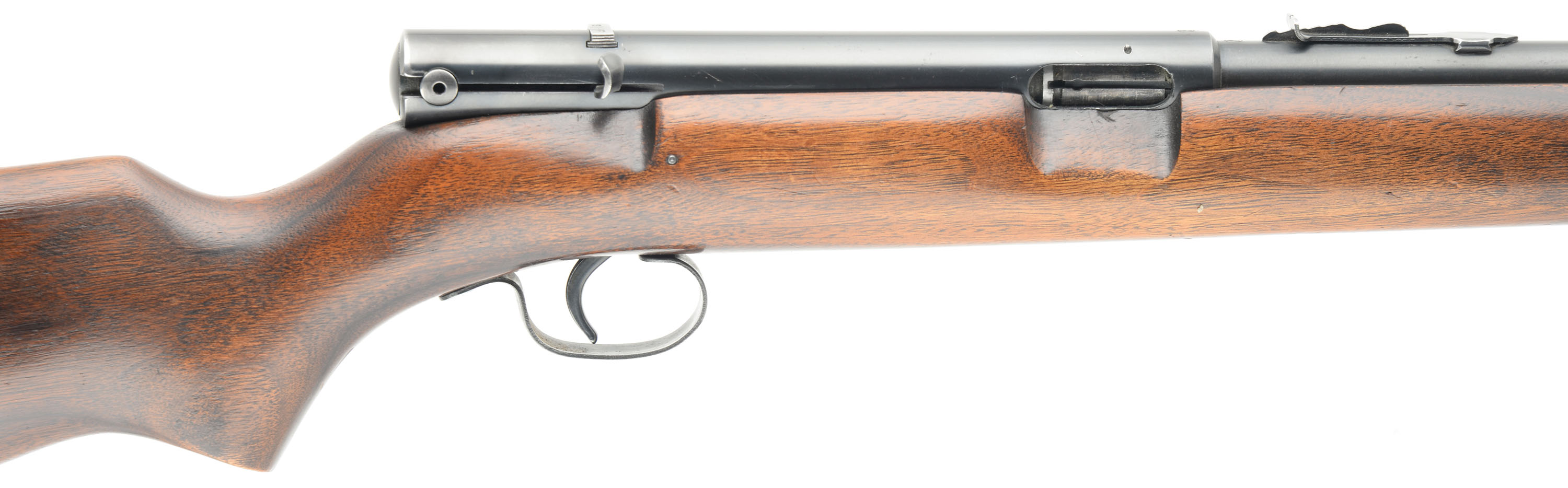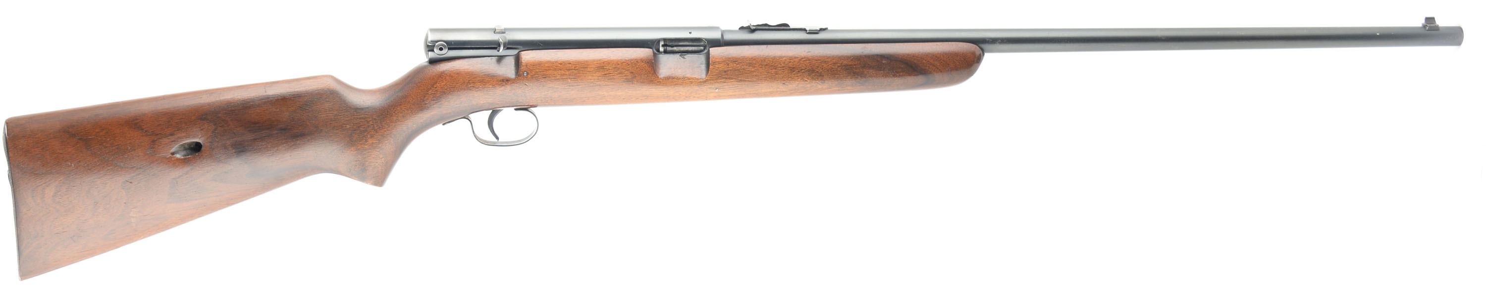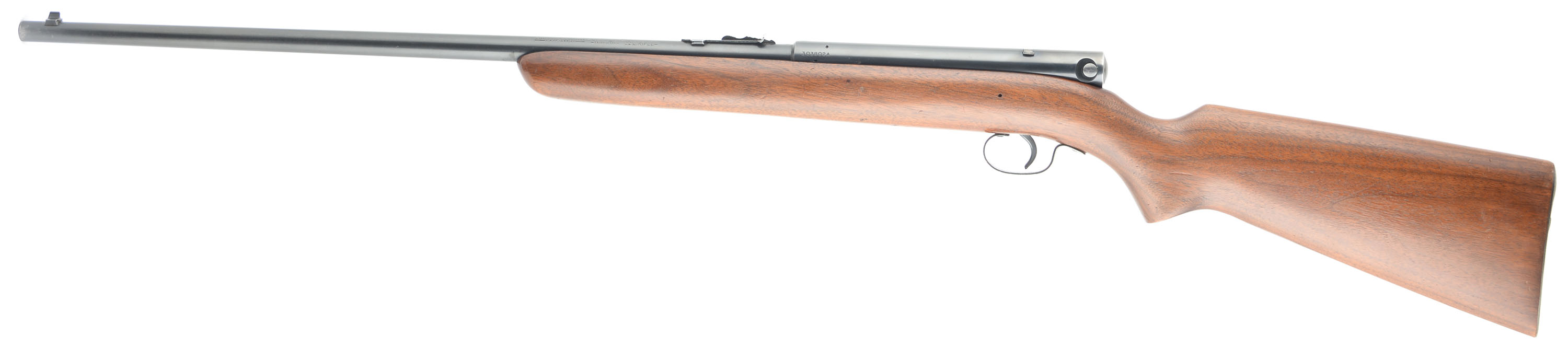 Winchester, Model 74, Marked .22 LONG RIFLE, MFG. 1952, SN: 303802A, Semi-Auto Rifle, 22'' Tapered round barrel, The original American straight grain walnut & pistol grip stock is excellent. The stock has several minor scrapes & contusions to the original finish, which shows some thinning to the forend. The original metal blue finish rates 90% overall. Bore is excellent. Fitted with an adjustable rear sight & small blade front sight. The unusual receiver mounted safety functions by sliding it side to side within a dovetail channel. FFL or C&R Req - Value: 300 to 500